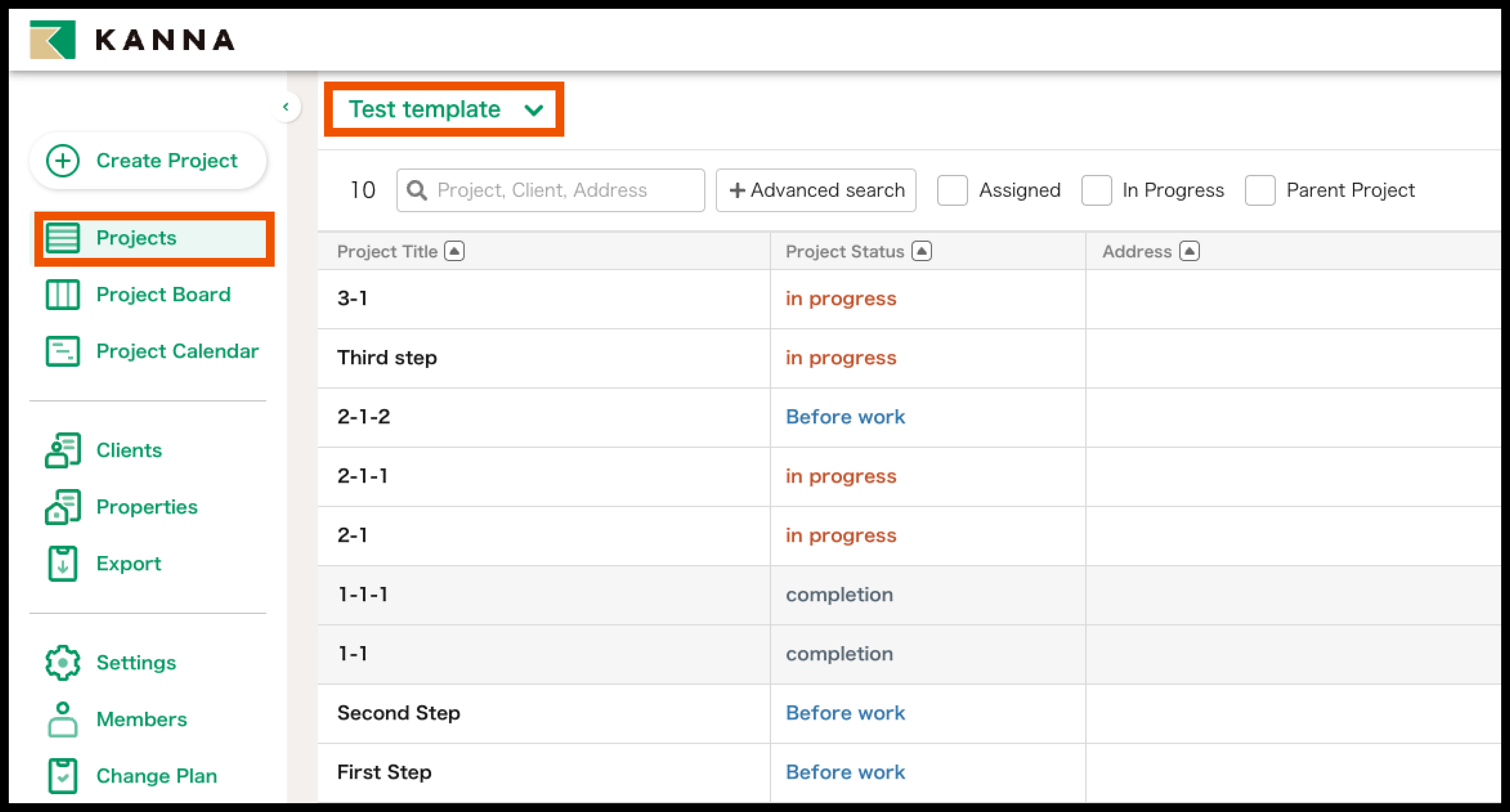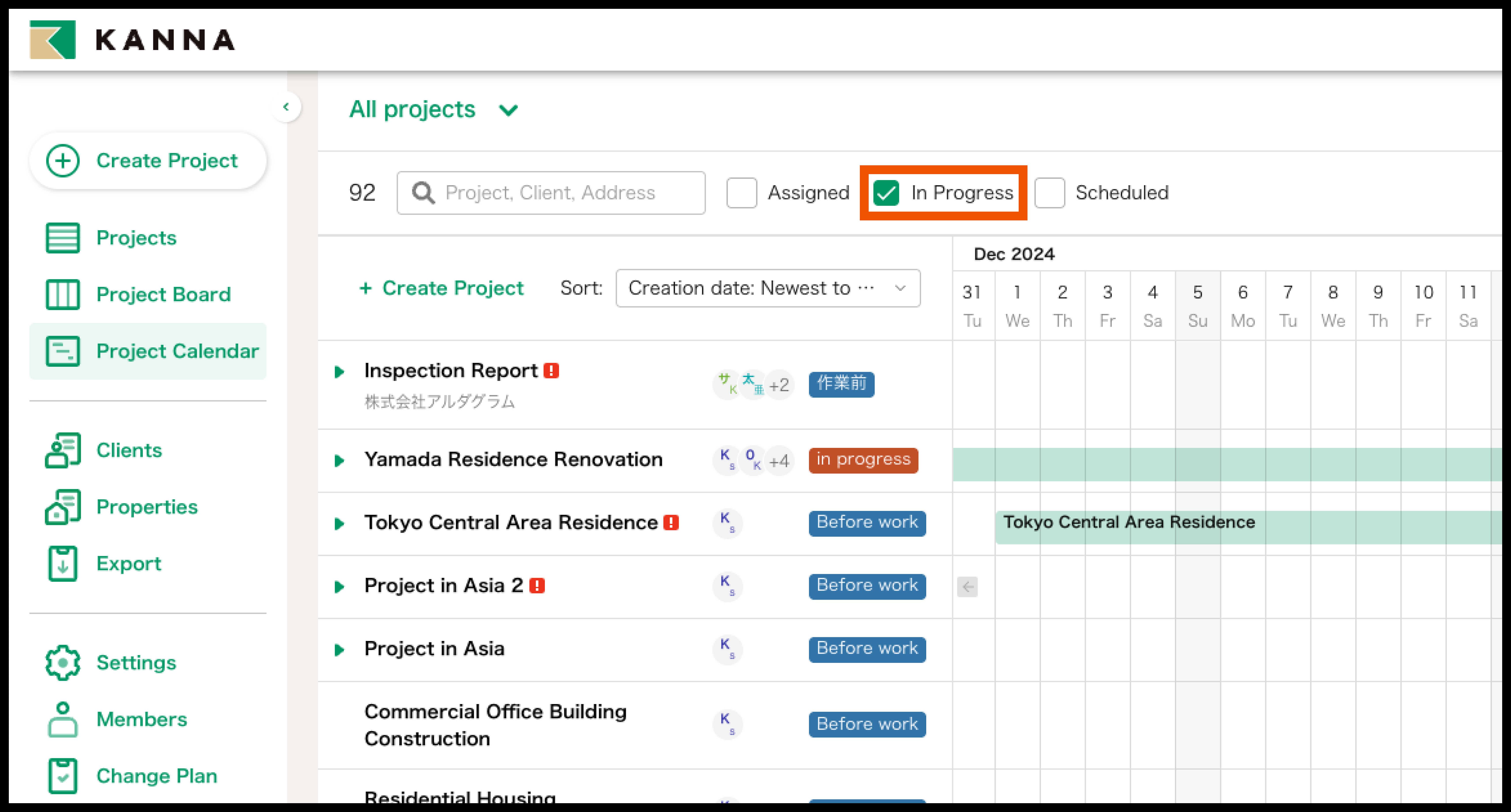 Selecting【In Progress】displays only Projects where the Projects flow has not been completed.