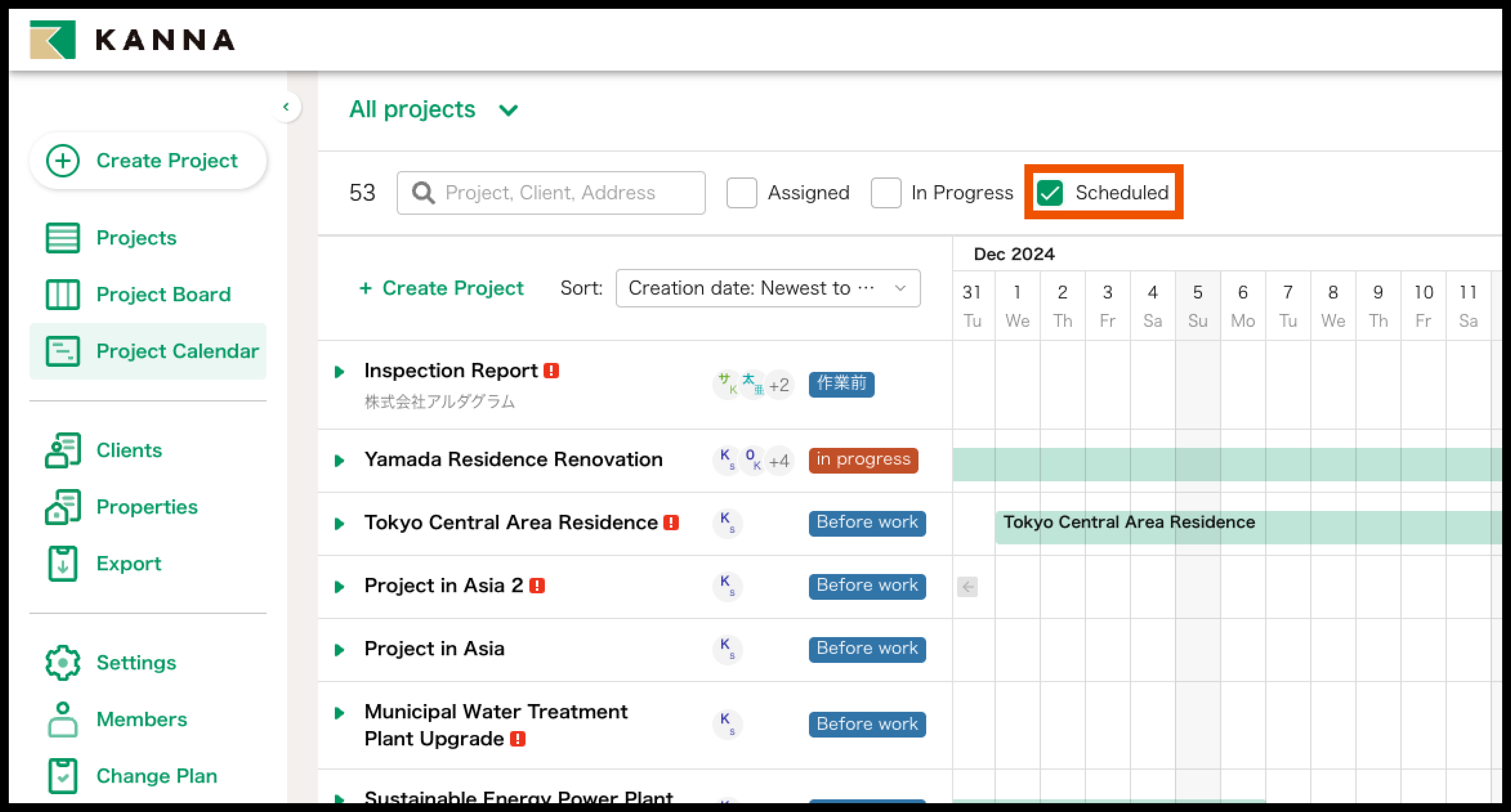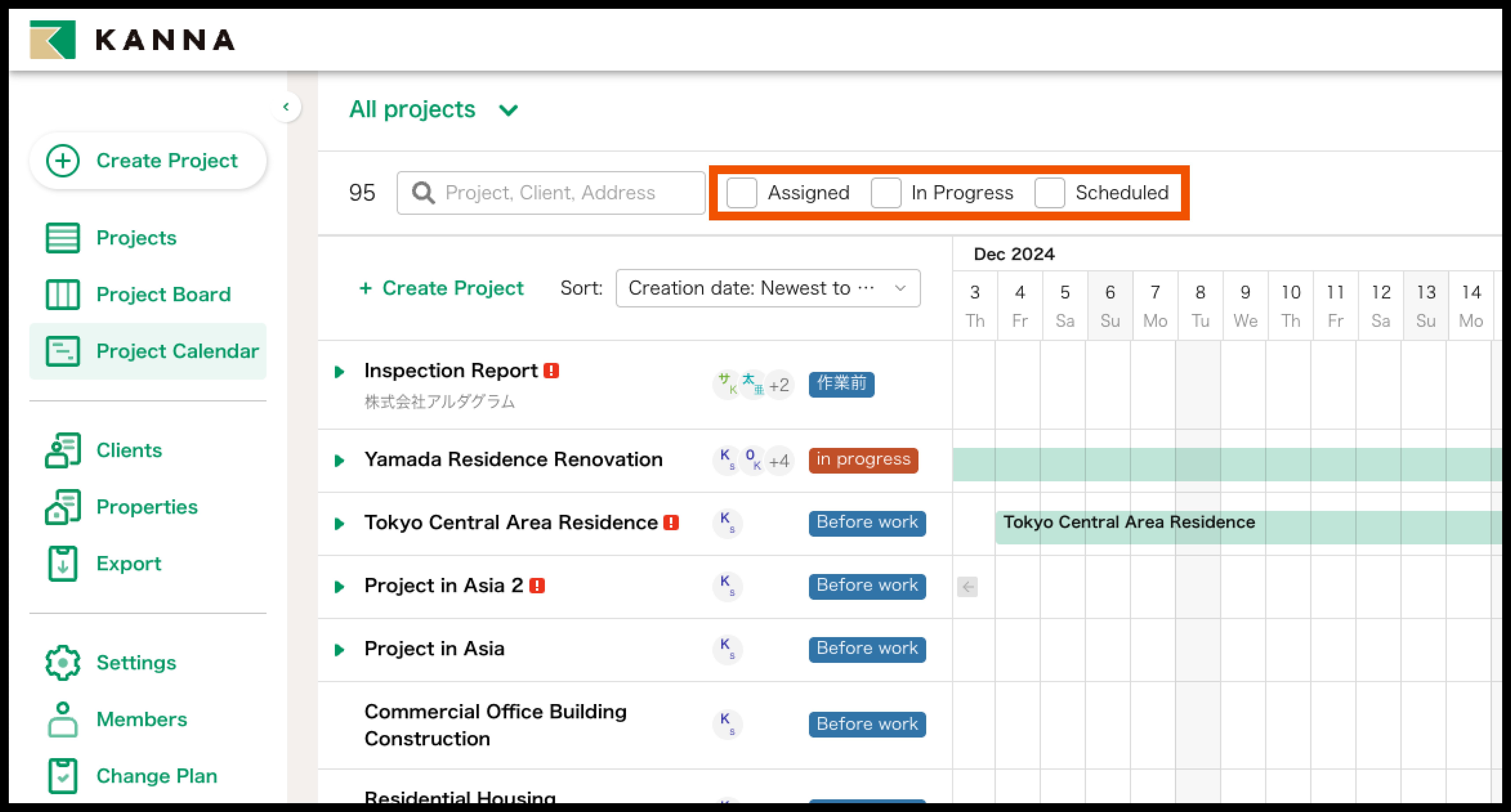 Selecting【With Date Settings】displays only Projects with a set start date and end date.