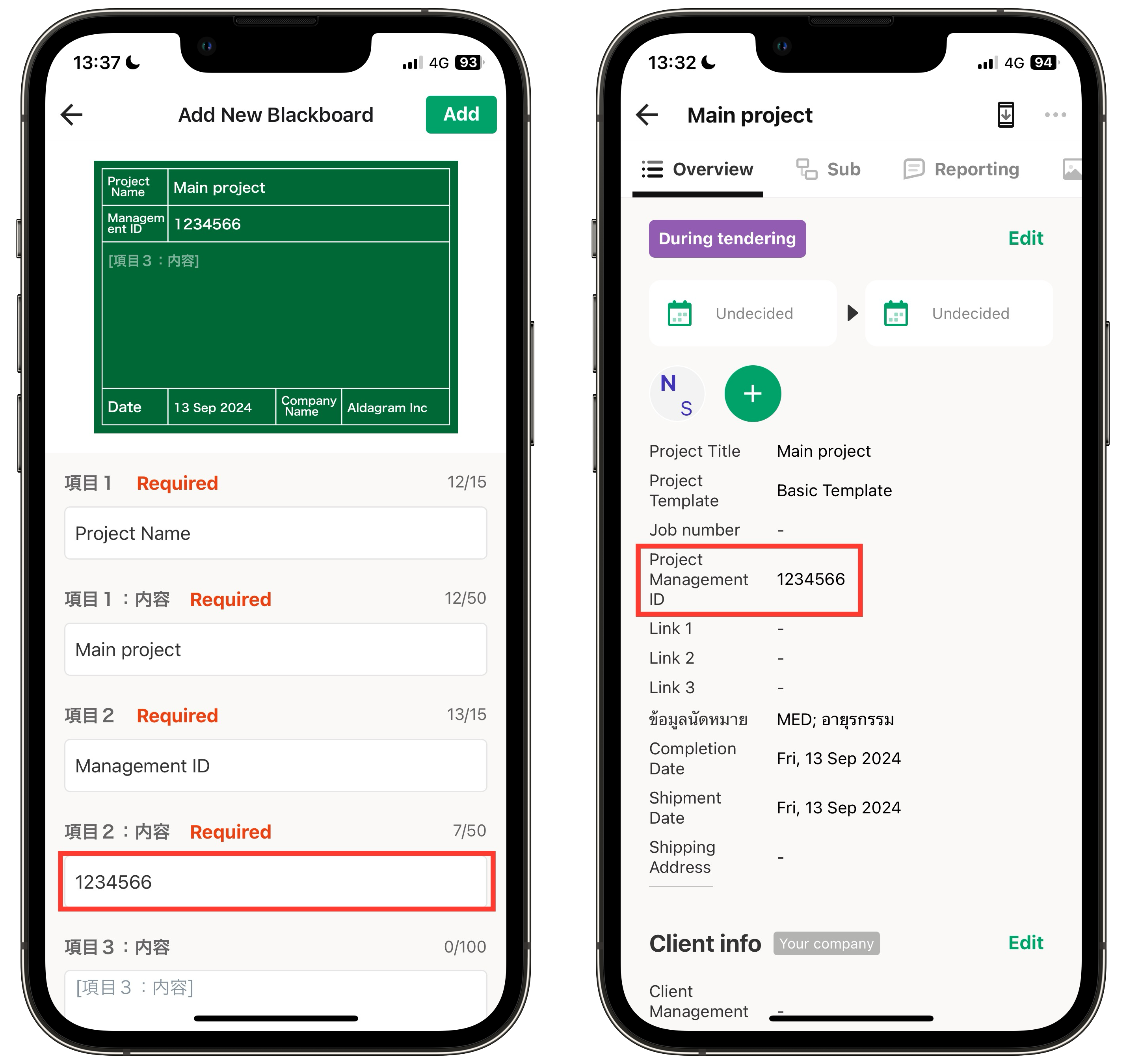 In this case, the "Project Management ID" from the project overview (left) will be automatically entered into the blackboard (right).