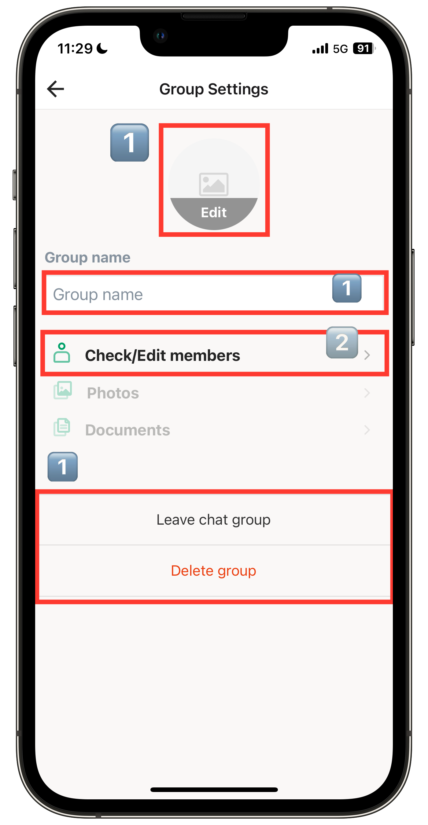 You can edit the group icon image/group name, leave the group, or delete the group.