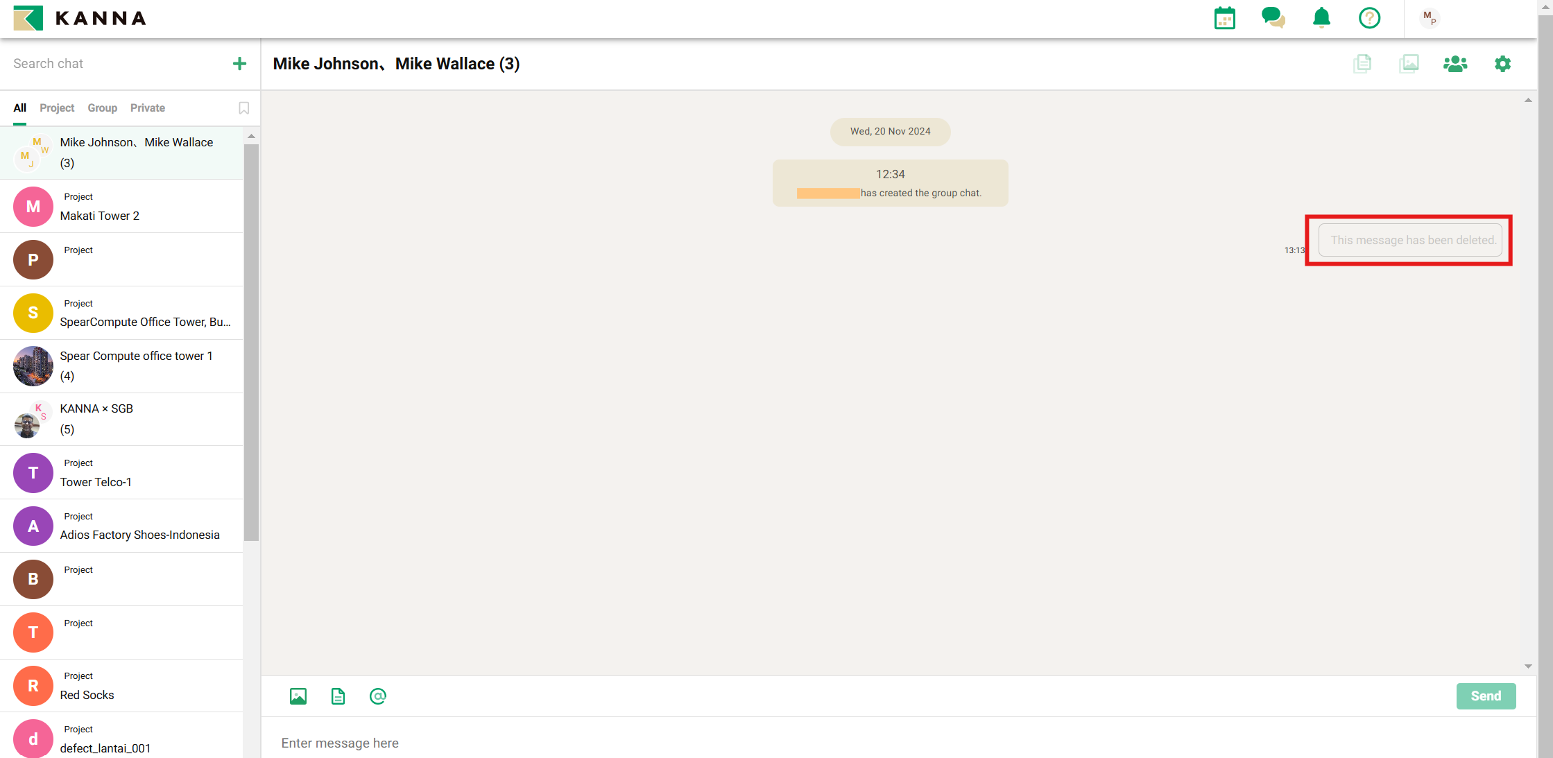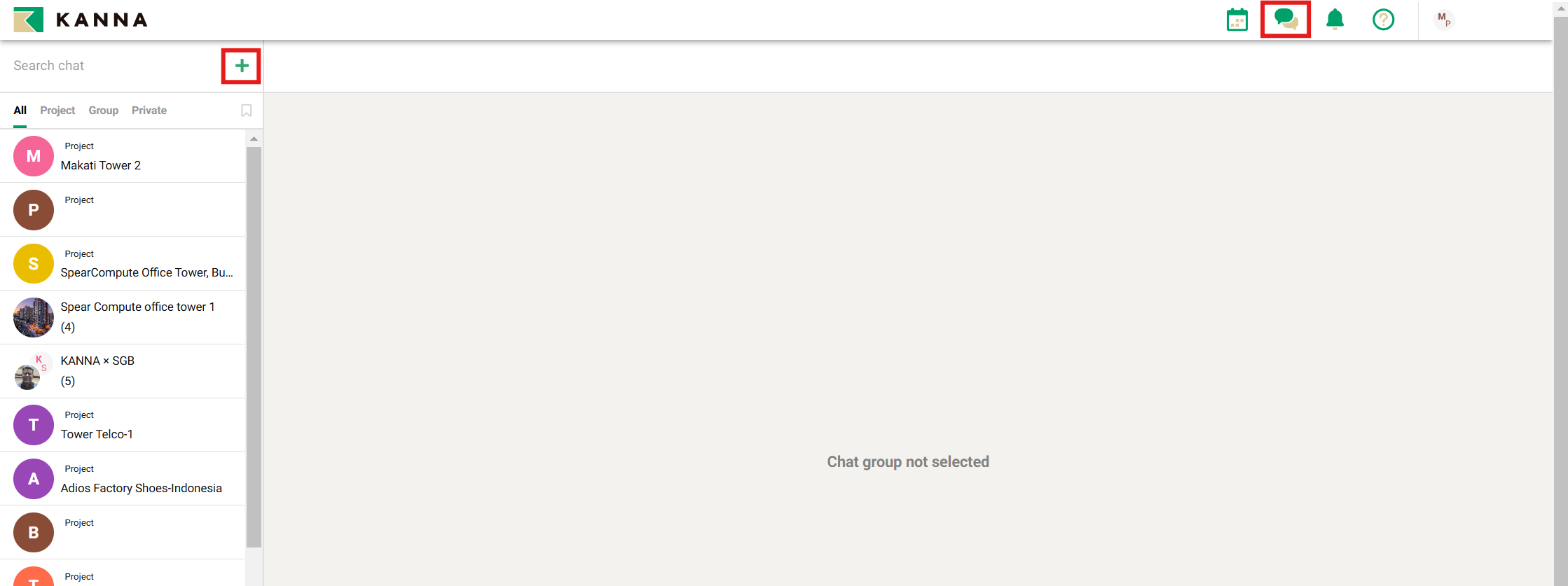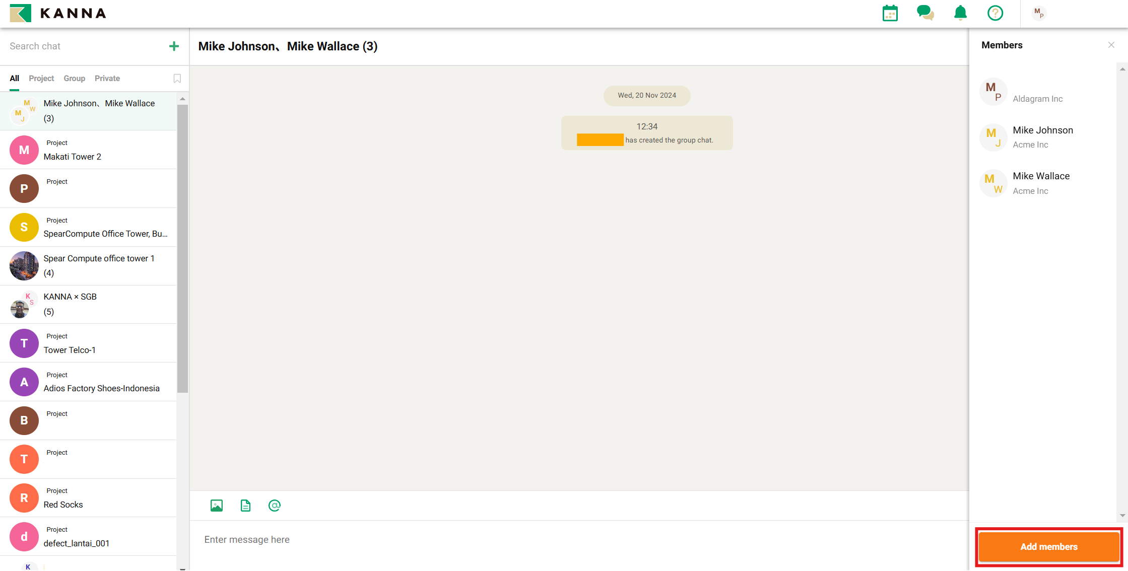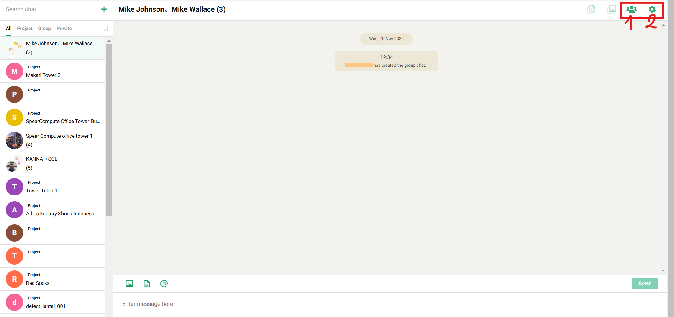 You can create a group chat by selecting from your own or other company's members, so if you want to chat in a group separate from the project, please use this feature.