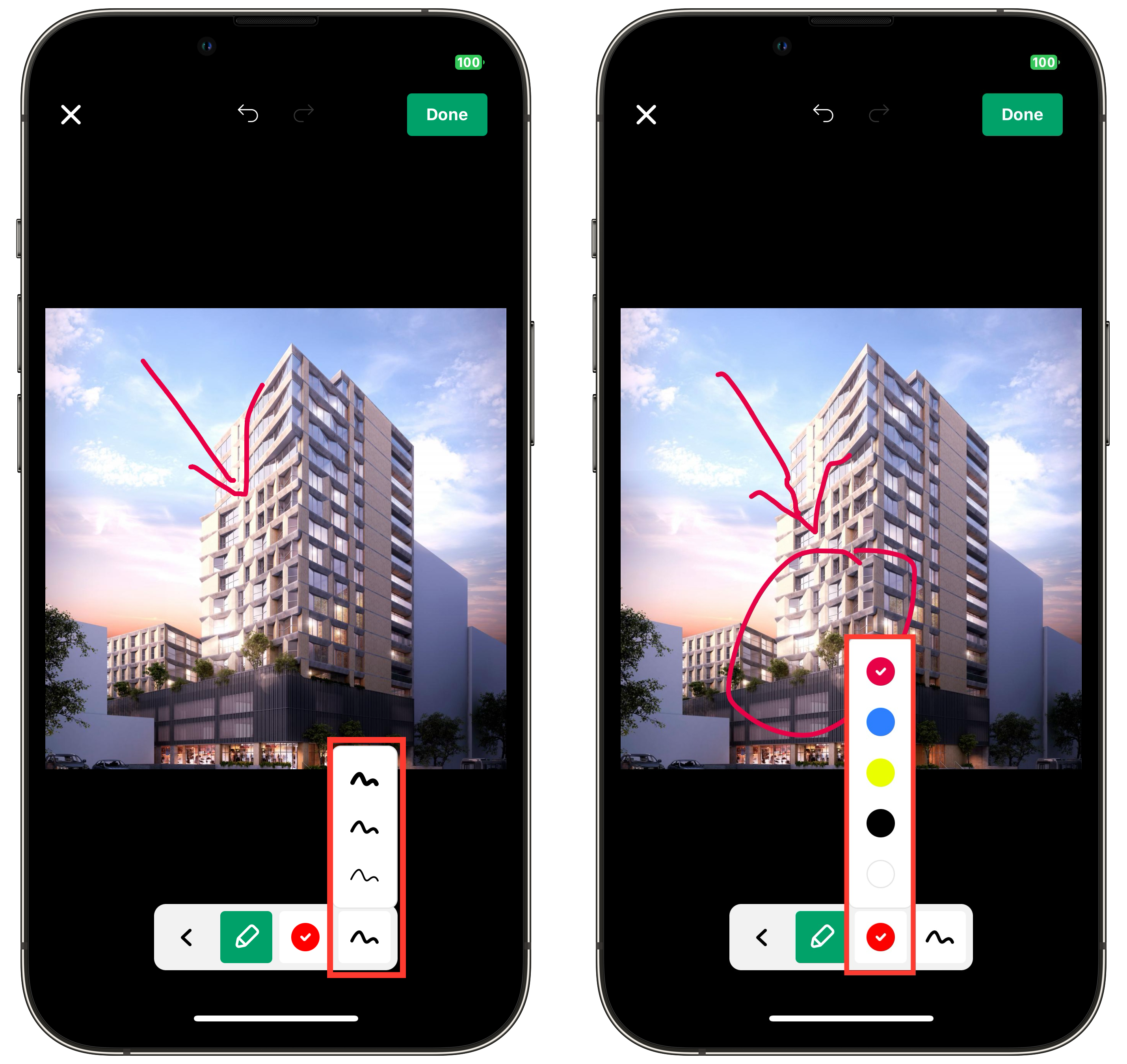 You can write on the photo by hand. In handwriting mode, you can change the thickness and color of the lines.