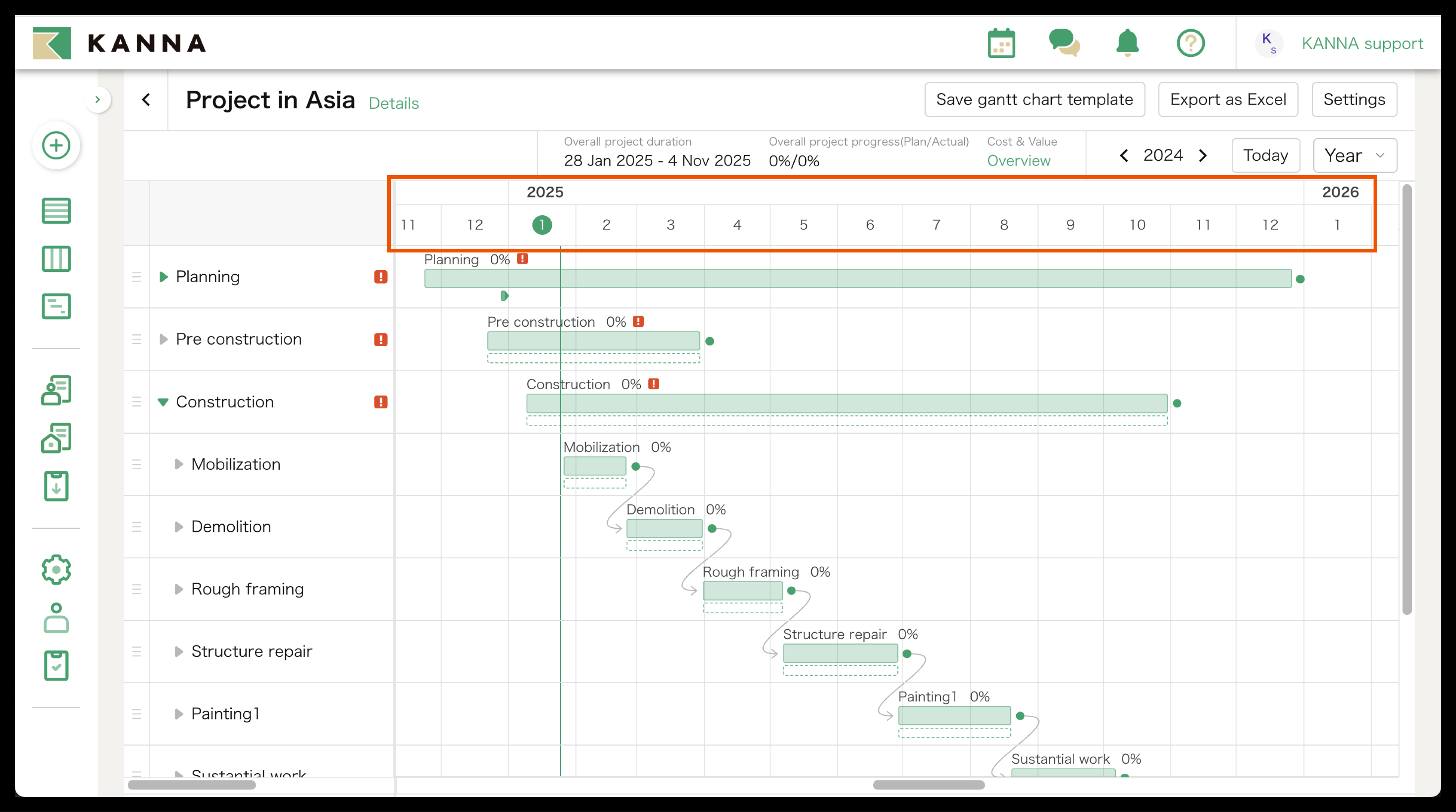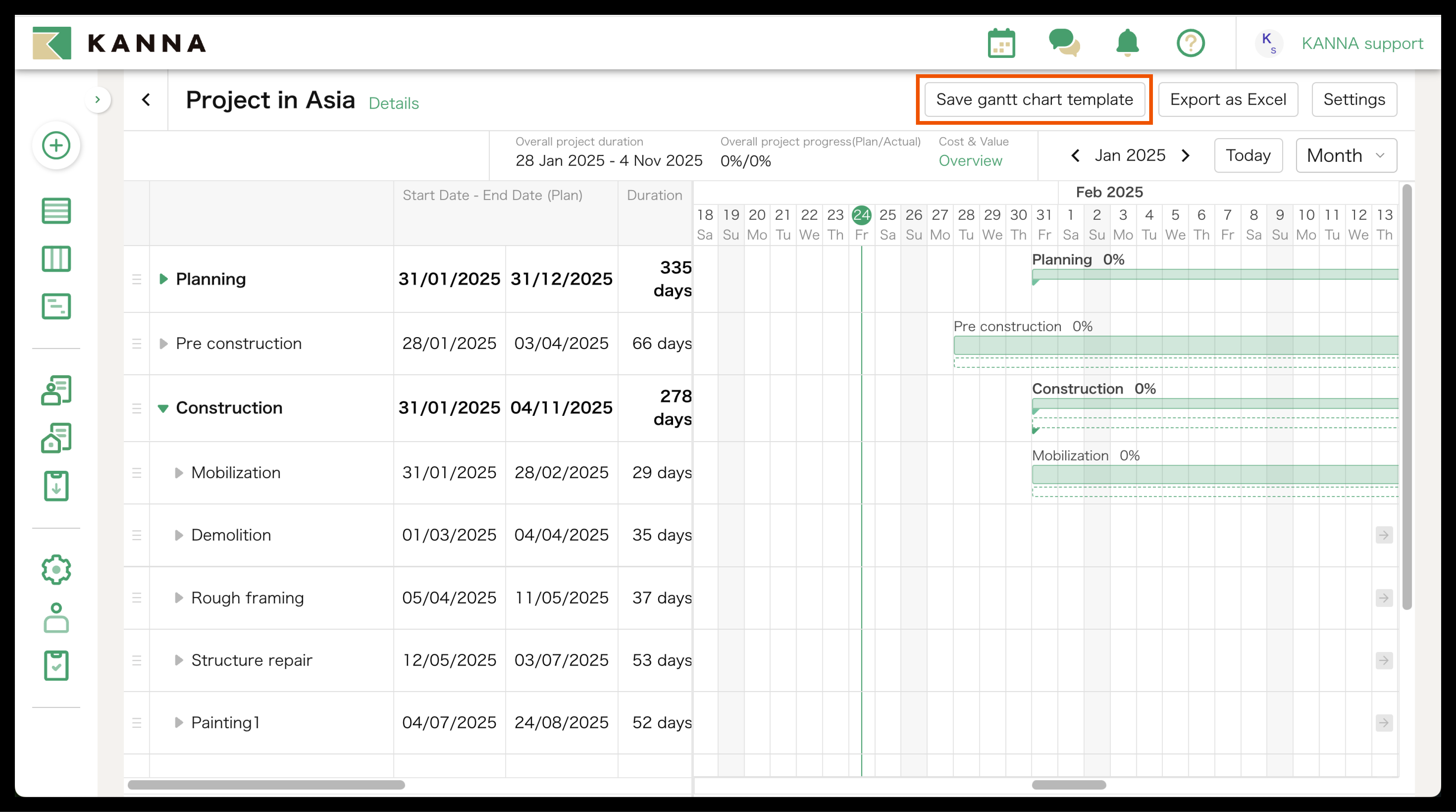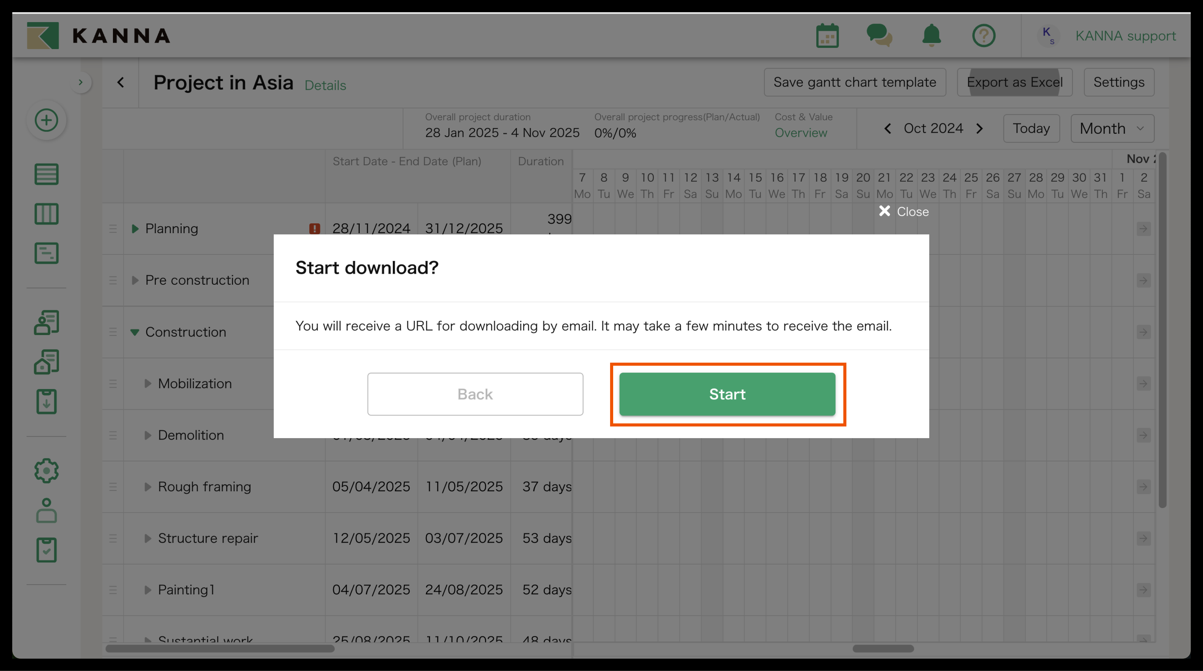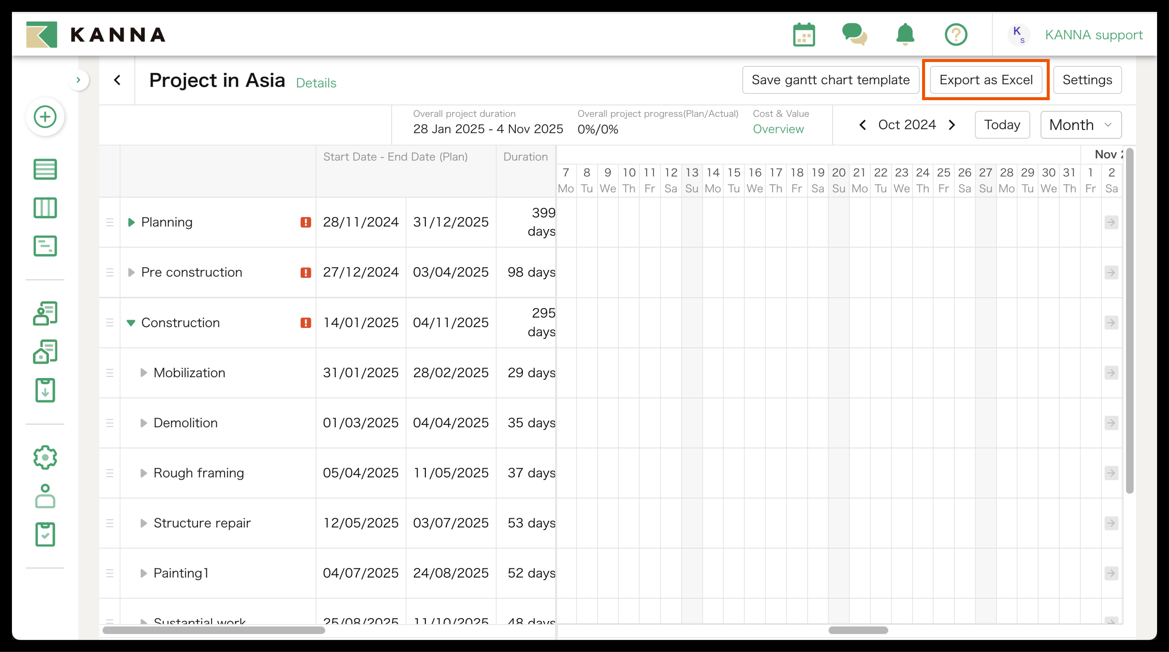 You can export the Gantt Chart on KANNA as an Excel file by clicking "Export as Excel" on the top right side of the screen.