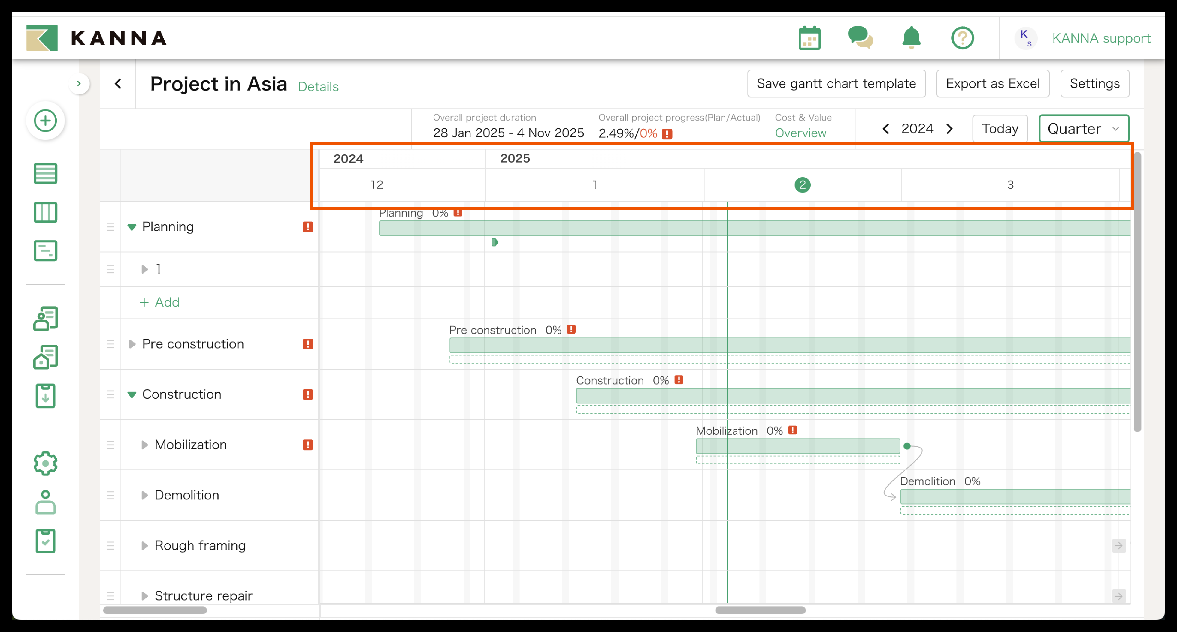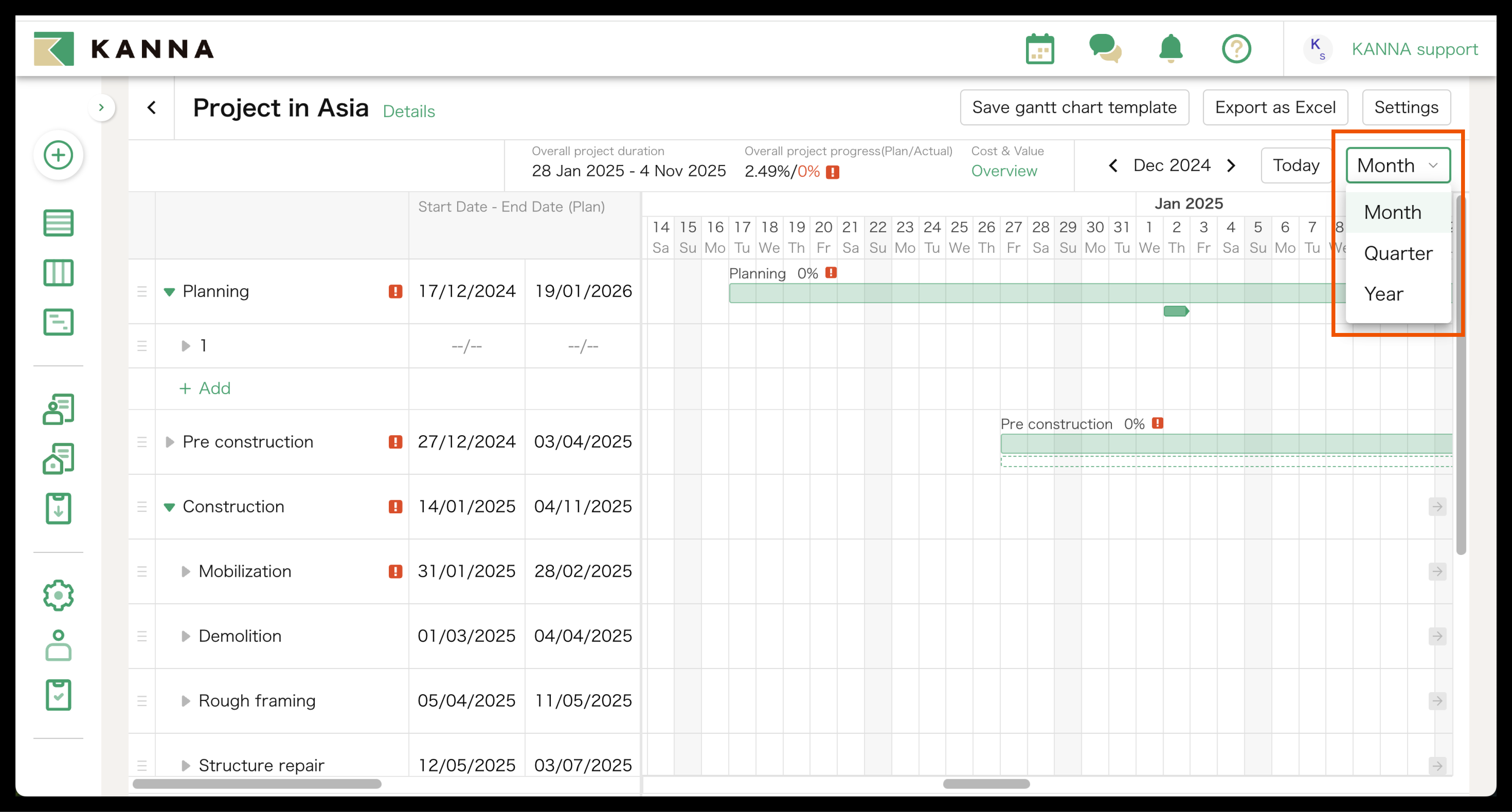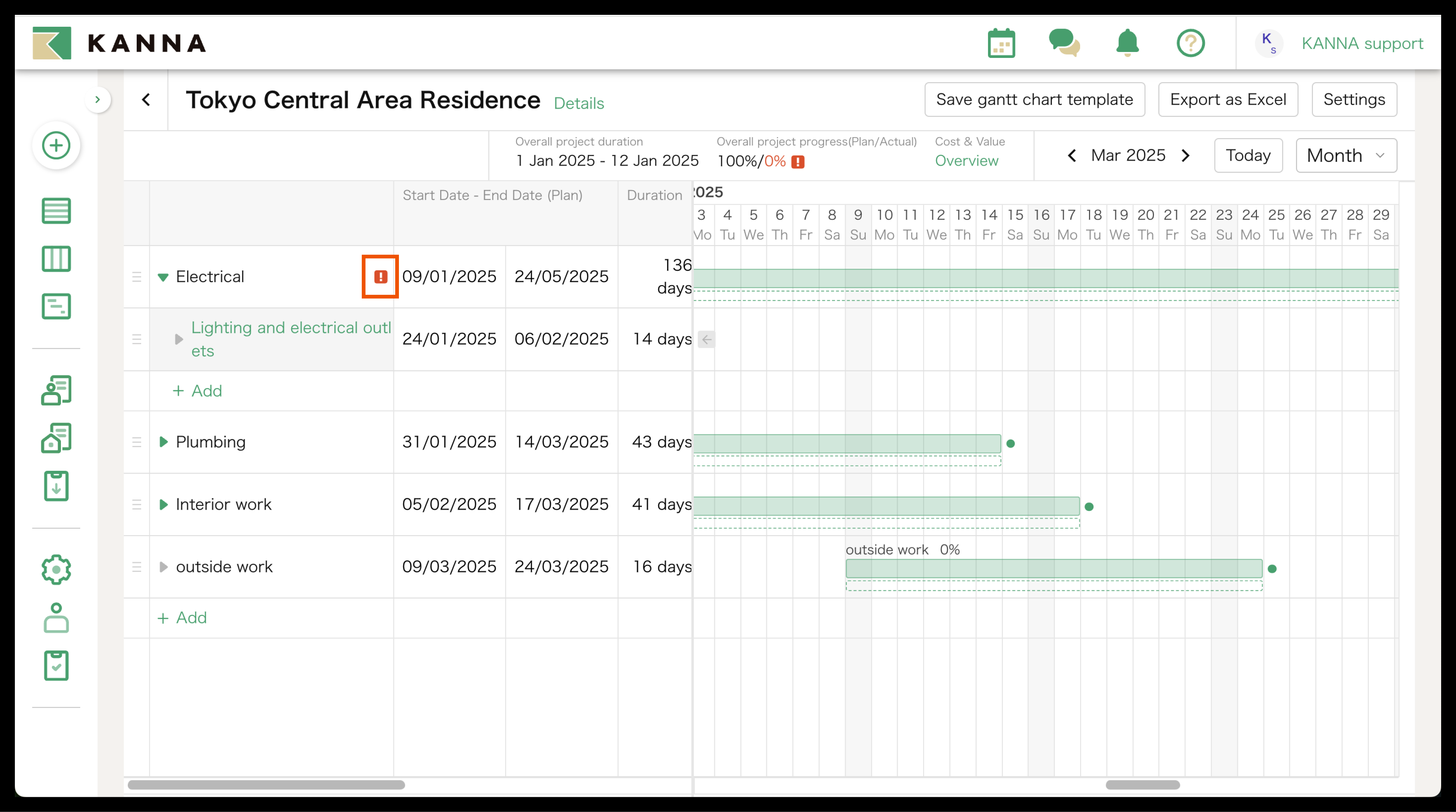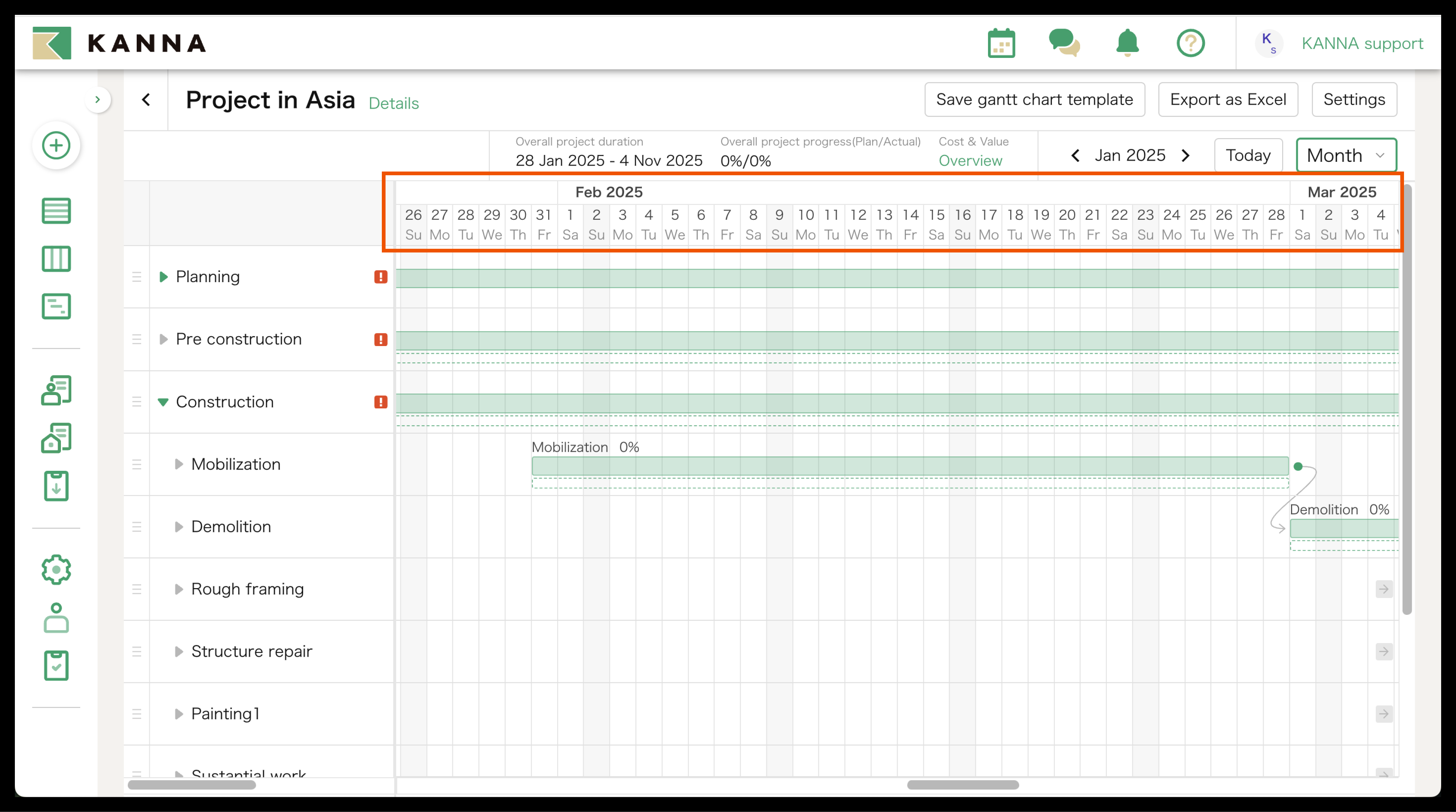You can export the Gantt Chart on KANNA as an Excel file by clicking "Export as Excel" on the top right side of the screen.