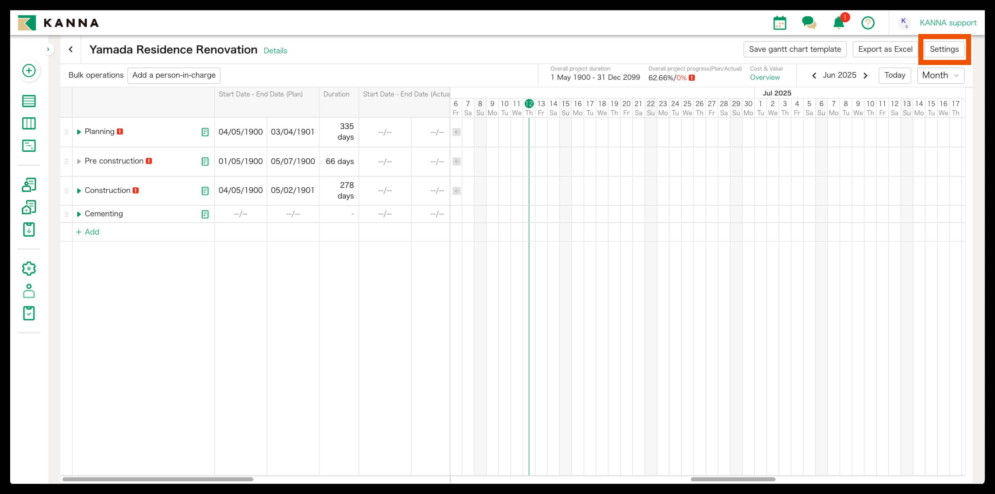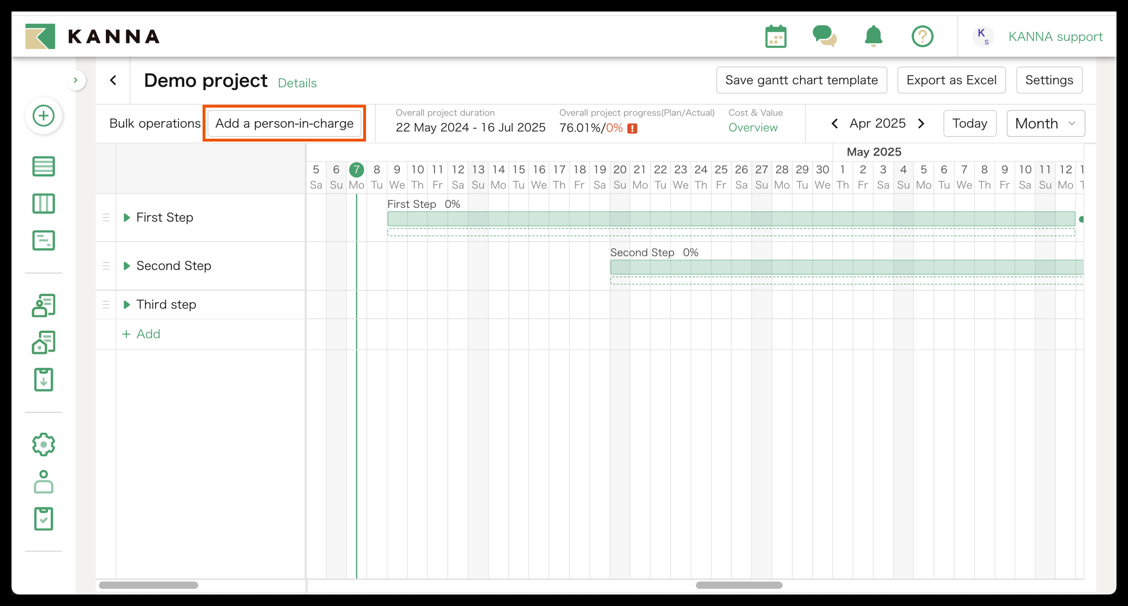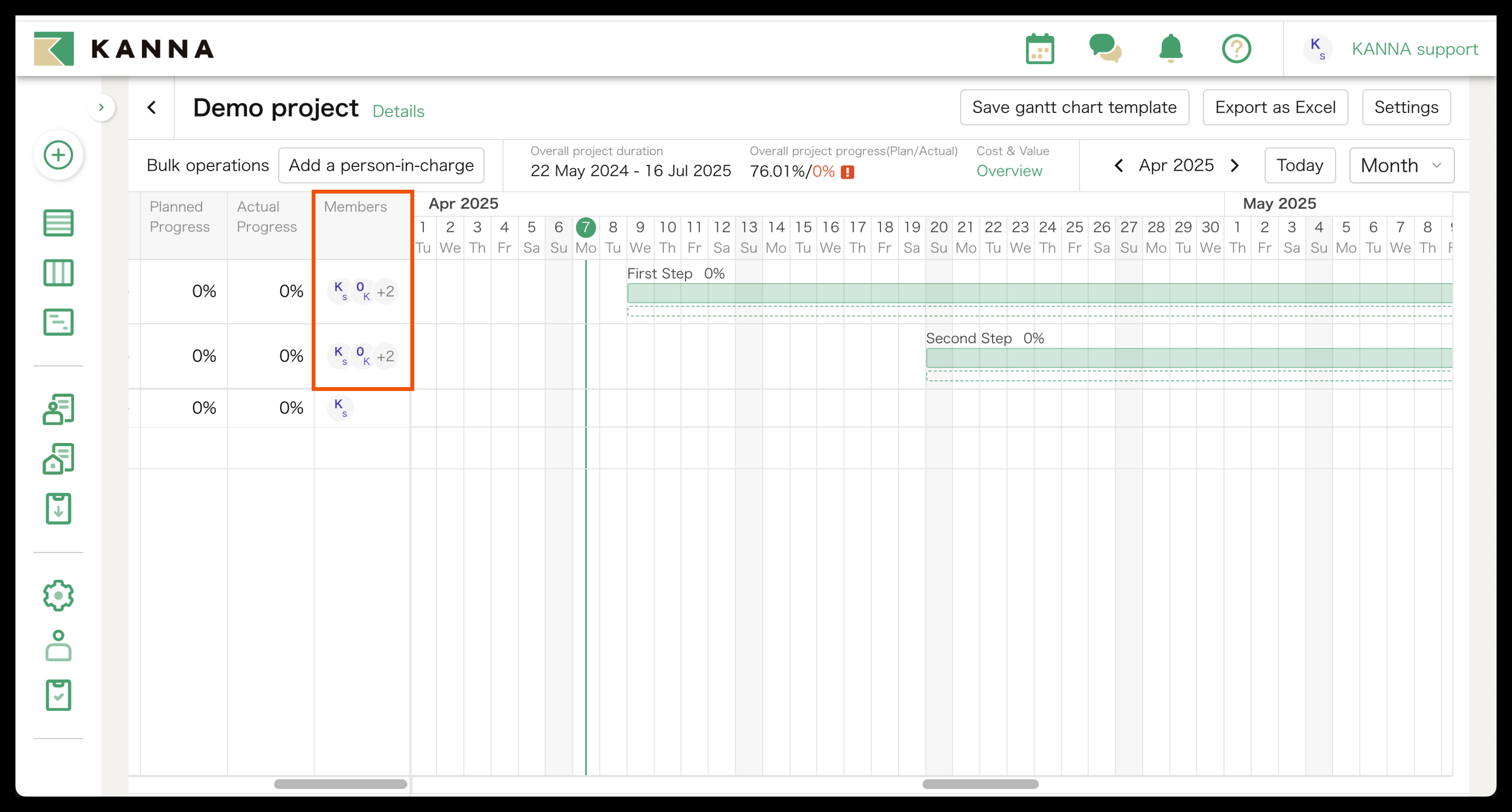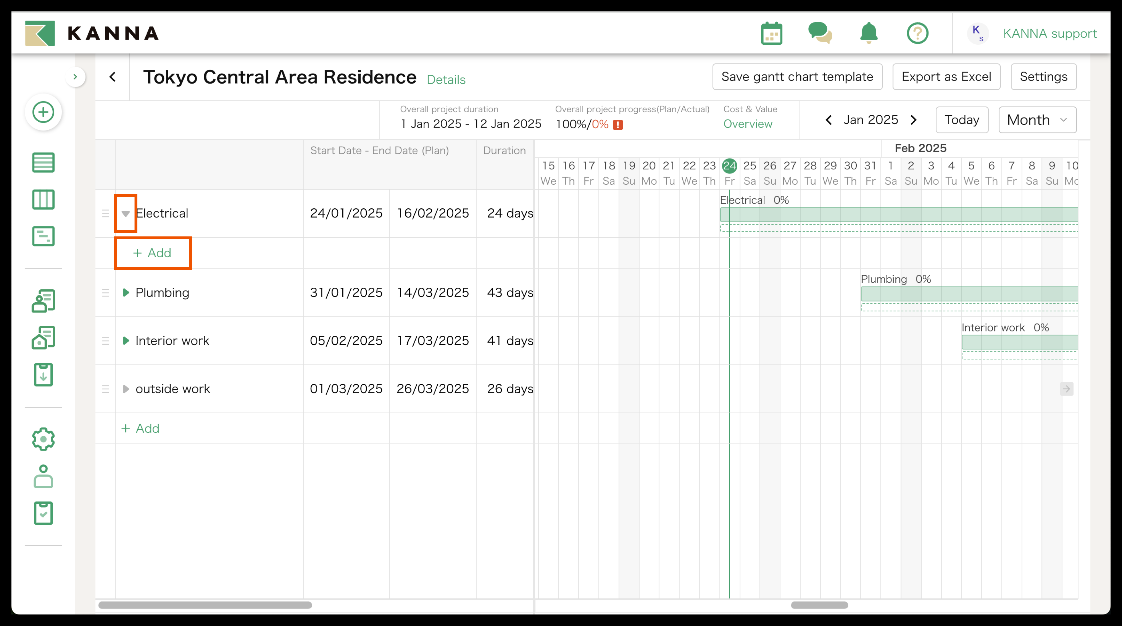 You can export the Gantt Chart on KANNA as an Excel file by clicking "Export as Excel" on the top right side of the screen.
