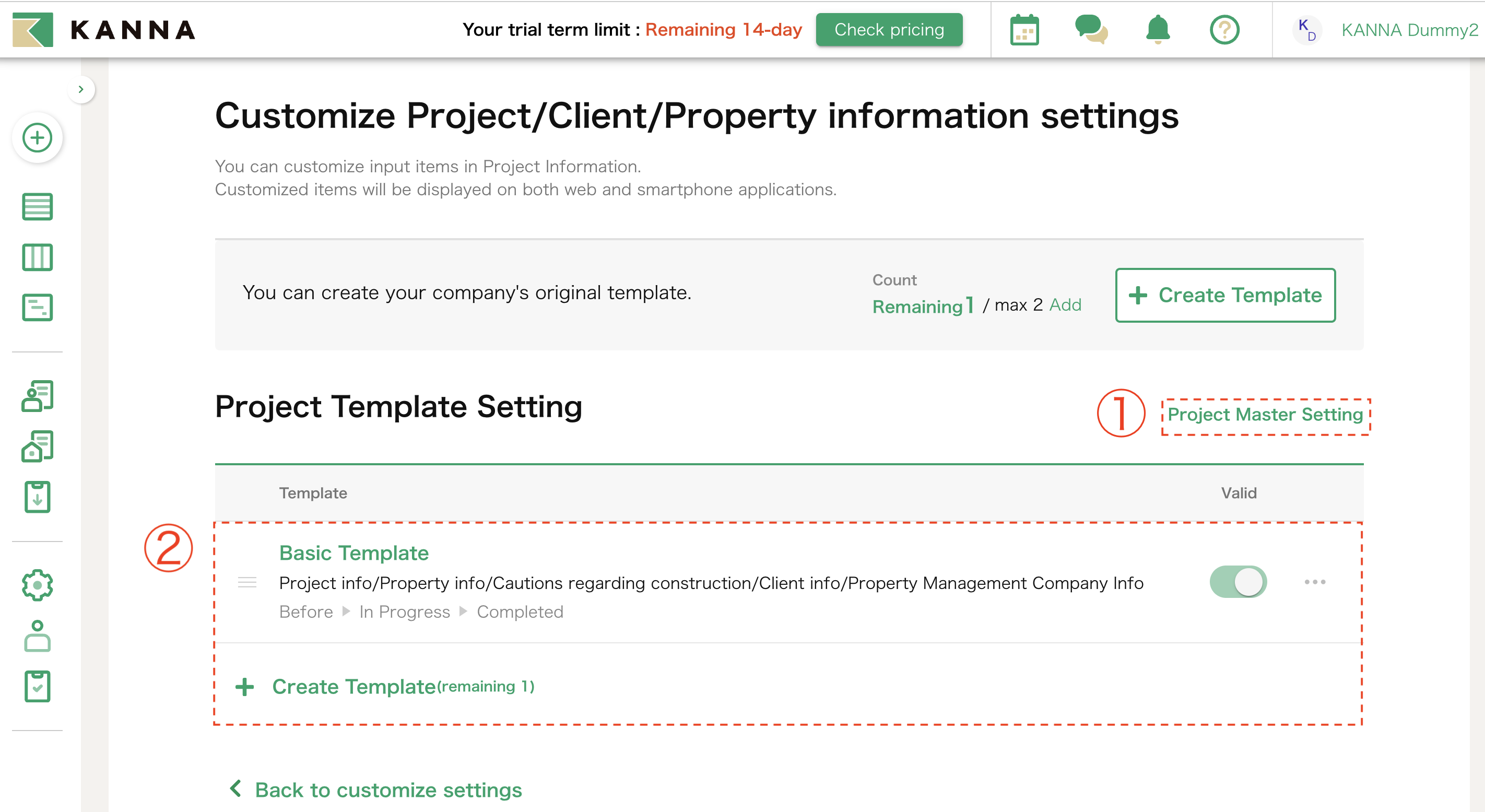 Customization screen for "master information" and "project template"