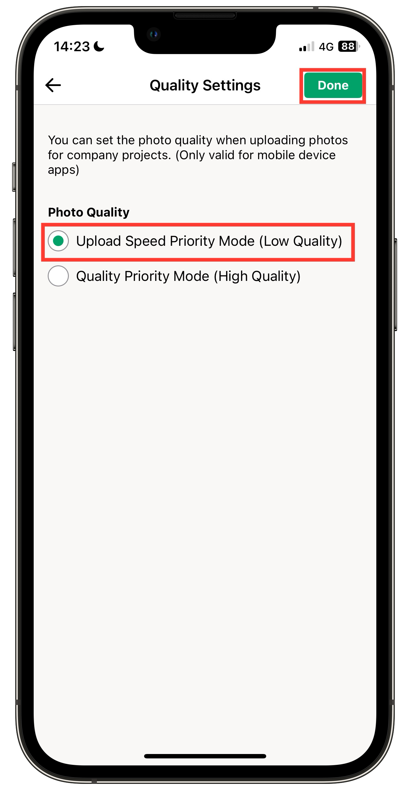 2. Select [Upload Speed Priority Mode (Low Quality)] and tap [Done]