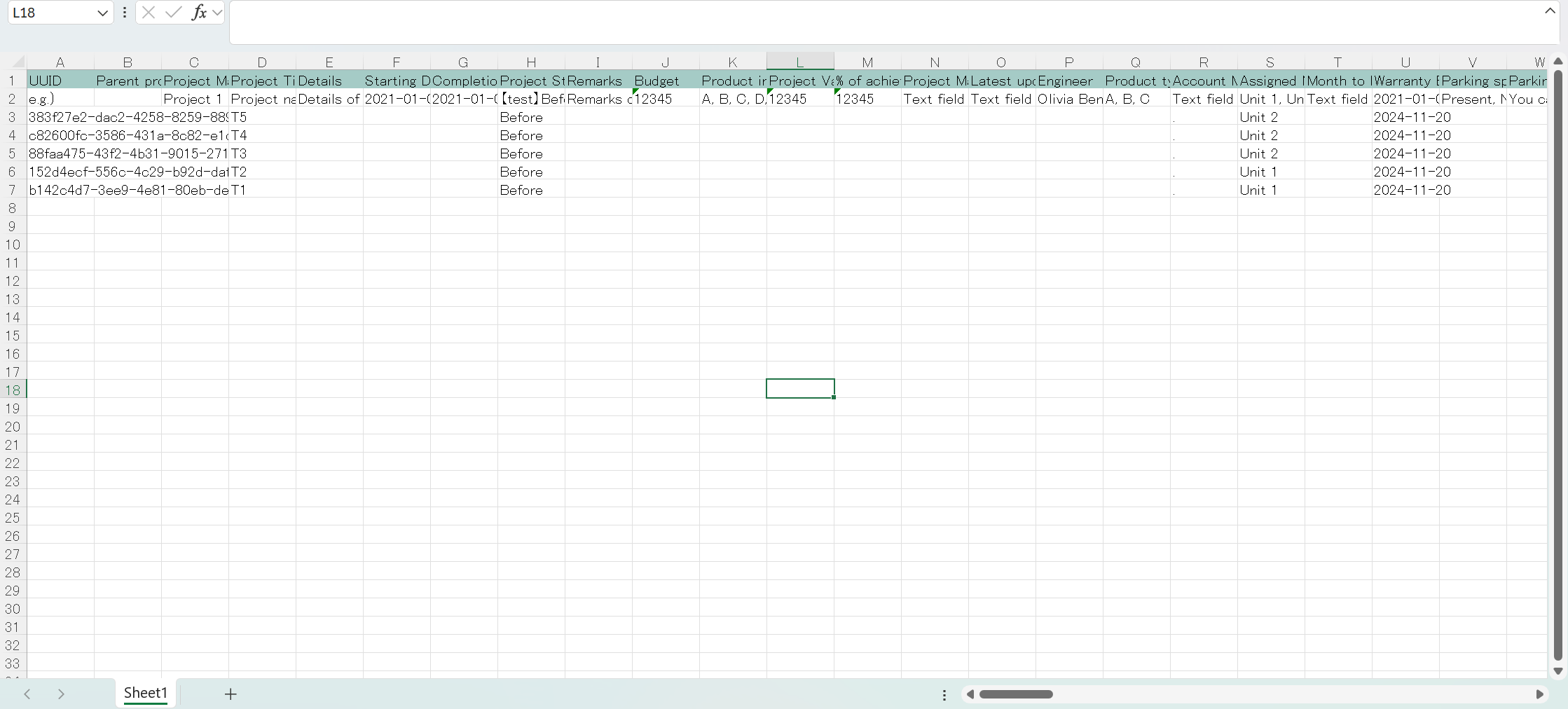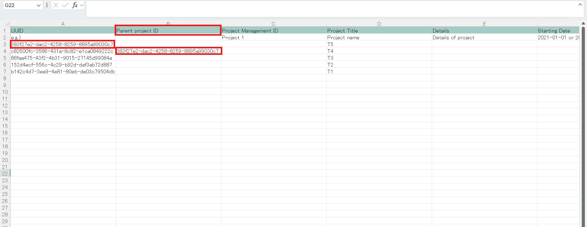 4. In the [Parent project ID] column for the project you want to make a child project (sub-project), enter the project ID ("UUID") of the project you want to assign as the parent project.