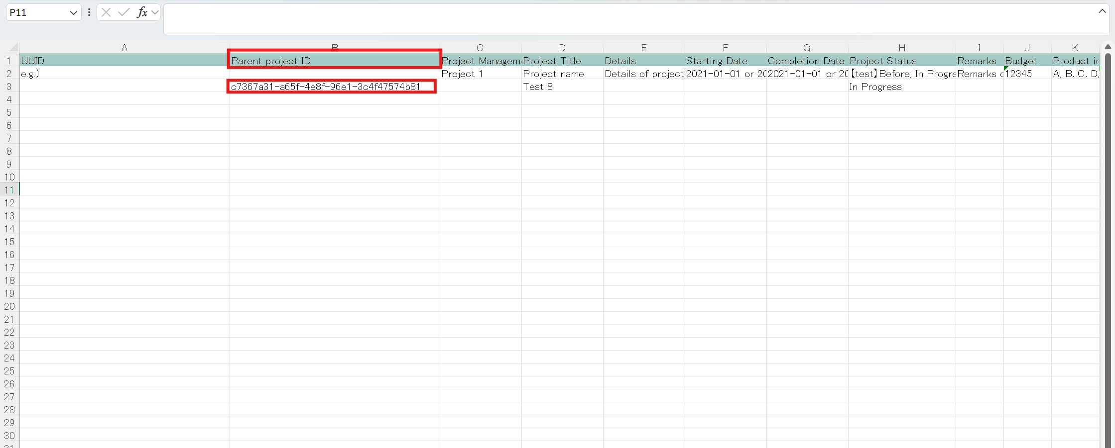 4. Open the Excel file, paste the copied project ID (UUID) from step 2 into the Parent Project ID field in row 3, fill in the required fields, and save the file.