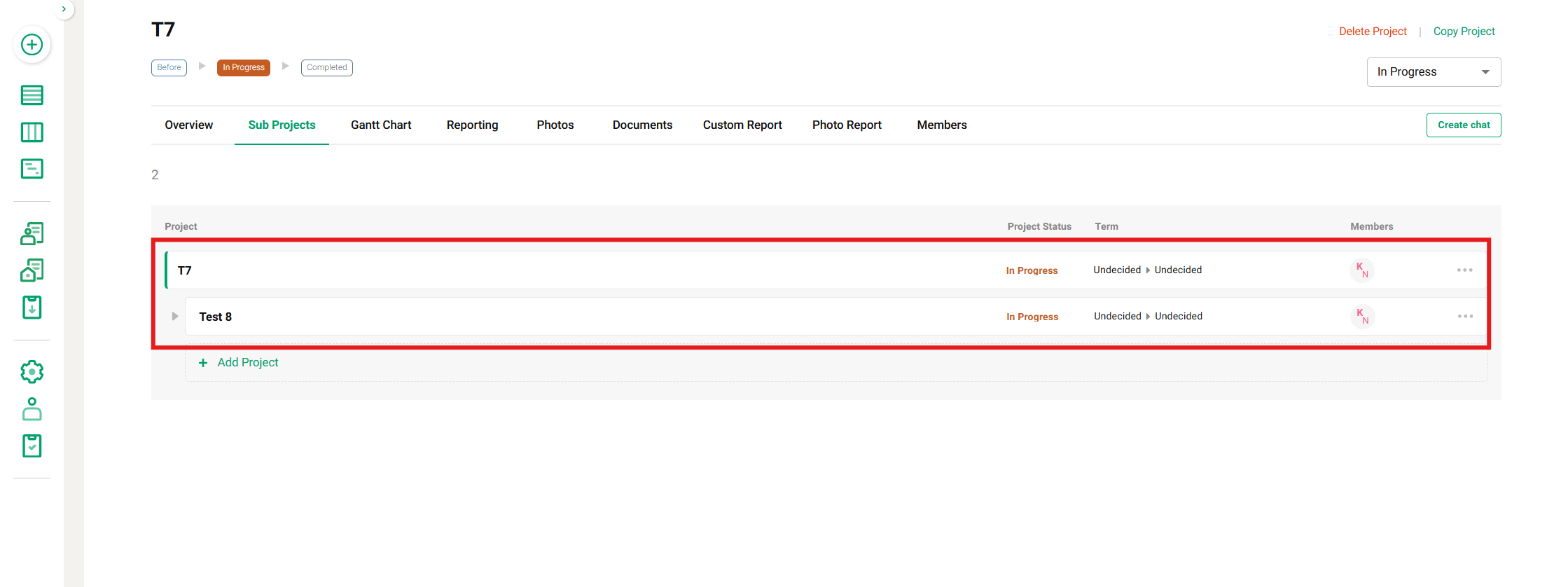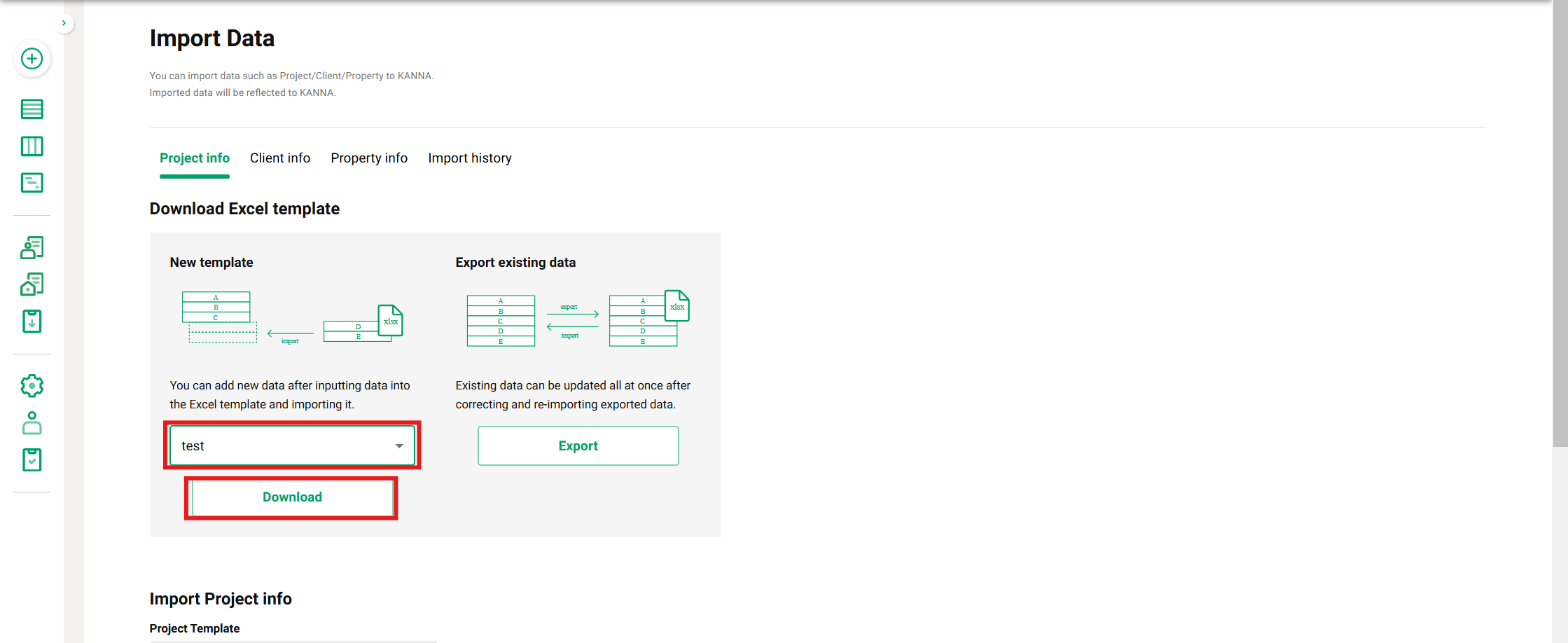 1. Search for the data of the project you want to set as the parent project and click Export.