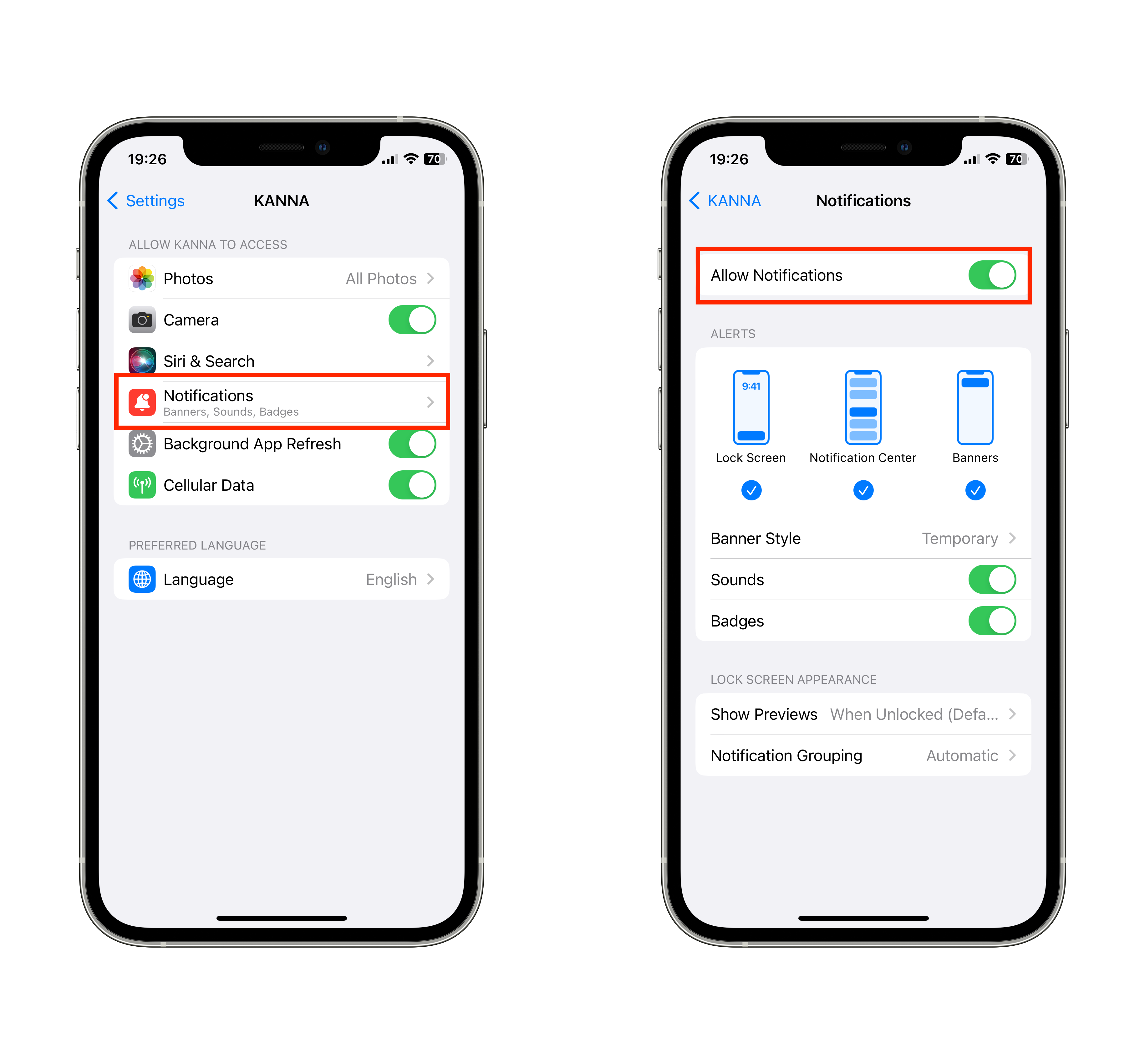 If you do not receive notifications, you may not have configured your smartphone settings or the notification settings in the KANNA app.