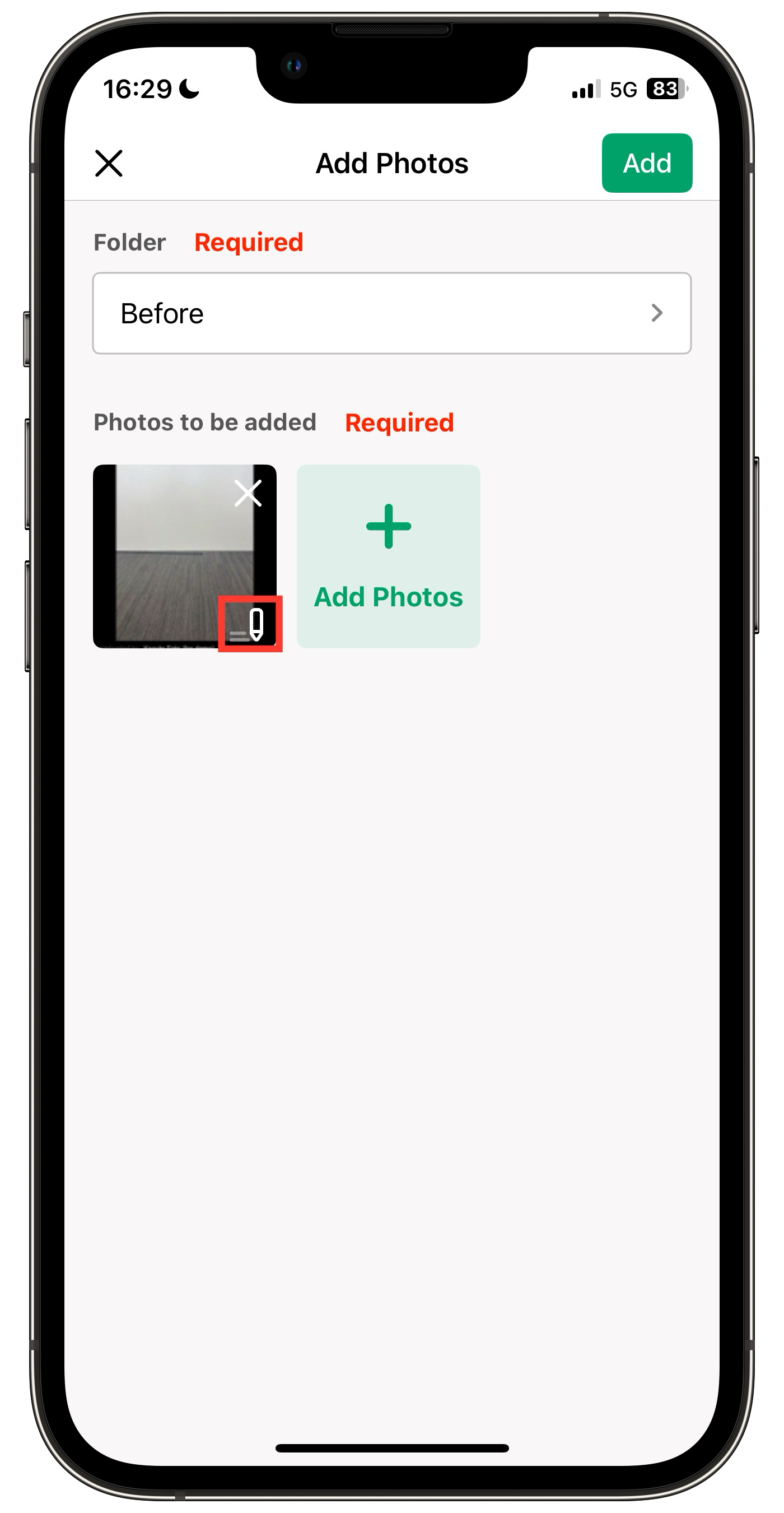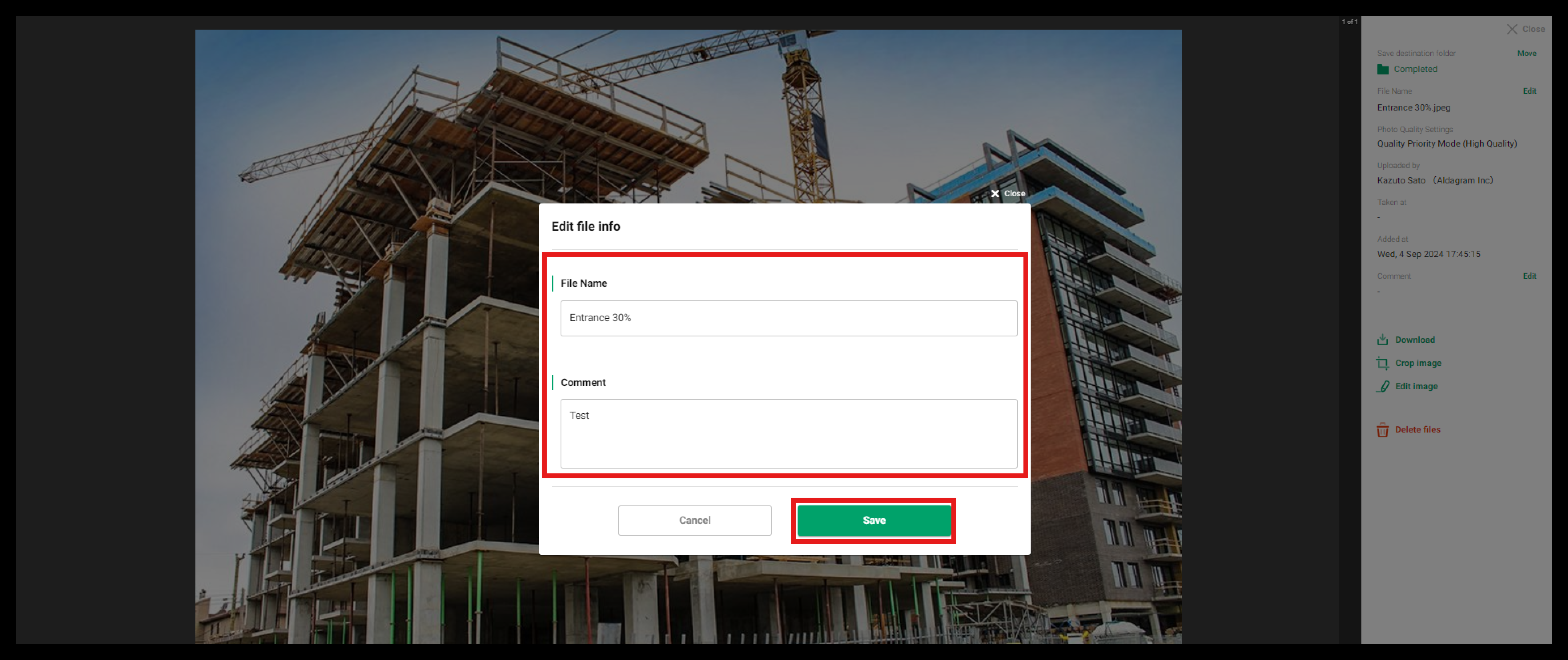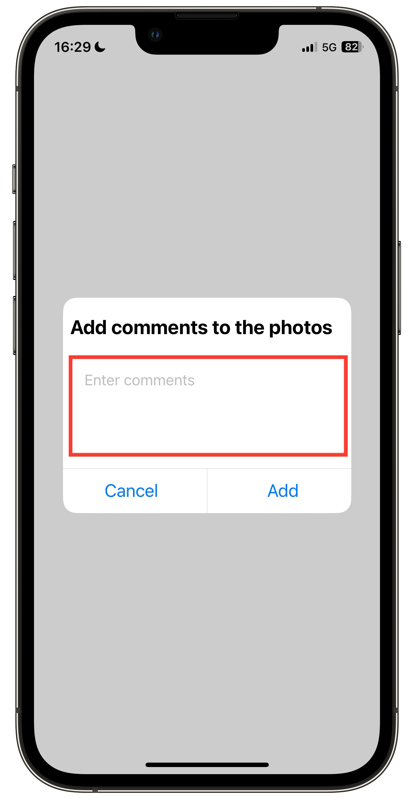 Once the comment has been added, select the destination folder as you would for a regular photo, then tap [Add] in the top right corner to complete the save.