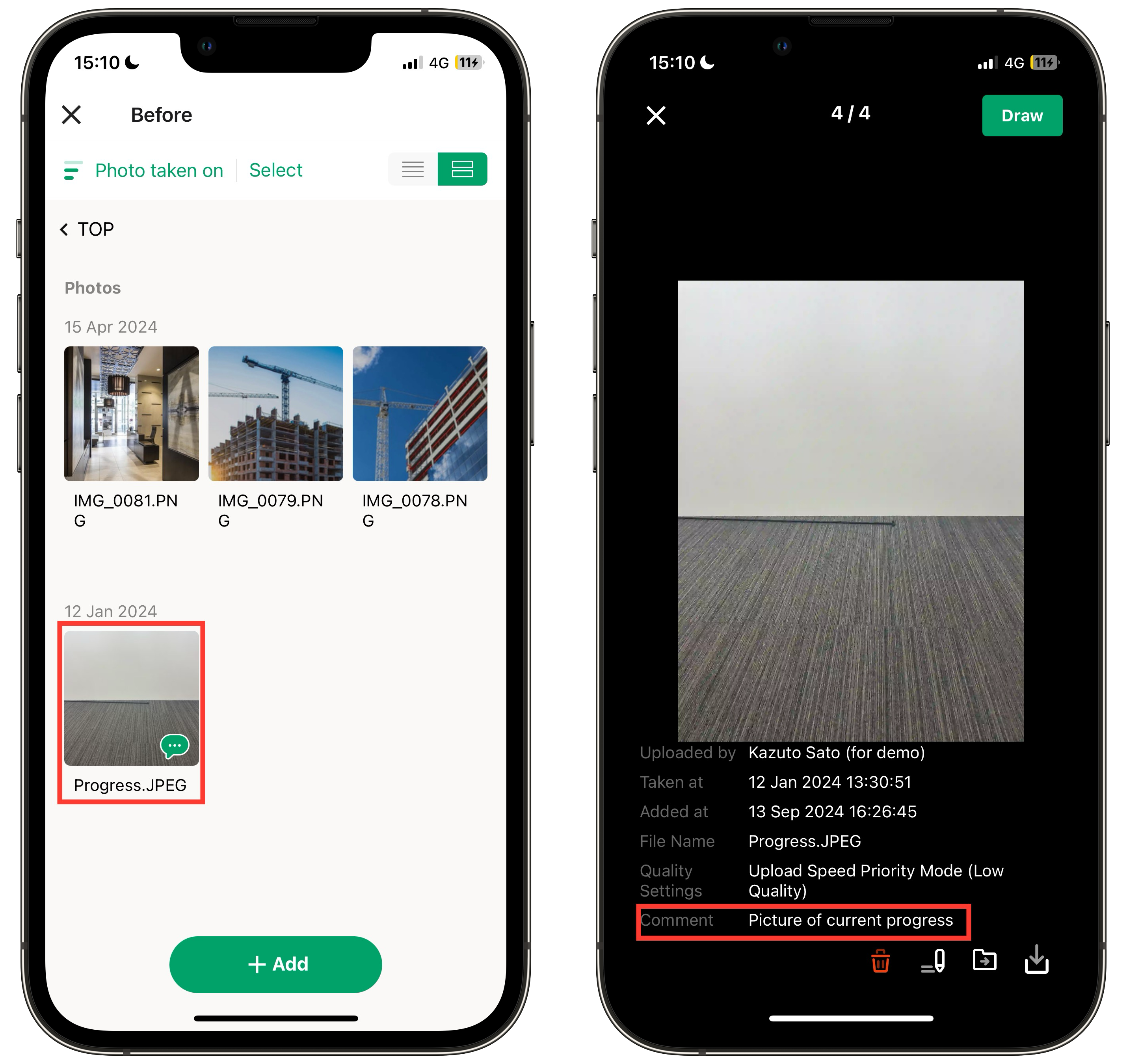 When using photos with comments in the Photo Report, the comments will be reflected as-is.