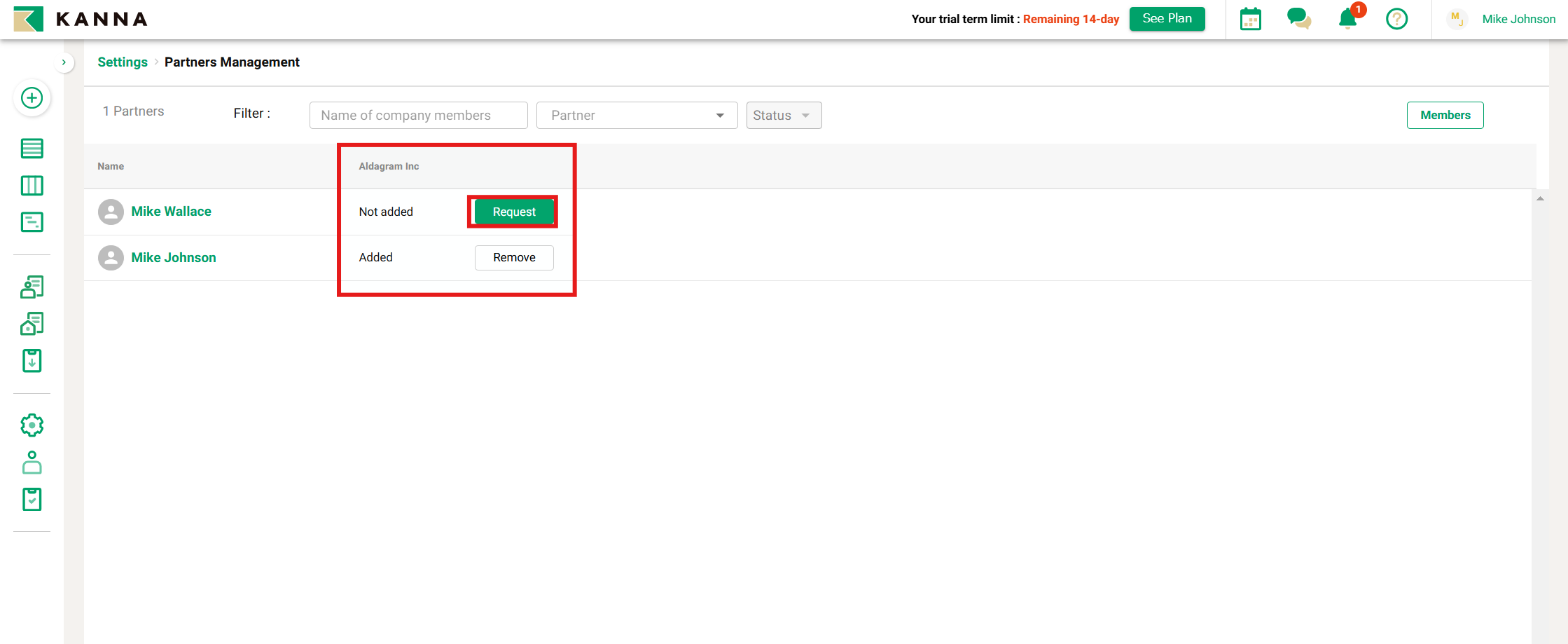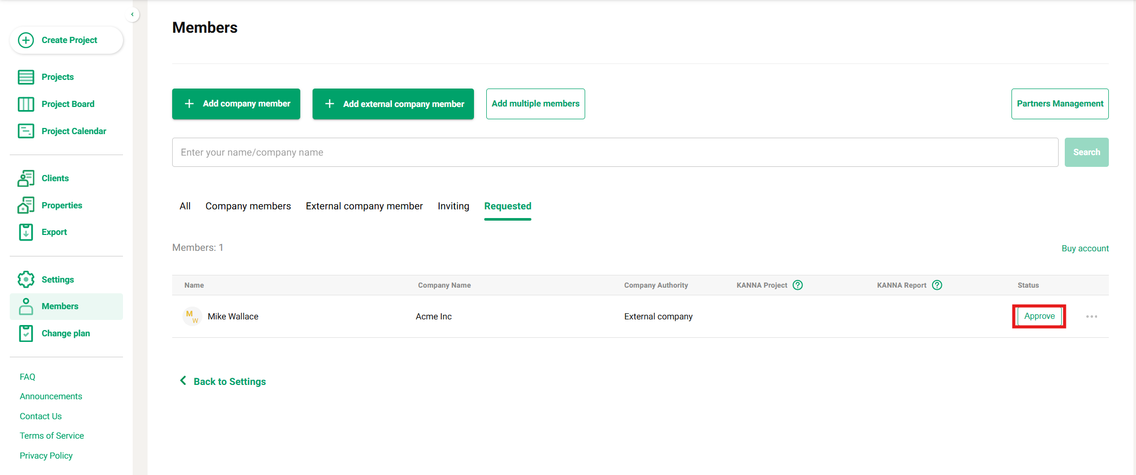 This feature allows owners and company administrators to easily manage members from partner (external) companies. Owners or Company Admins of each company can centrally manage connection requests from internal members to partner companies.
