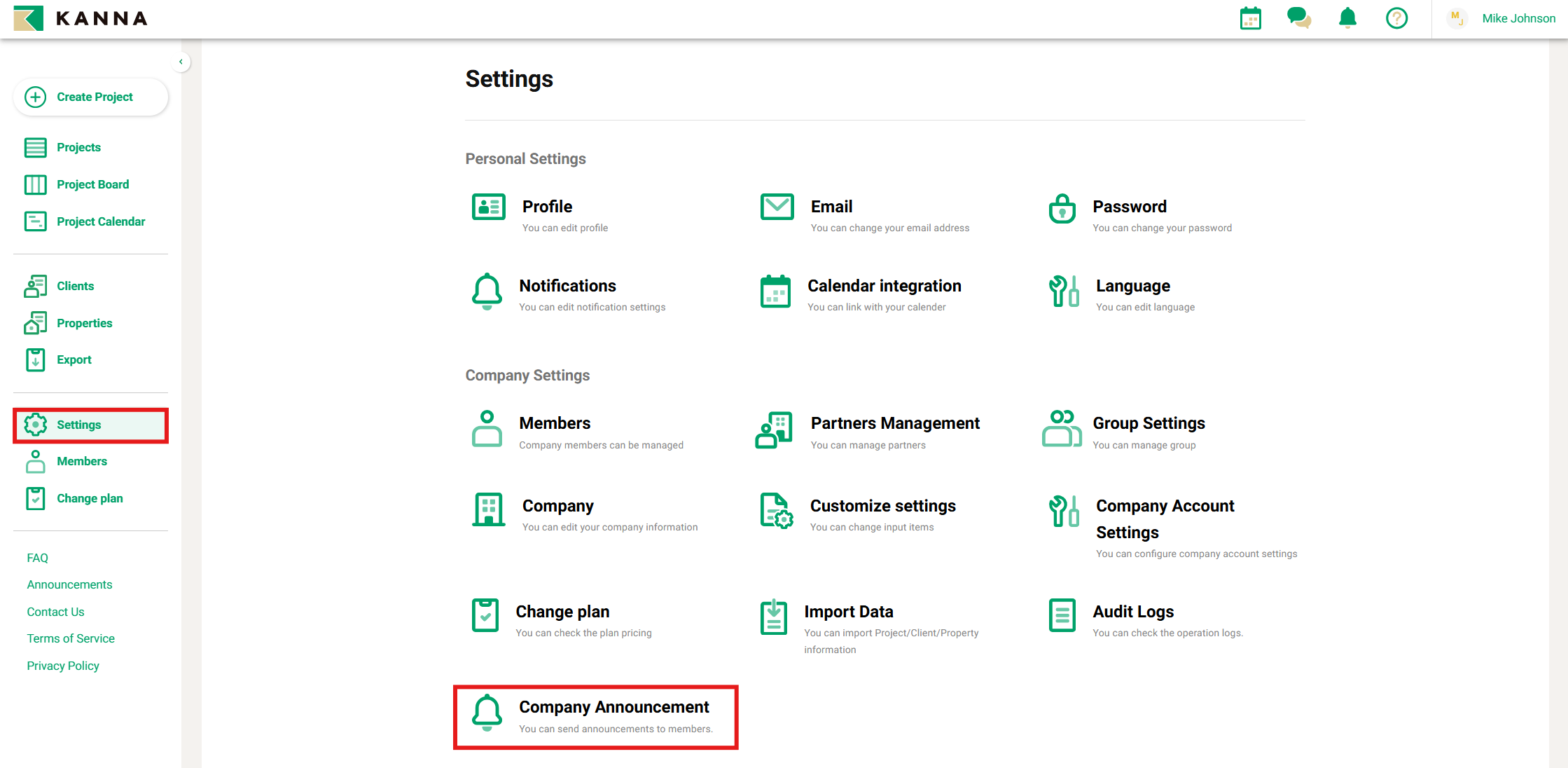 On a PC, you can check them from the top of the main page (by clicking on the KANNA logo) or by clicking the bell icon (Announcements) in the top-right corner.