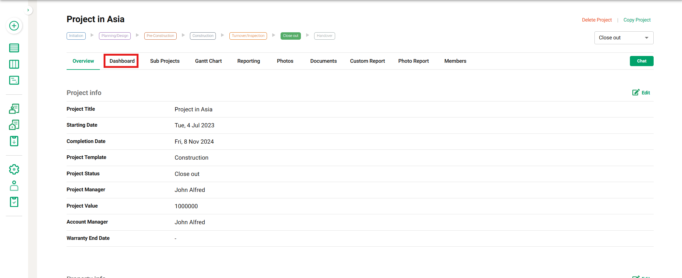 The dashboard can only be viewed from parent projects and cannot be accessed from sub-projects. (The "Dashboard" menu tab is not displayed for sub-projects.)