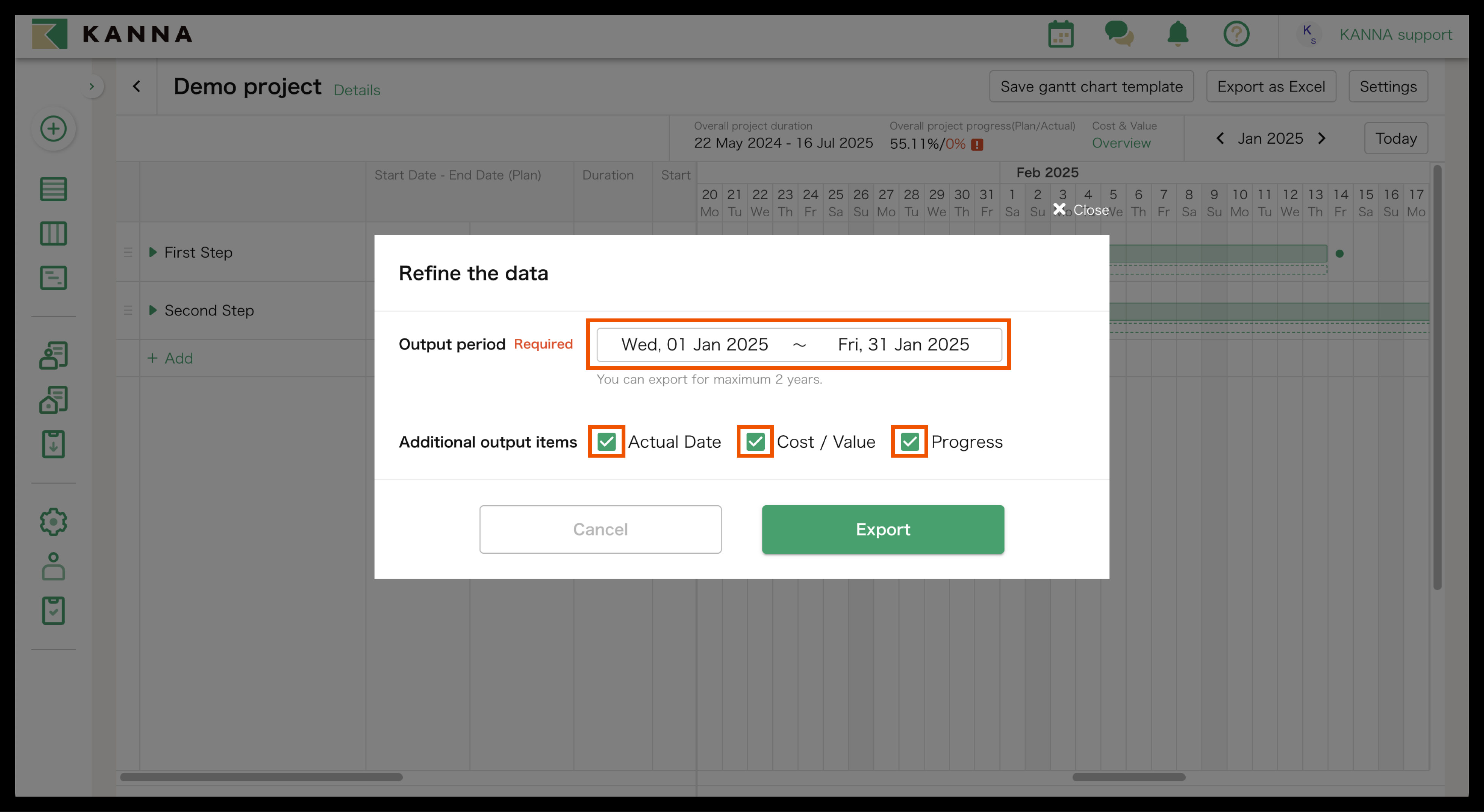 [KANNA Project] The actual date, cost/value, and progress rate of the Gantt chart can now also be output in Excel.