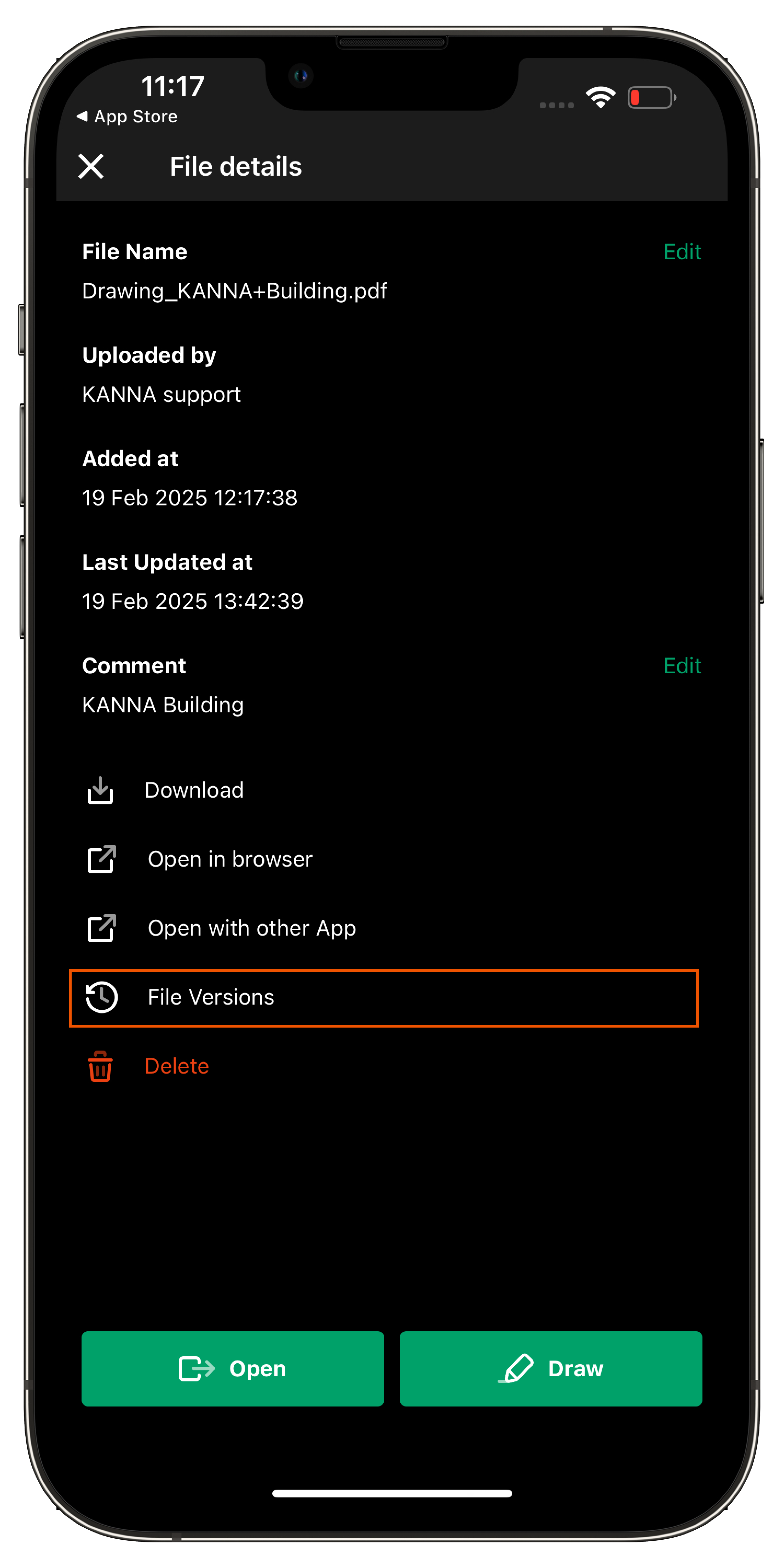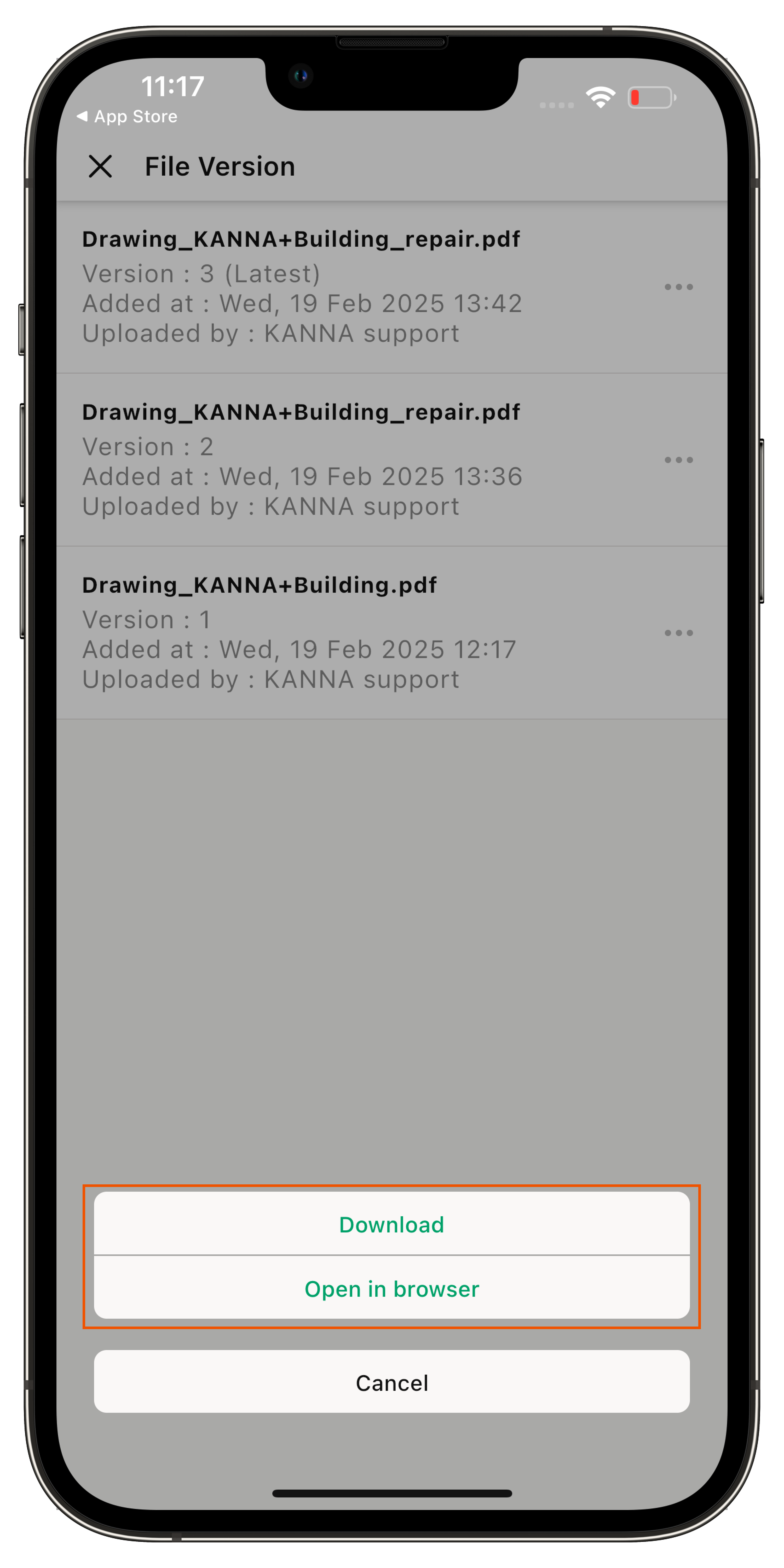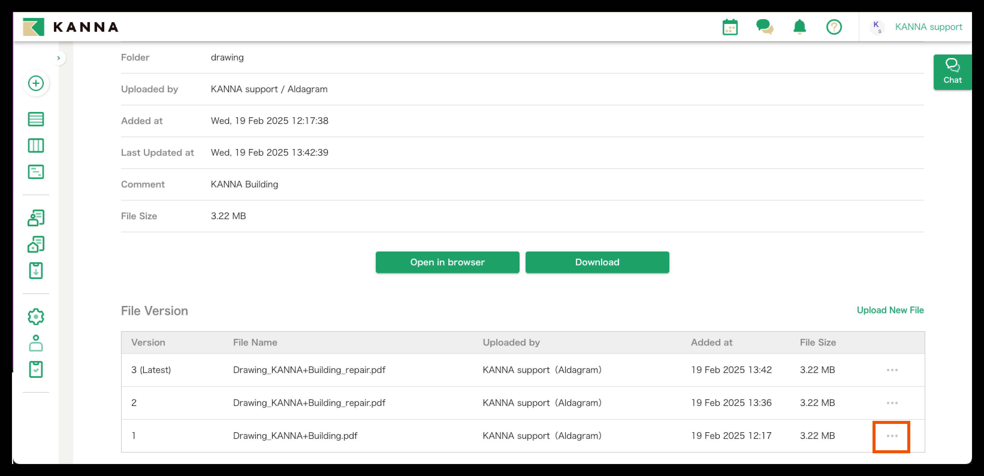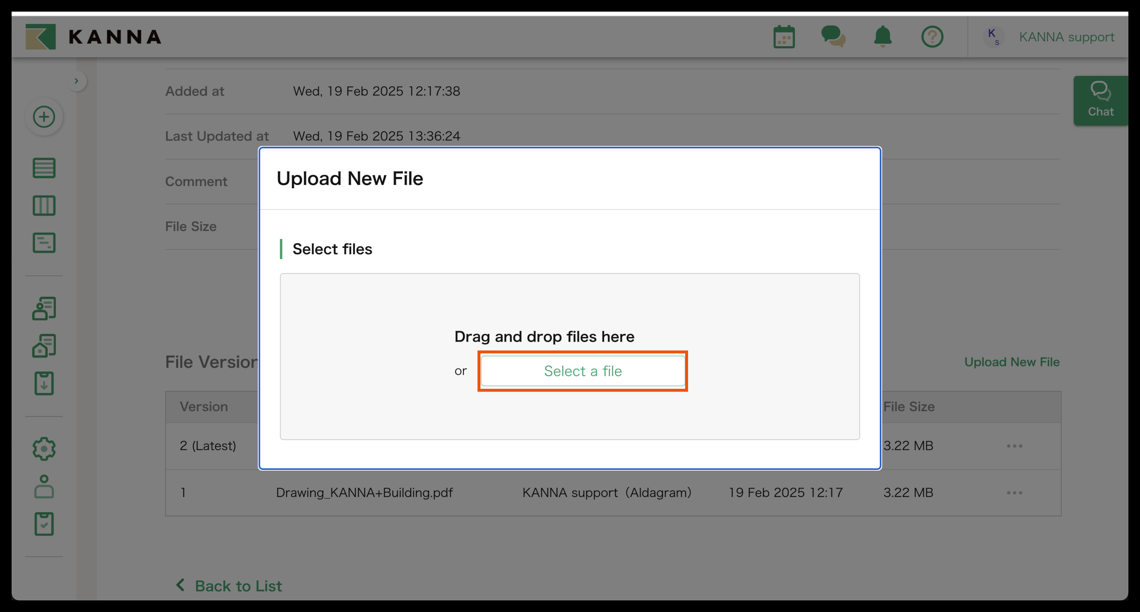 When you want to upload a revised or updated version of a document that has already been saved in KANNA, you can upload it as a different version of the file, instead of uploading it as a separate file.