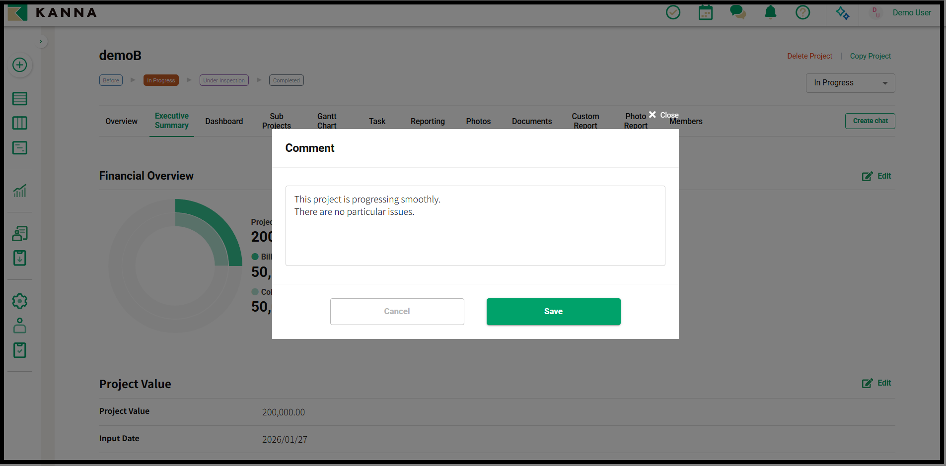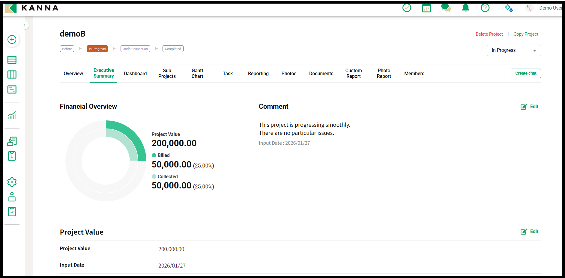 The Executive Summary allows you to manage sales, collection status, and progress for each projects.