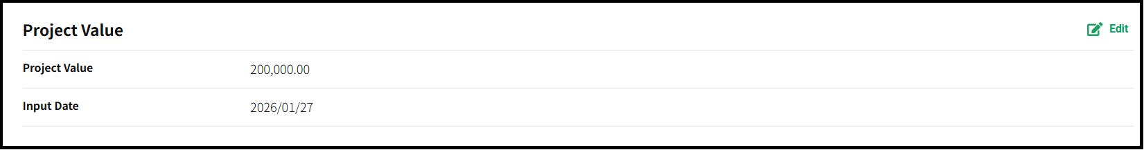 You can register the amount for the project. When registering, the entry date is automatically recorded along with the amount. If an amount has already been registered, entering a new amount will overwrite the existing one. Note that the information registered here will be aggregated and displayed on the Company Dashboard.