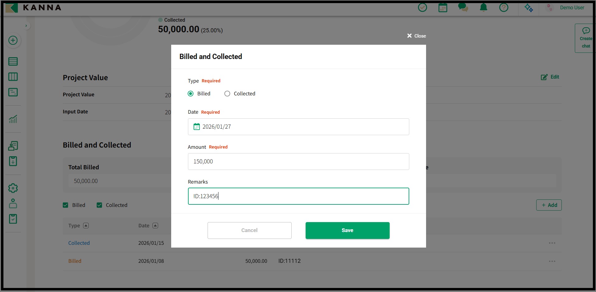 You can register information regarding billing and collection for the project. In this section, amounts related to billing and collection can be registered as a history record. Additionally, registered entries can be edited. Note that the information registered here will be aggregated and displayed on the Company Dashboard.