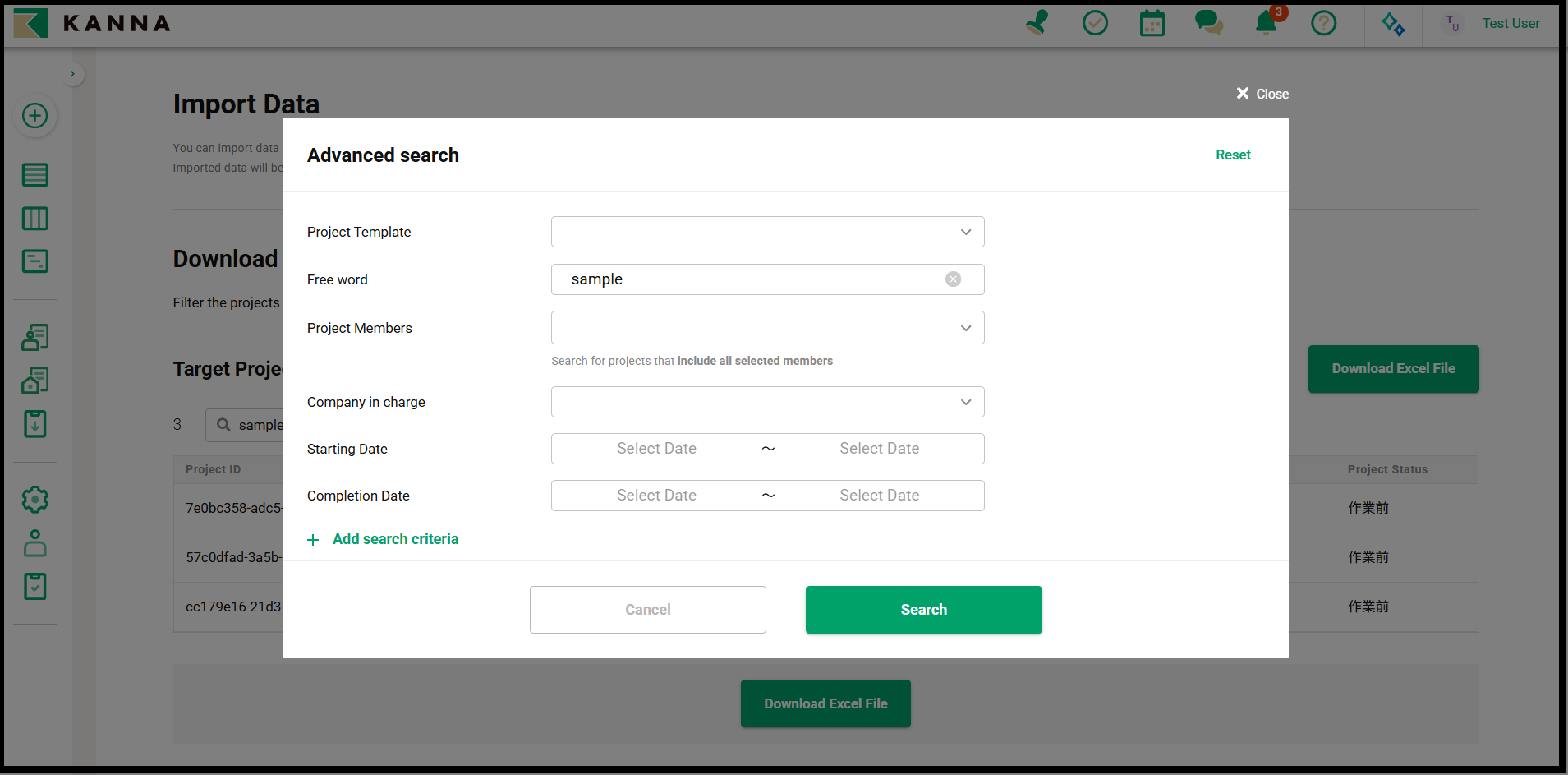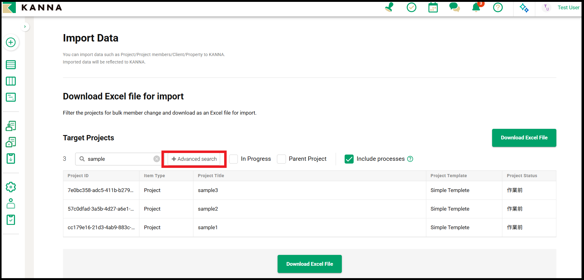 Clicking "Download" will display the next screen. Filter the projects for which you want to import members using detailed search or other criteria, then click "Download Excel file".