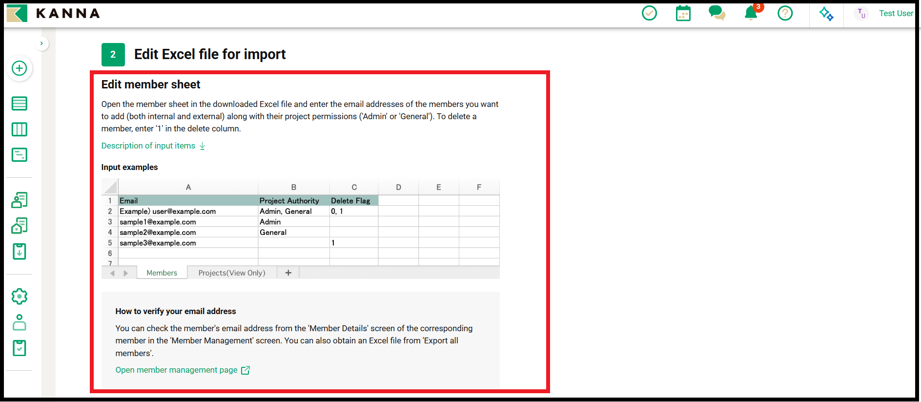 The import procedure after completing the Excel file editing is the same as when registering project information. Please refer to Step 5 and Step 6 to perform the import.