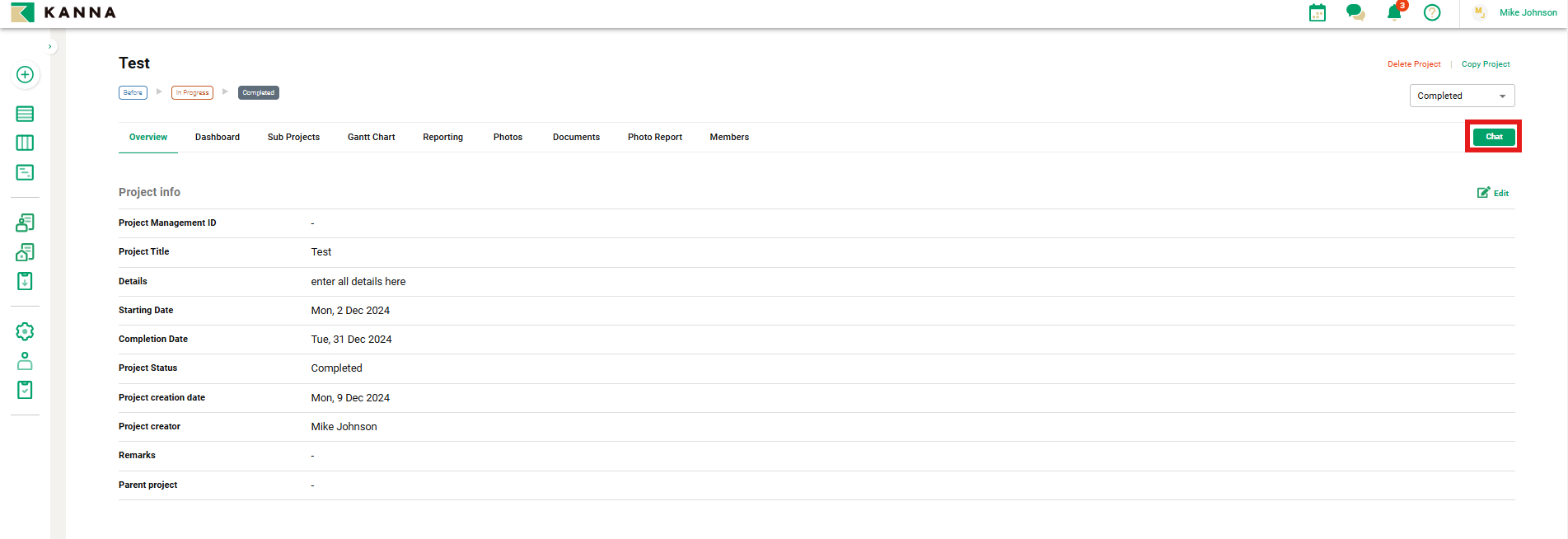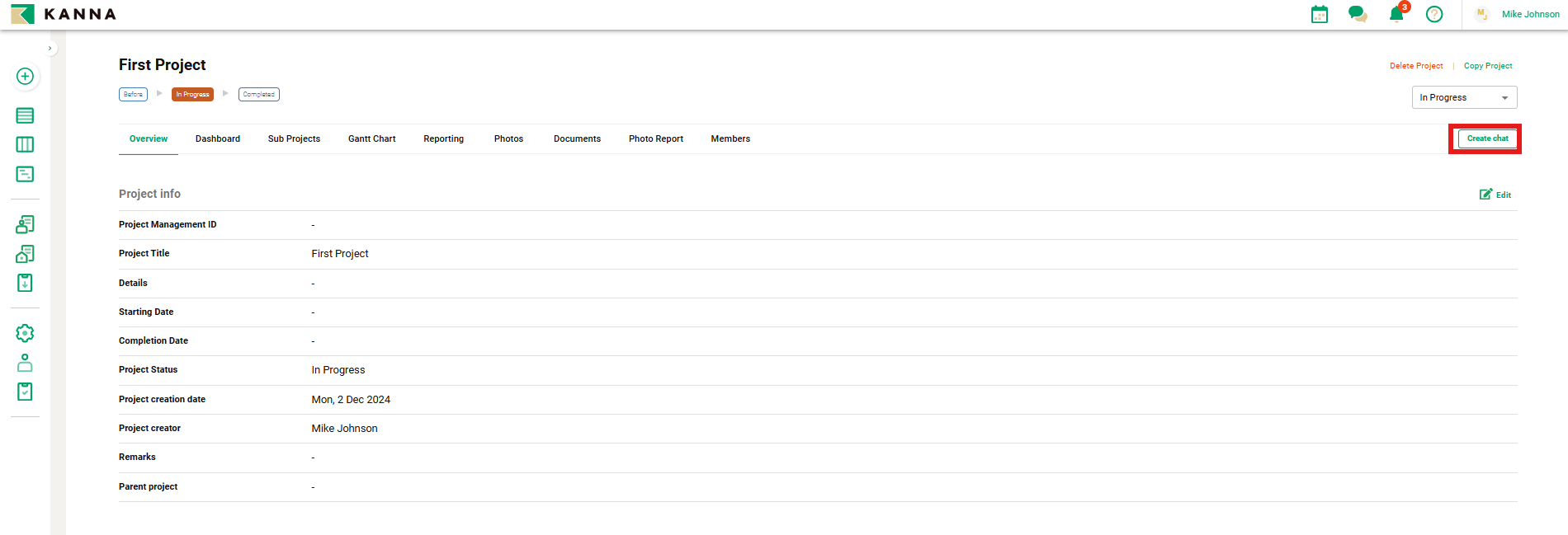 By clicking "Create Chat," a chat group for the corresponding project will be created.