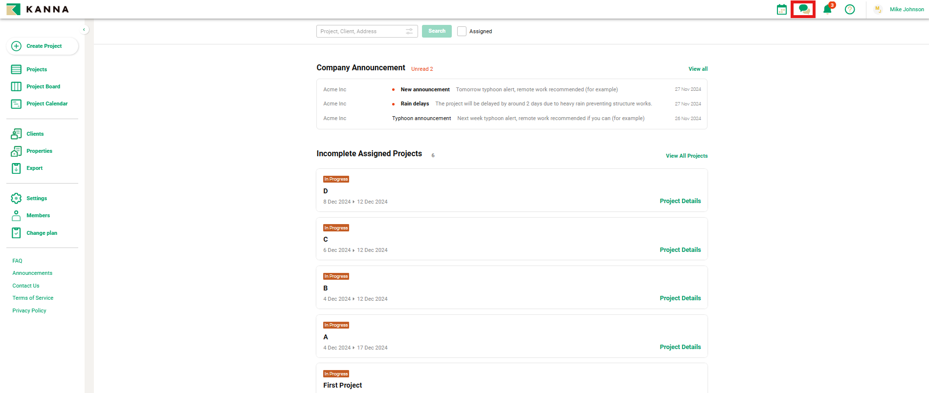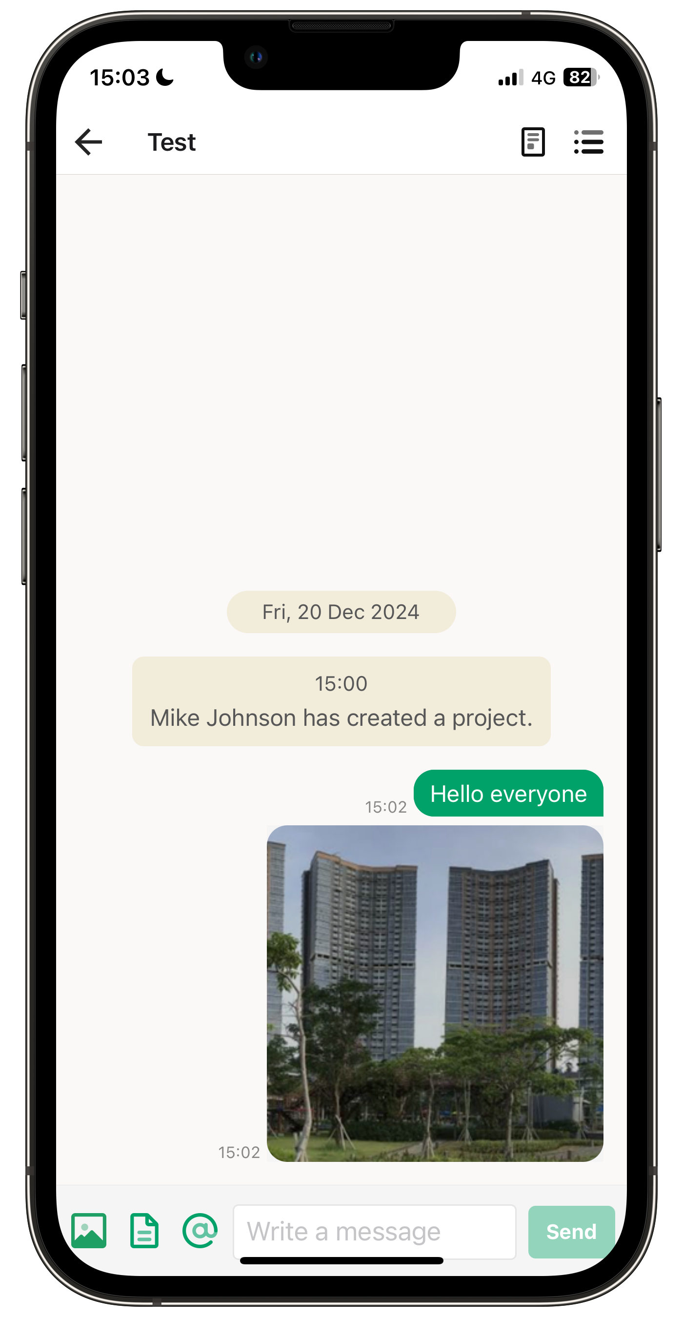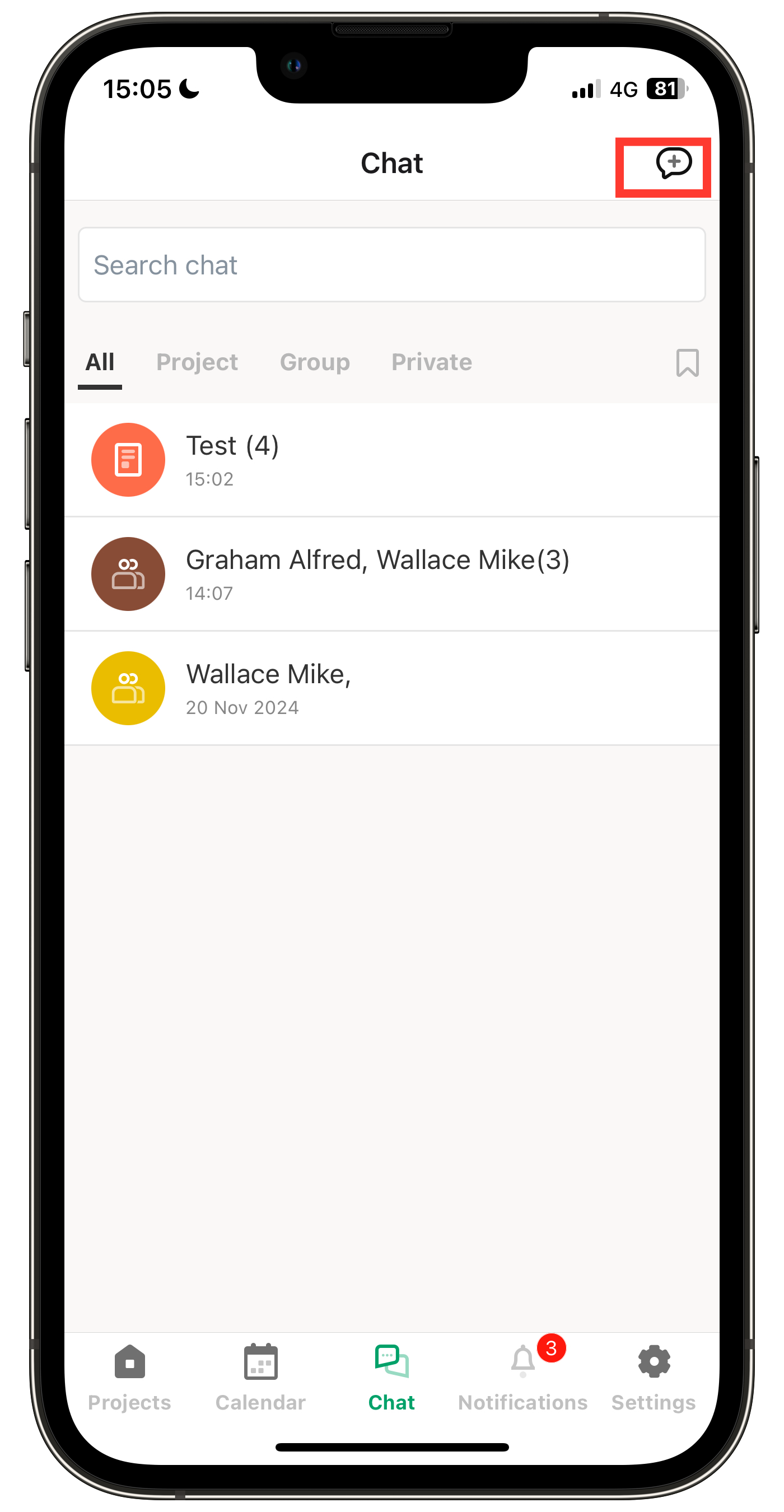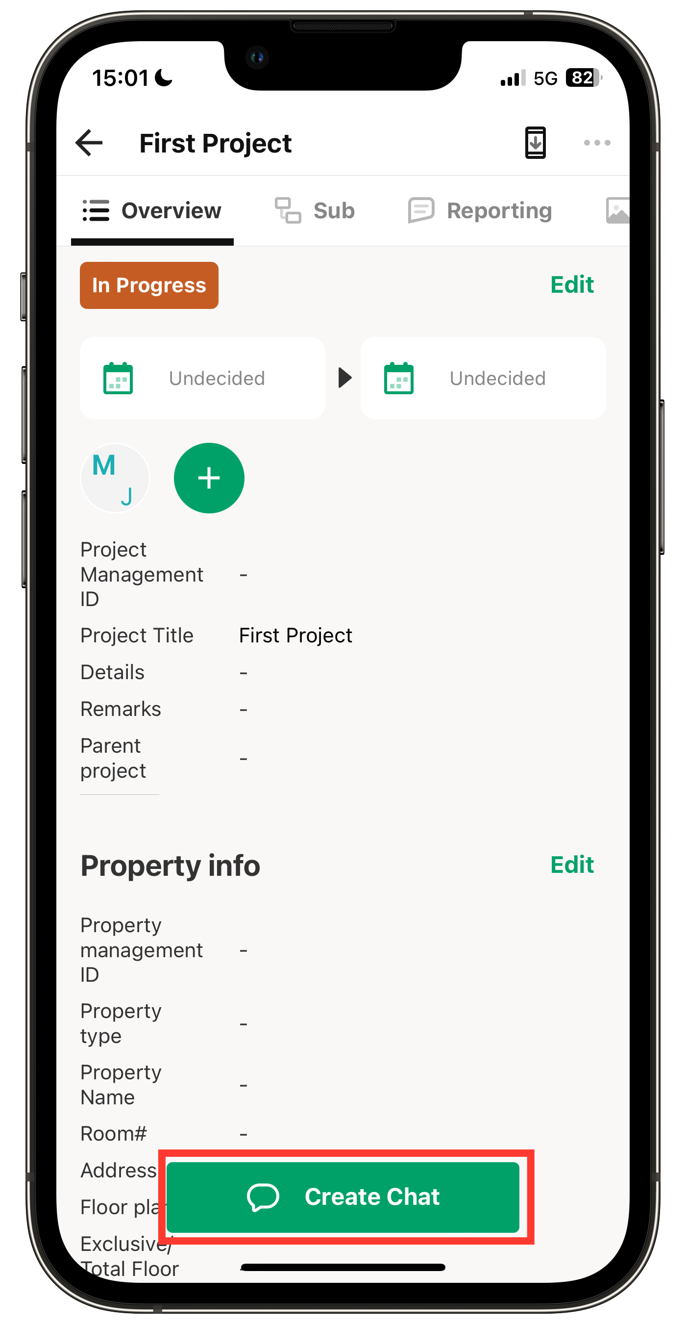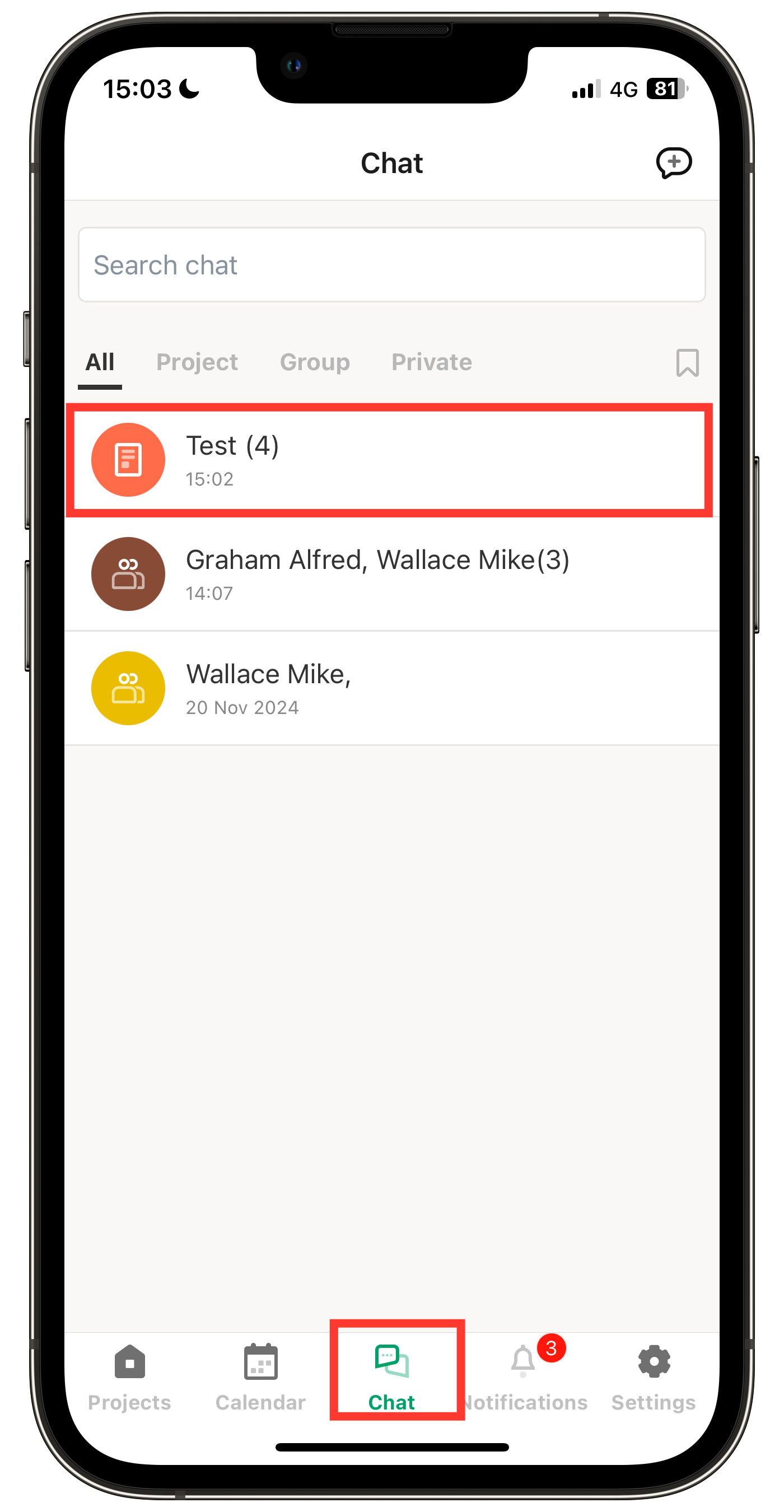 1. Tap on the desired project in the "Projects" page to access the chat.