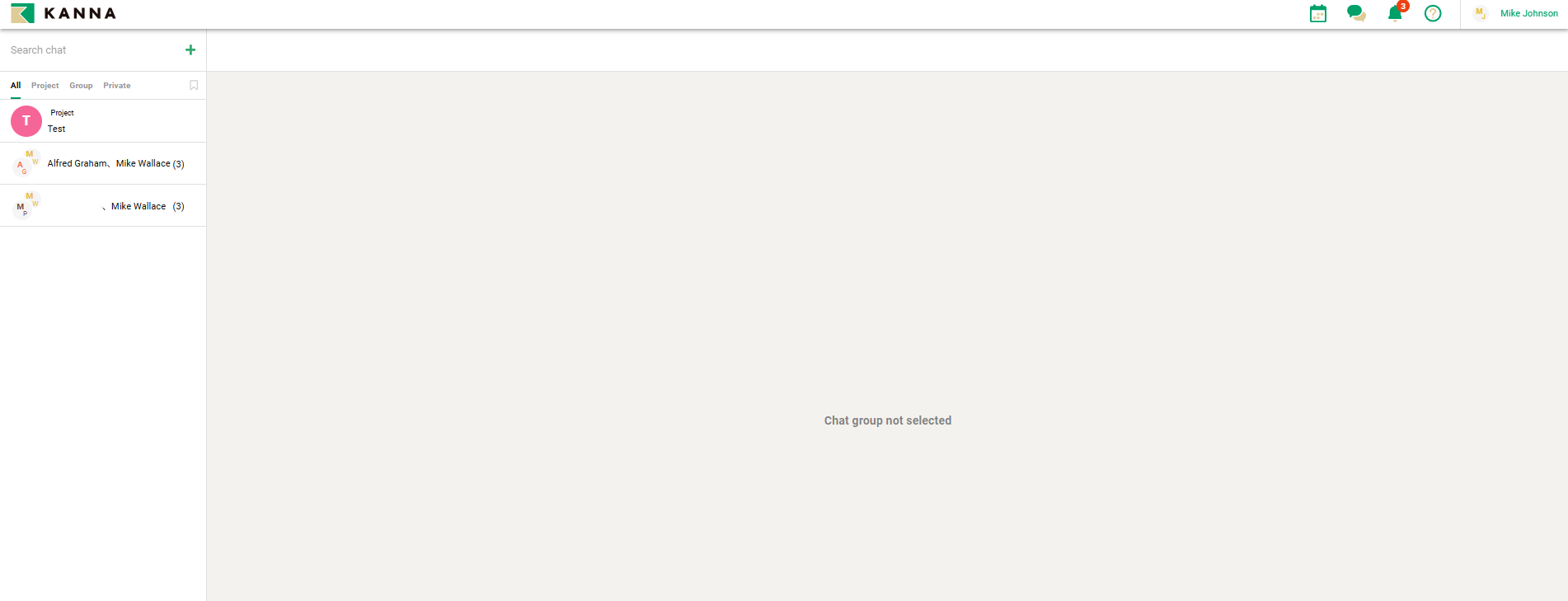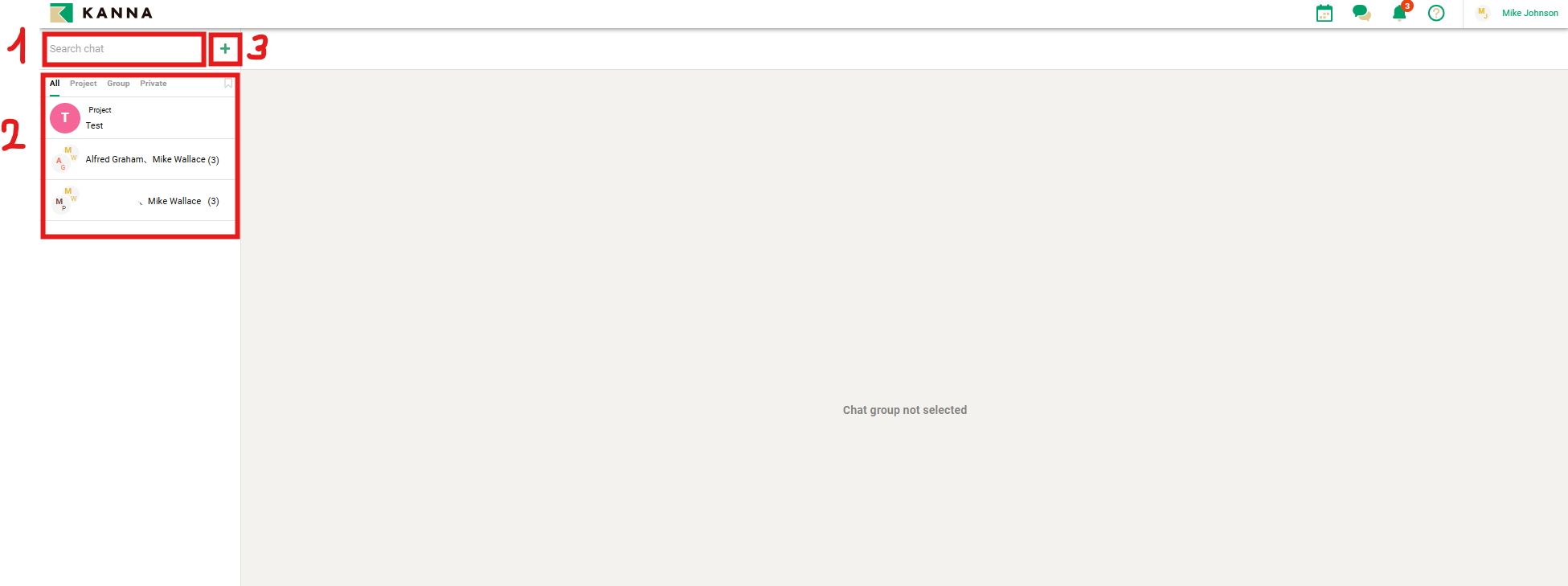 Chat groups are automatically organized into "All," "Project," "Group," and "Private".