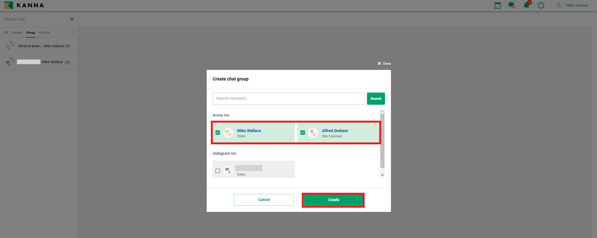 Note: Members from external companies with general permissions do not have the authority to use the "Create Chat" feature.