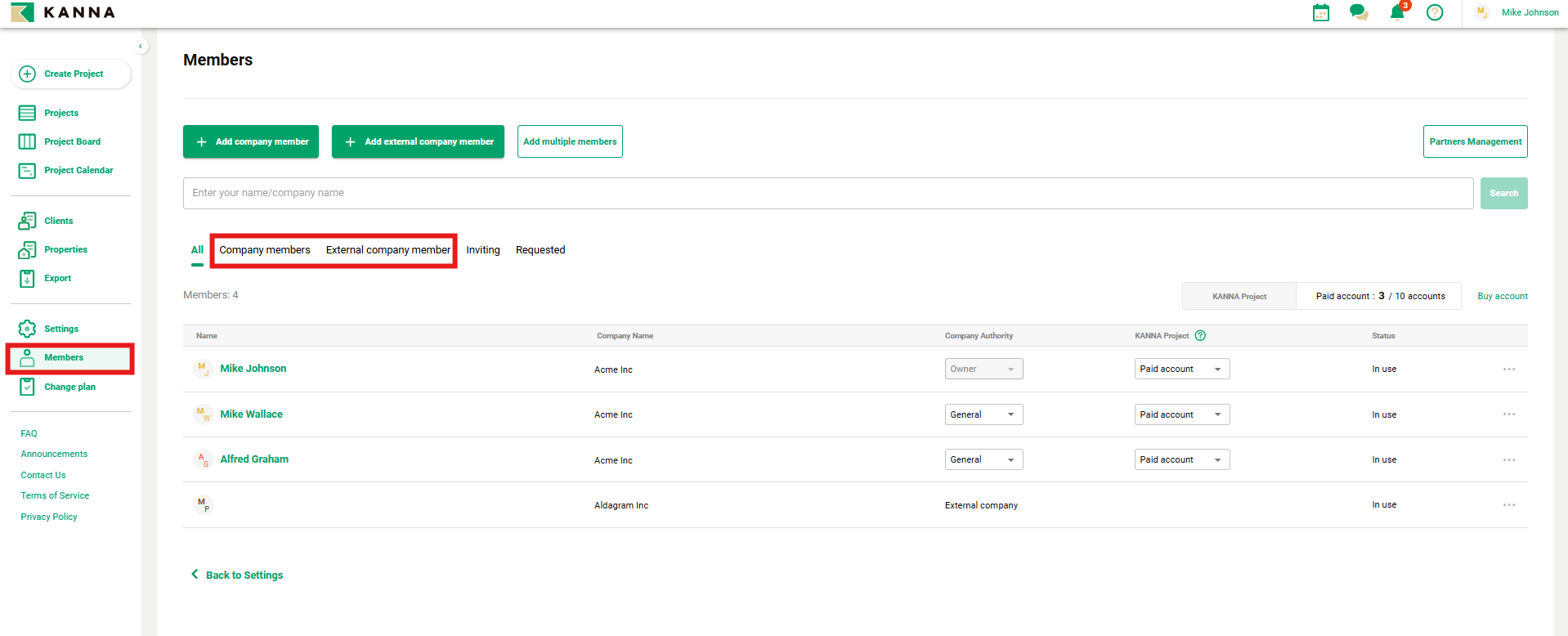 Members can be checked by going to "Members" → tapping "Company Members" or "External Company Members."