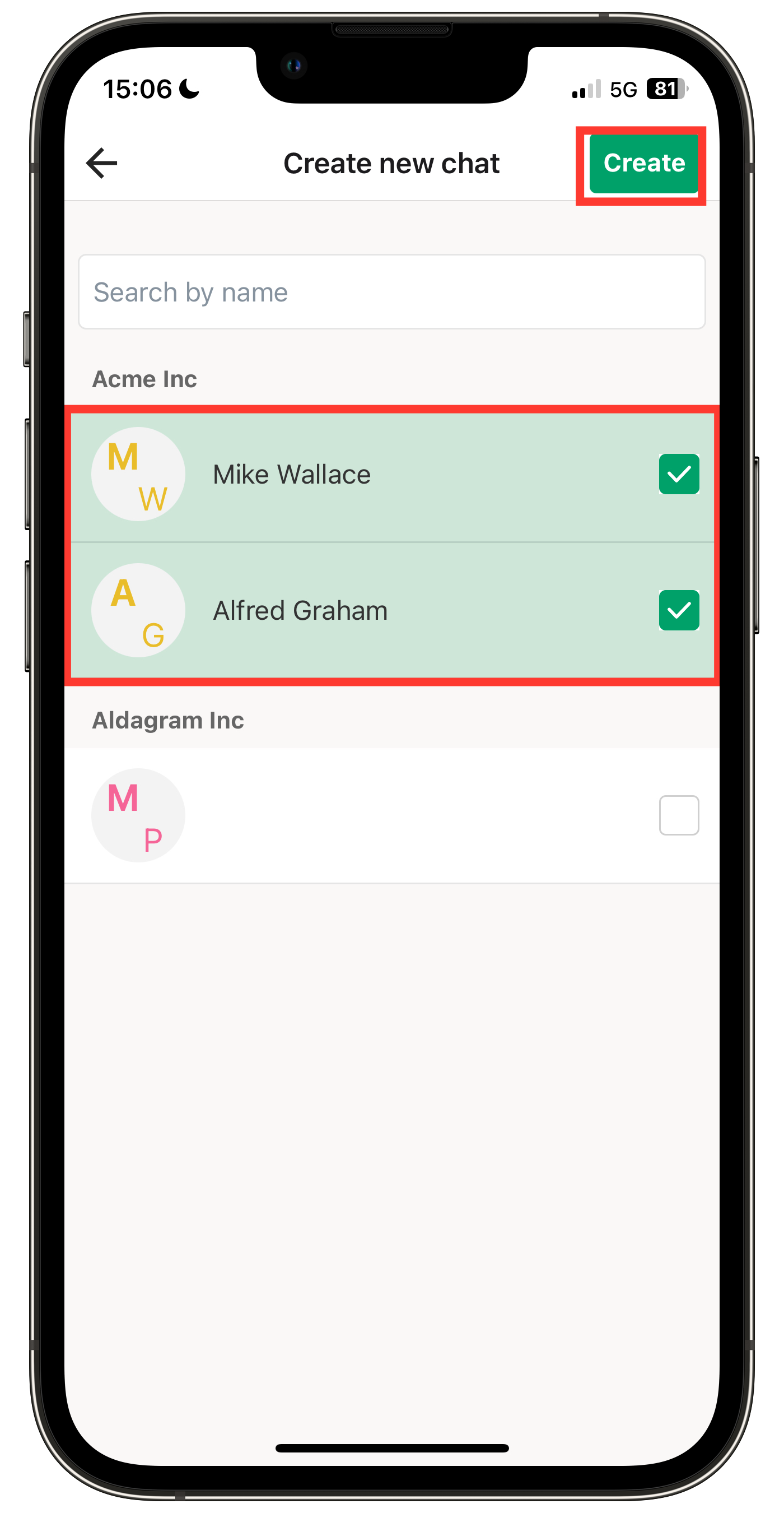 Click the "+" in the top left corner, select members, and tap "Create" to create a new group.