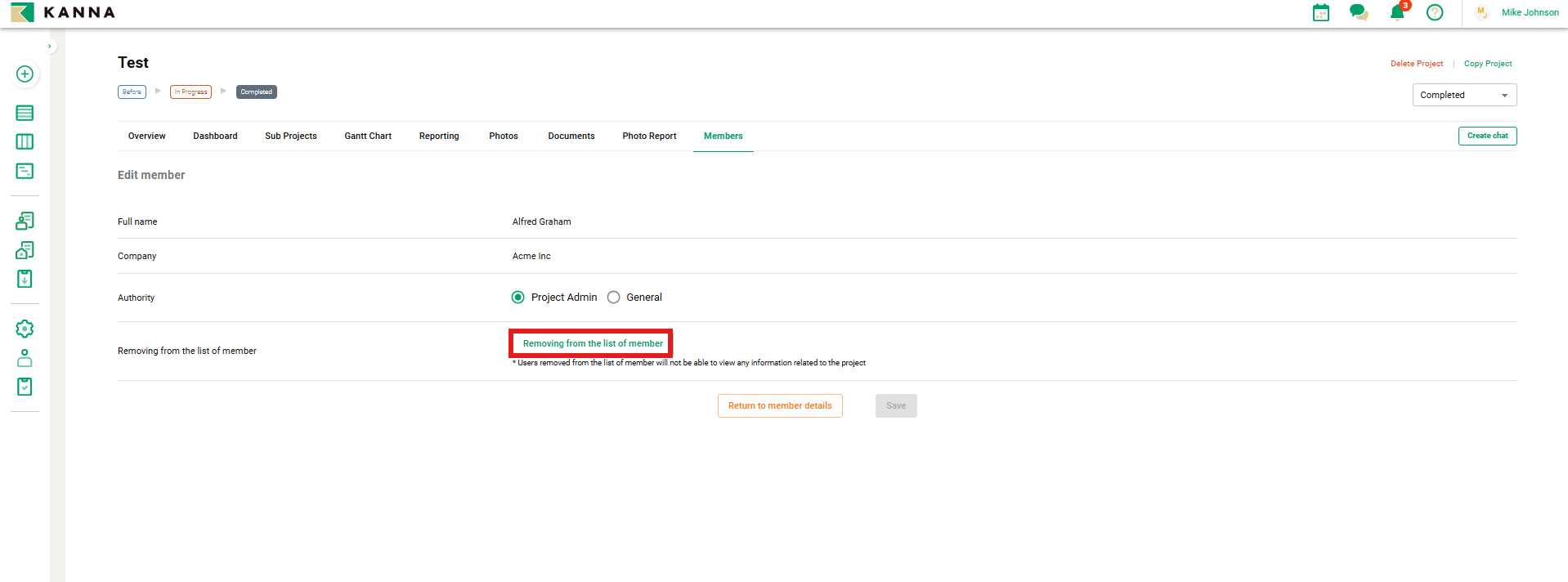 Note: Once a member is removed from a project, general members from your company and external members will no longer have access to any project-related information.