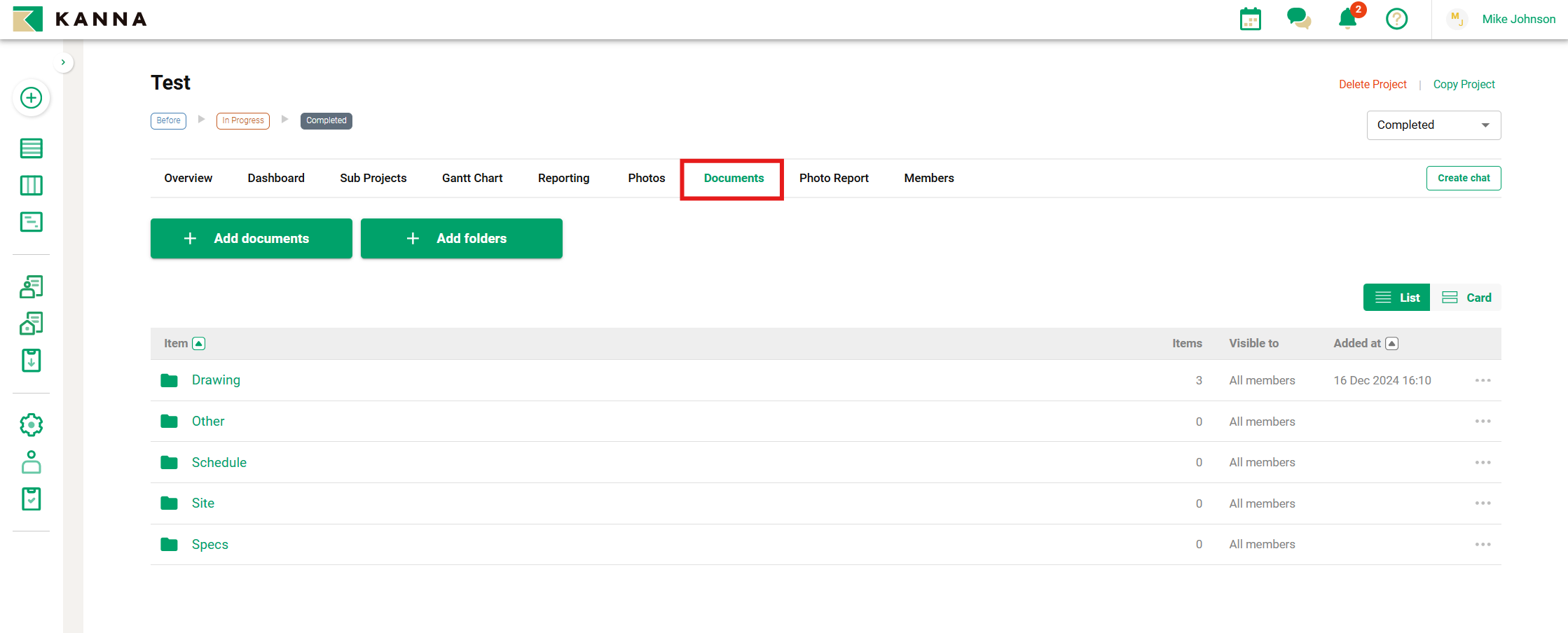 1. Tap the project where you want to add a folder from the Projects menu.