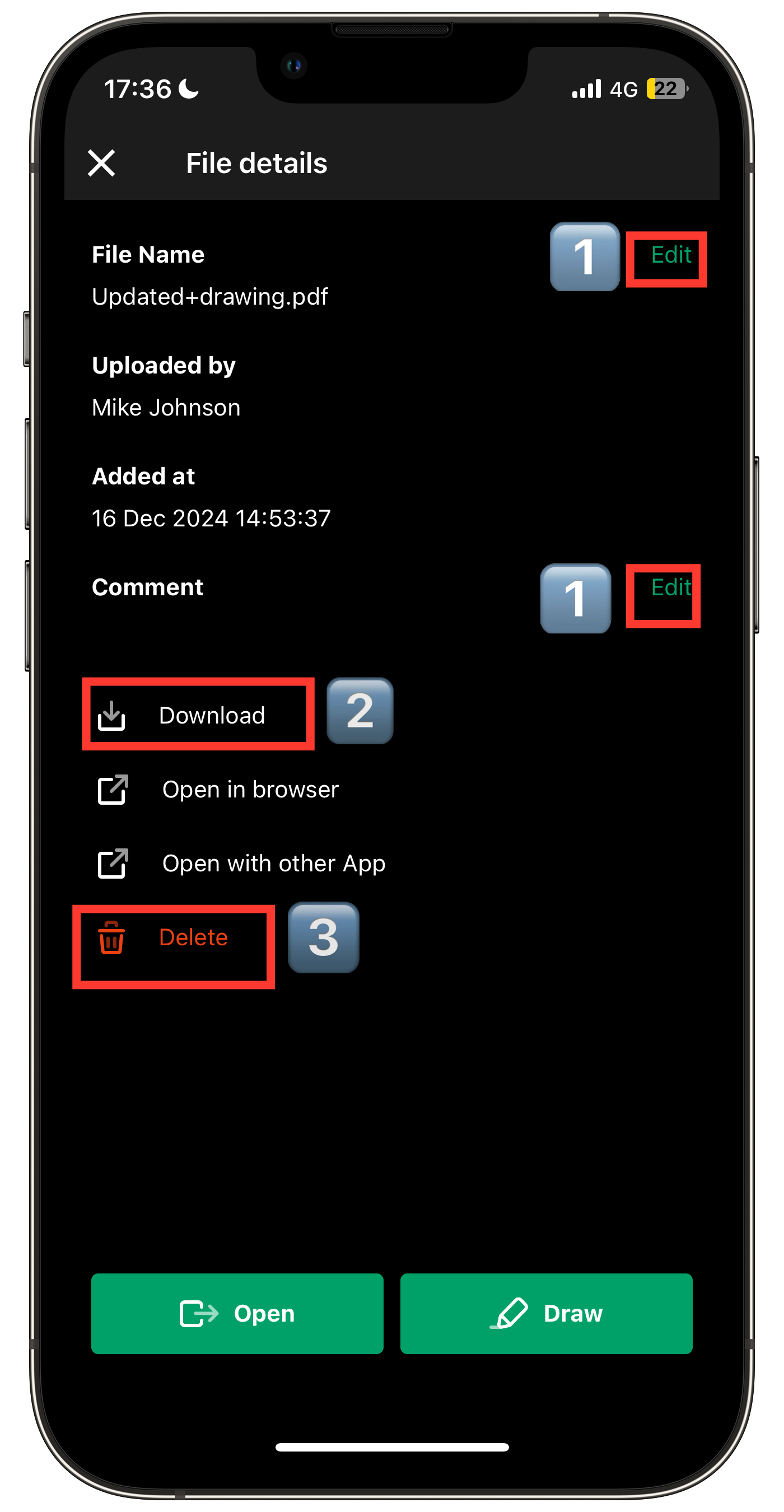 If you open documents uploaded by other members, options ① and ② will not be displayed.
