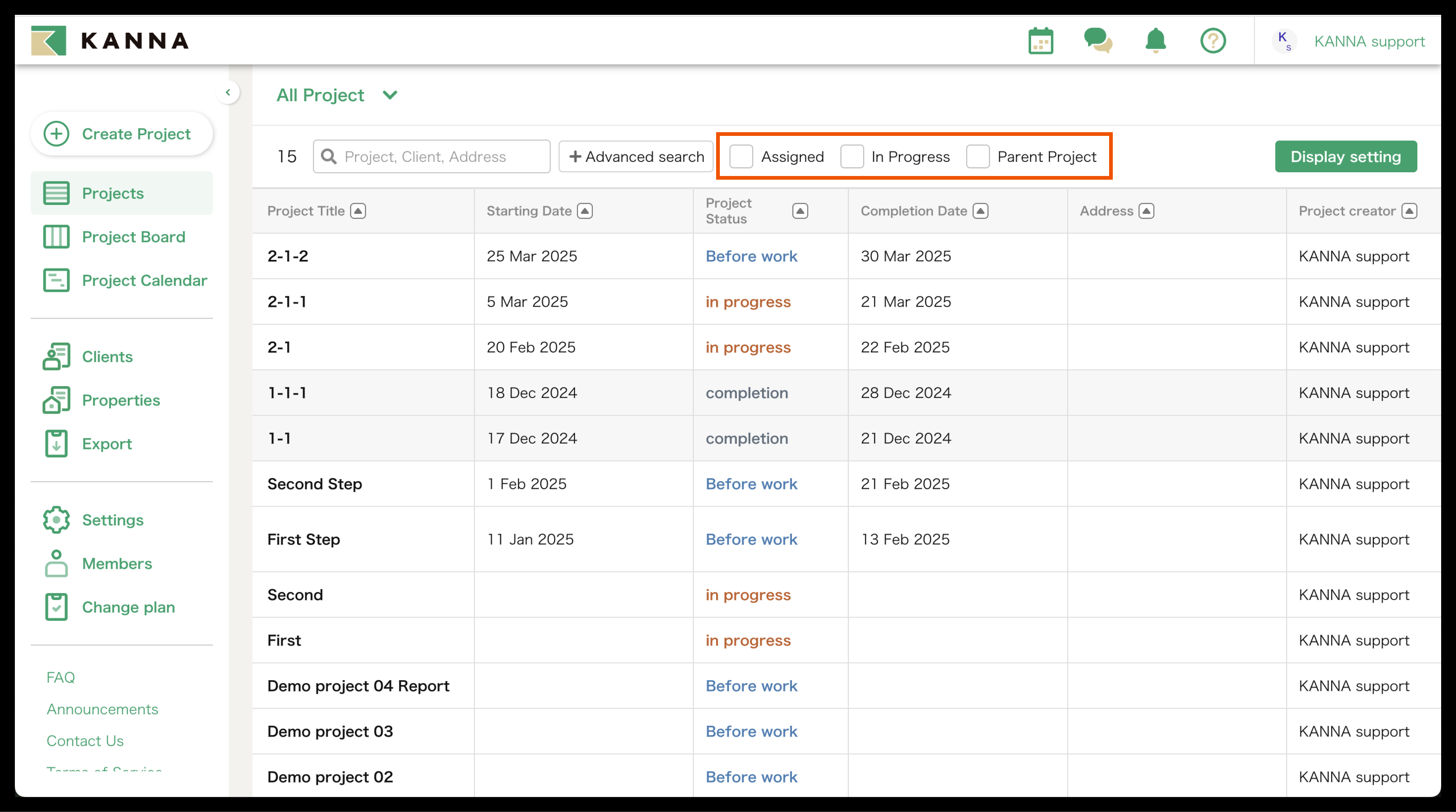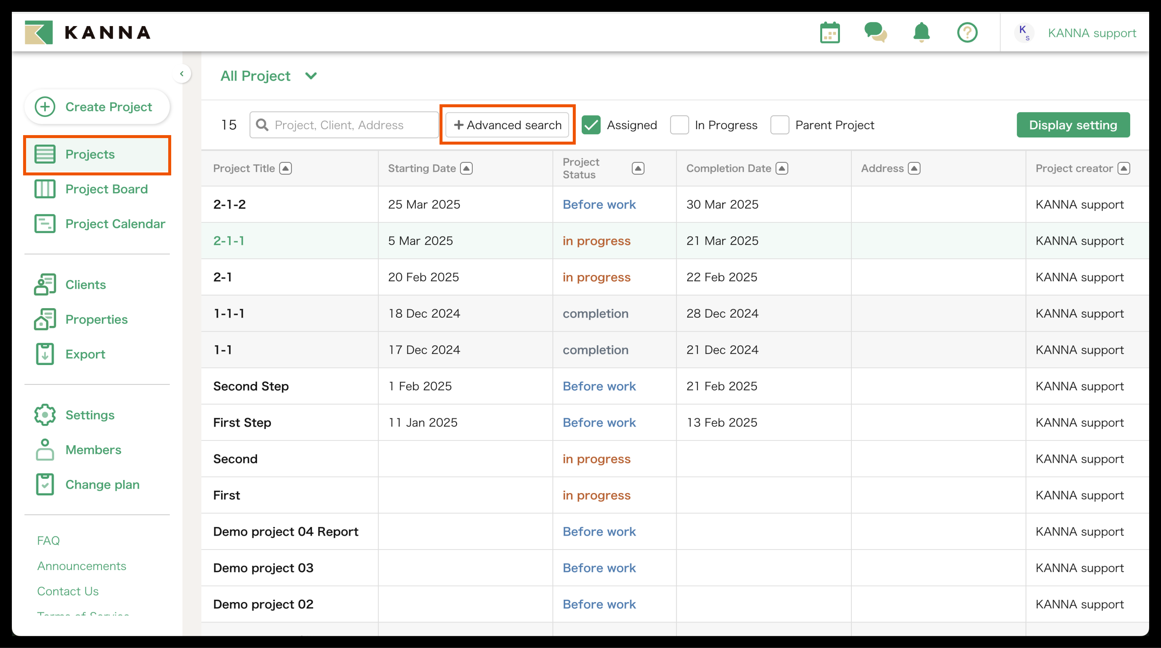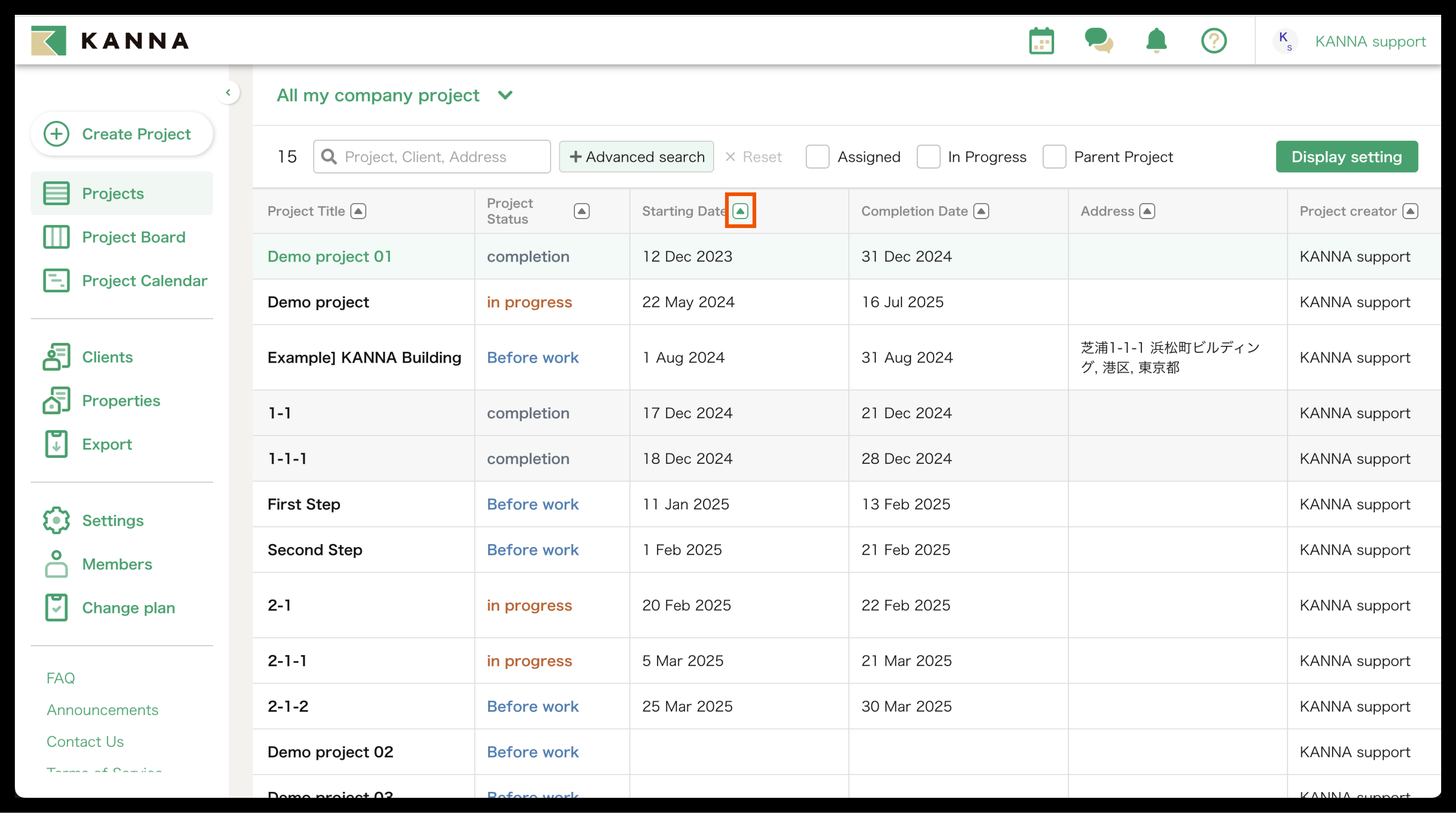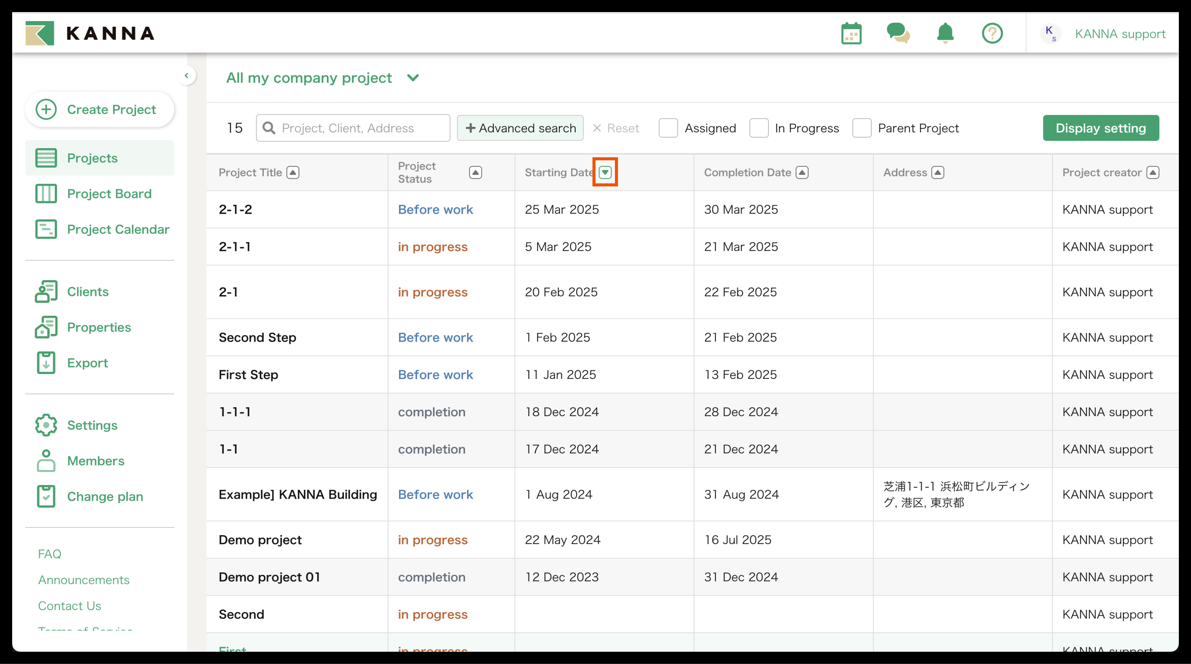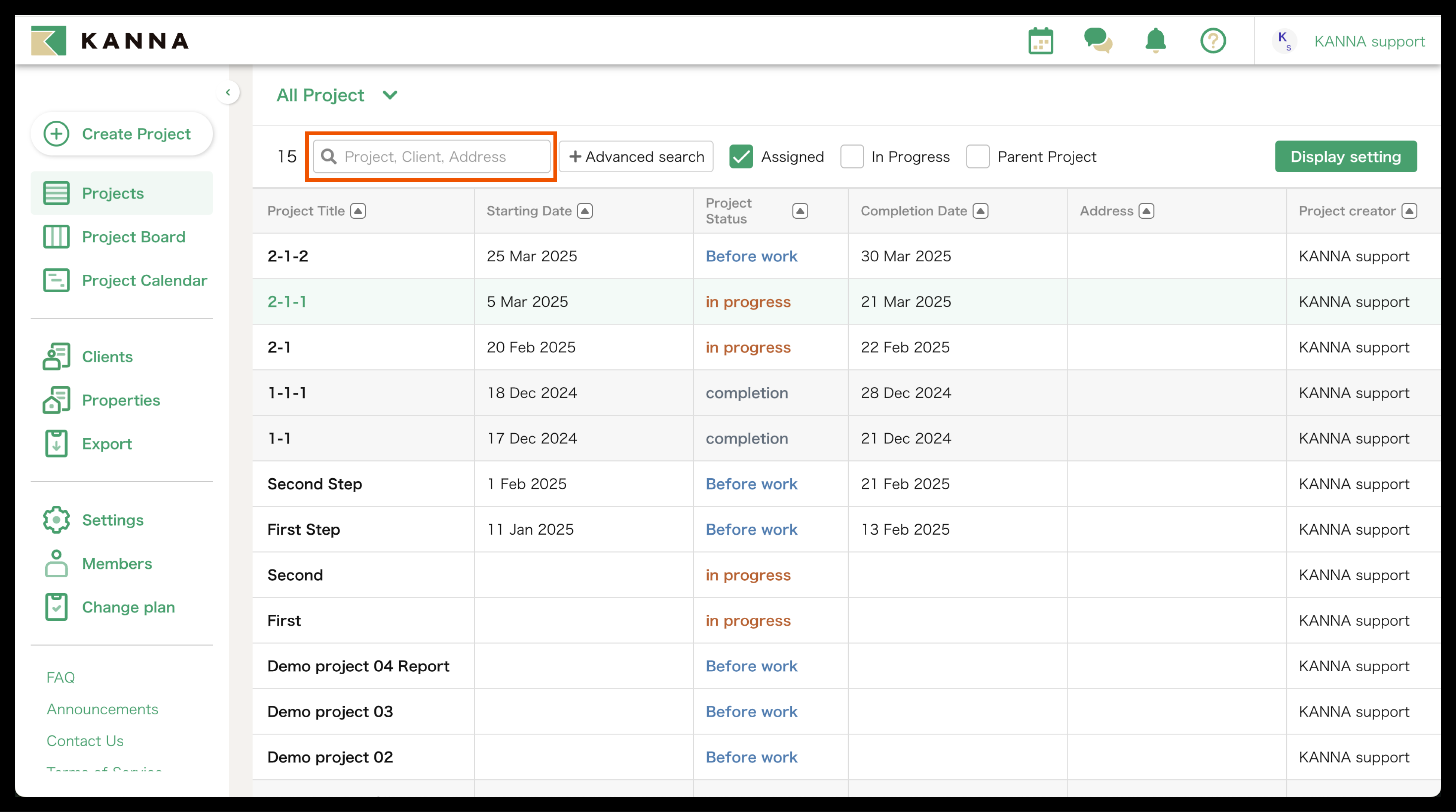 Selain nama proyek, informasi seperti tanggal mulai, tanggal selesai, alamat, dan tanggal pemesanan juga dapat ditampilkan di Proyek. Item yang ditampilkan dapat disesuaikan dan diubah untuk setiap akun. Anda dapat menampilkan hanya proyek yang Anda tangani atau yang belum selesai, atau mencari berdasarkan nama proyek, nama klien, atau alamat situs.
