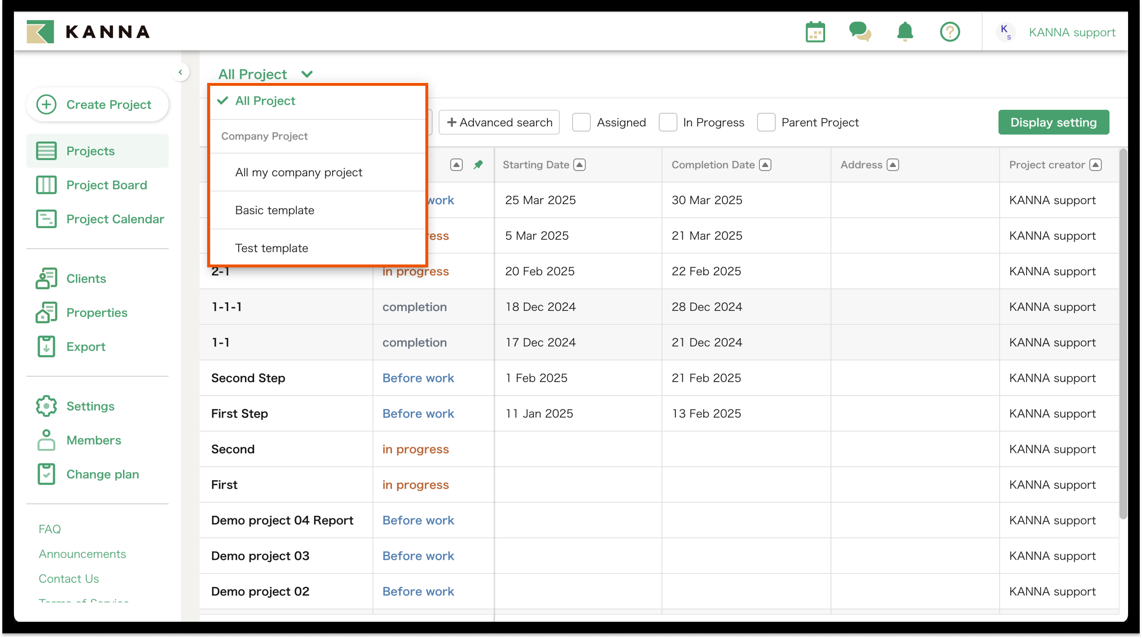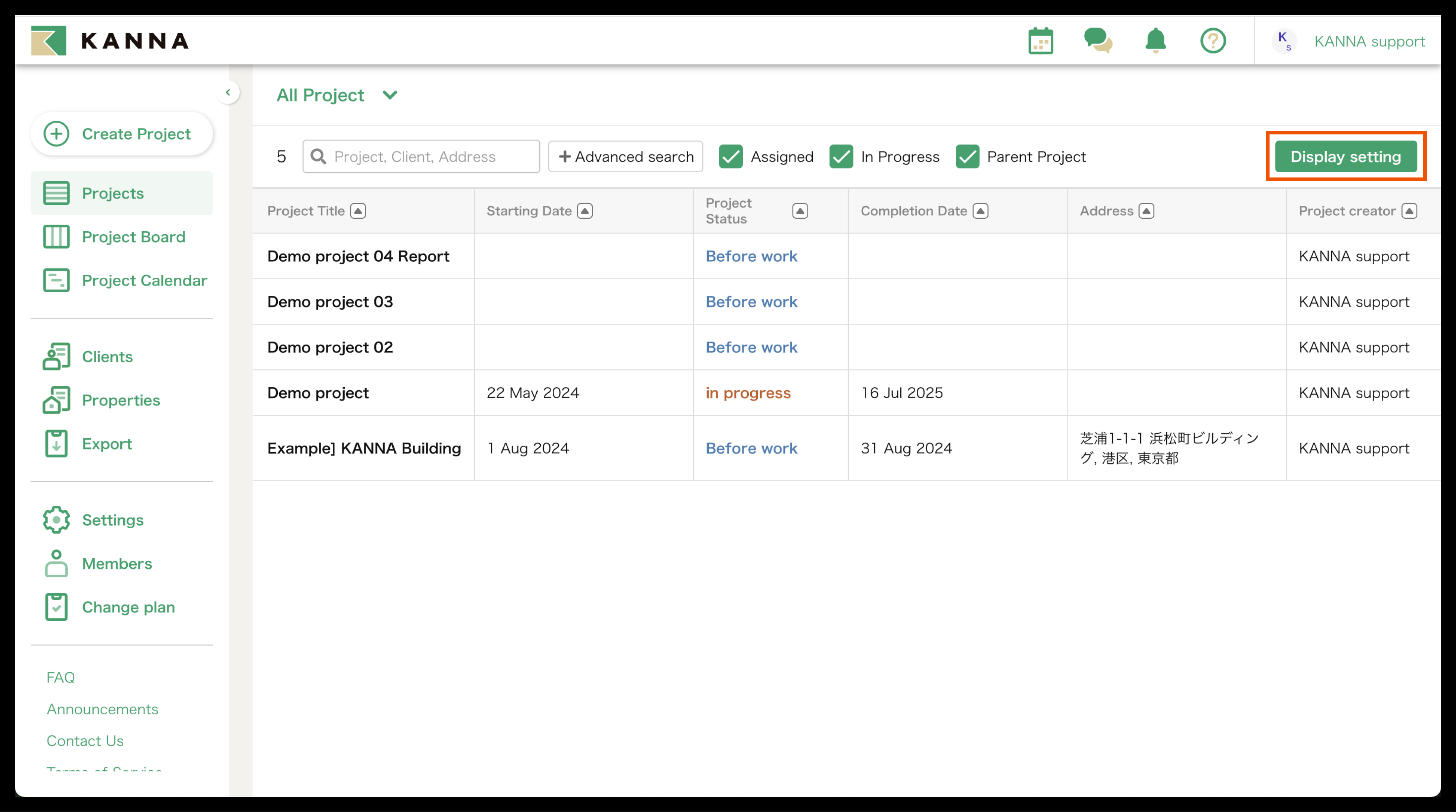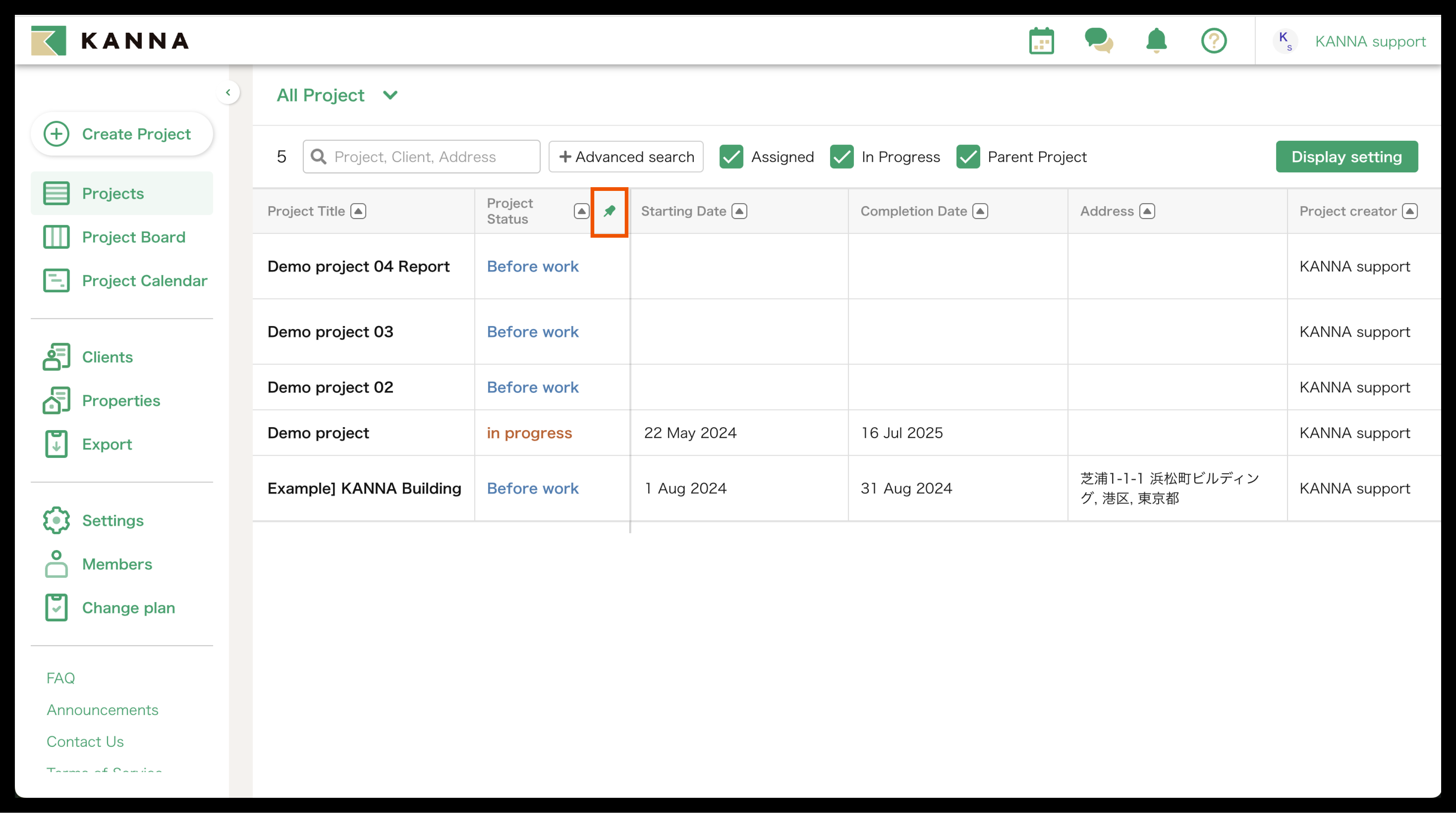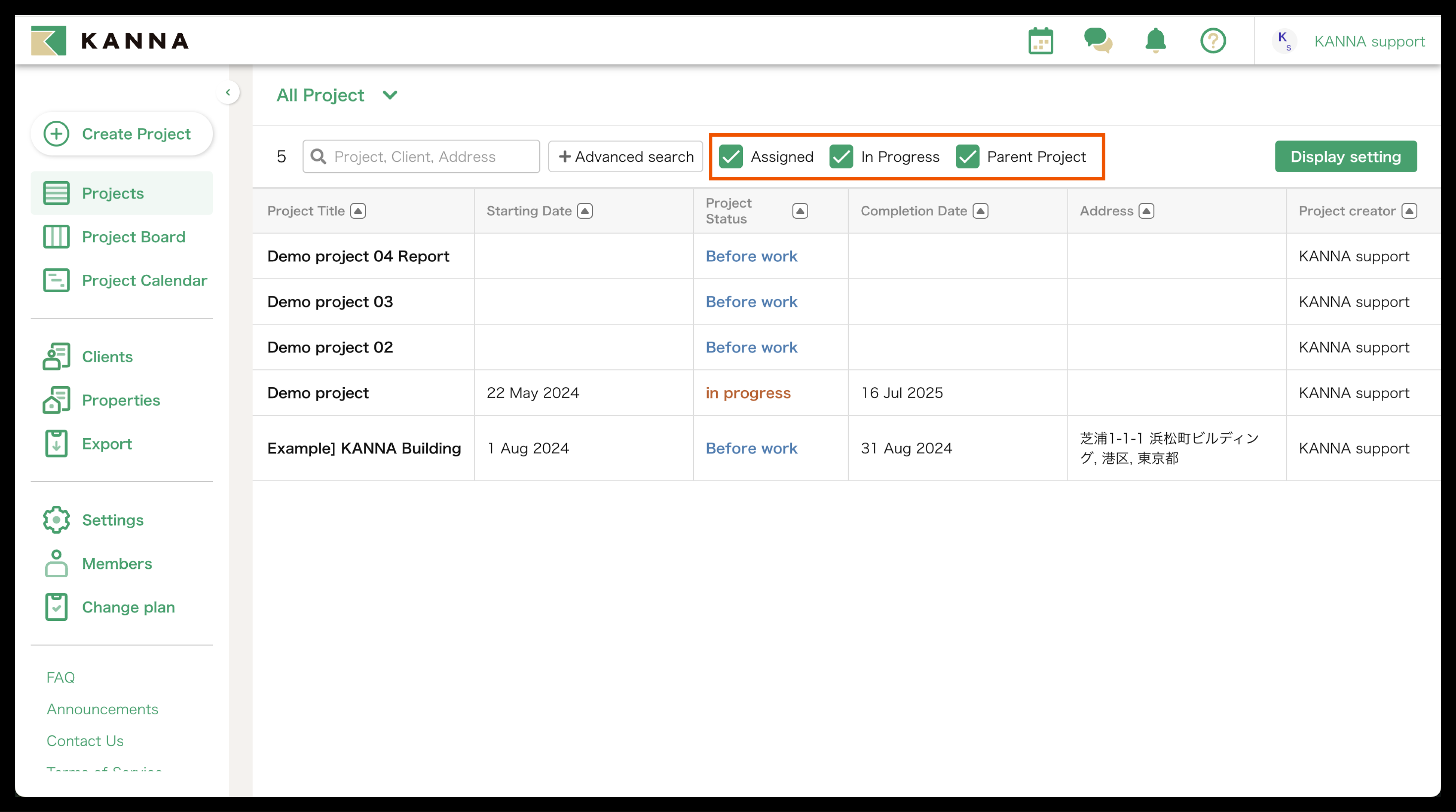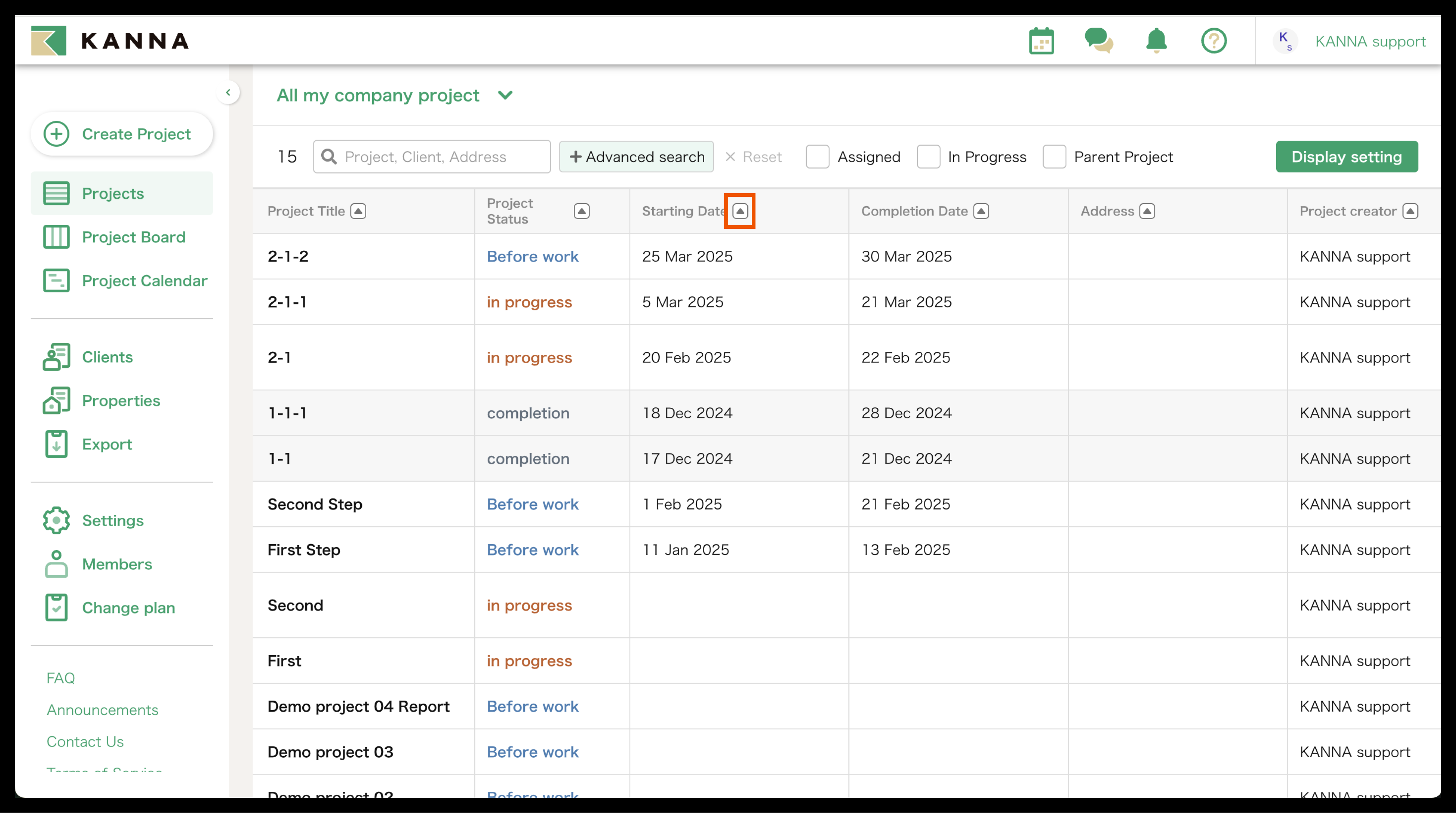 Selain nama proyek, informasi seperti tanggal mulai, tanggal selesai, alamat, dan tanggal pemesanan juga dapat ditampilkan di Proyek. Item yang ditampilkan dapat disesuaikan dan diubah untuk setiap akun. Anda dapat menampilkan hanya proyek yang Anda tangani atau yang belum selesai, atau mencari berdasarkan nama proyek, nama klien, atau alamat situs.