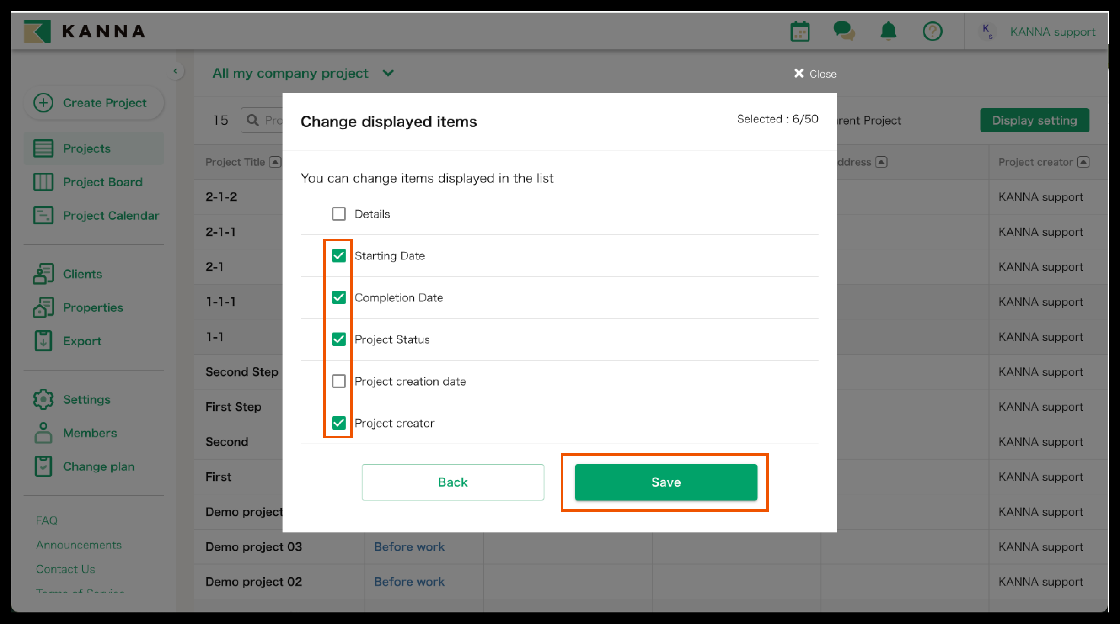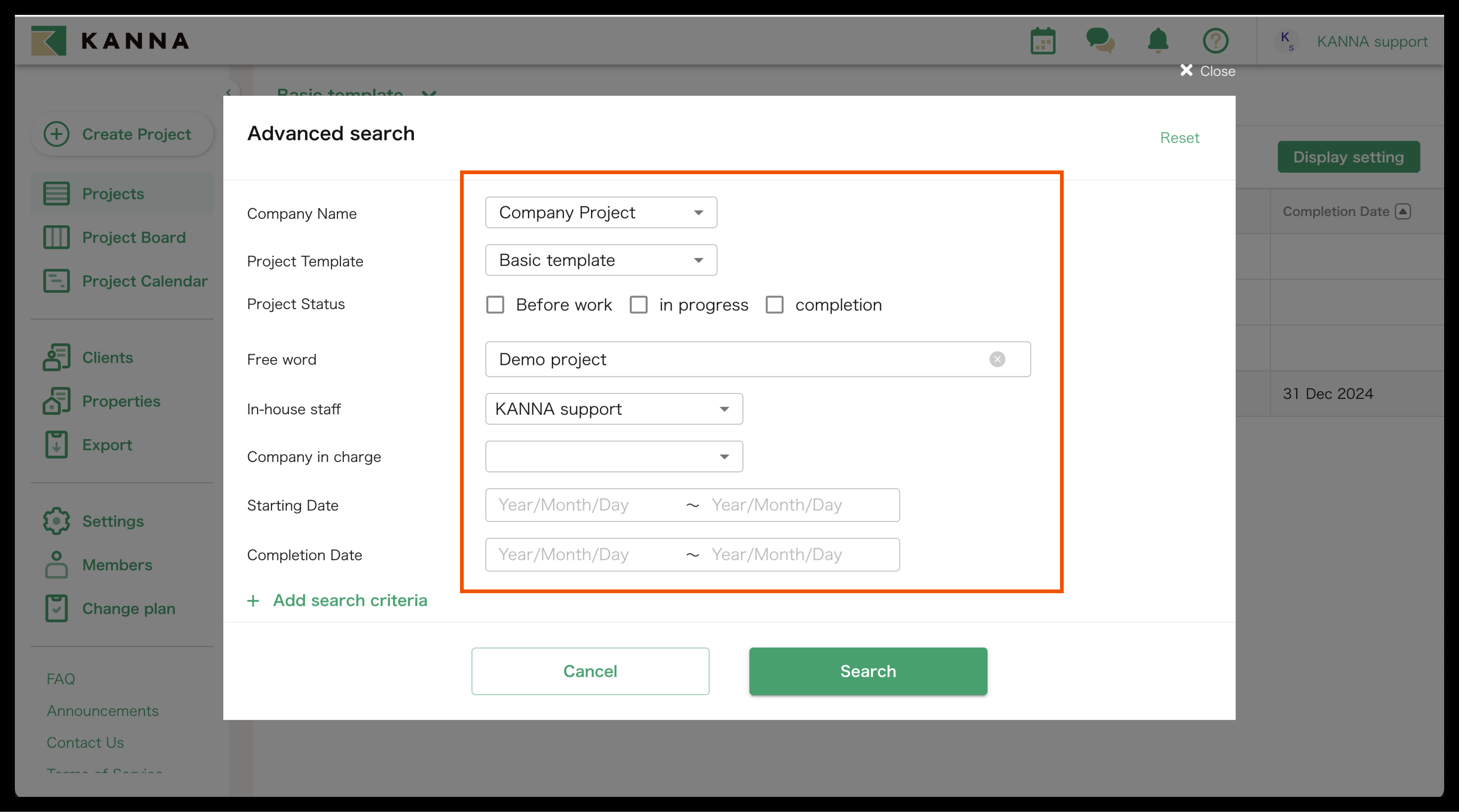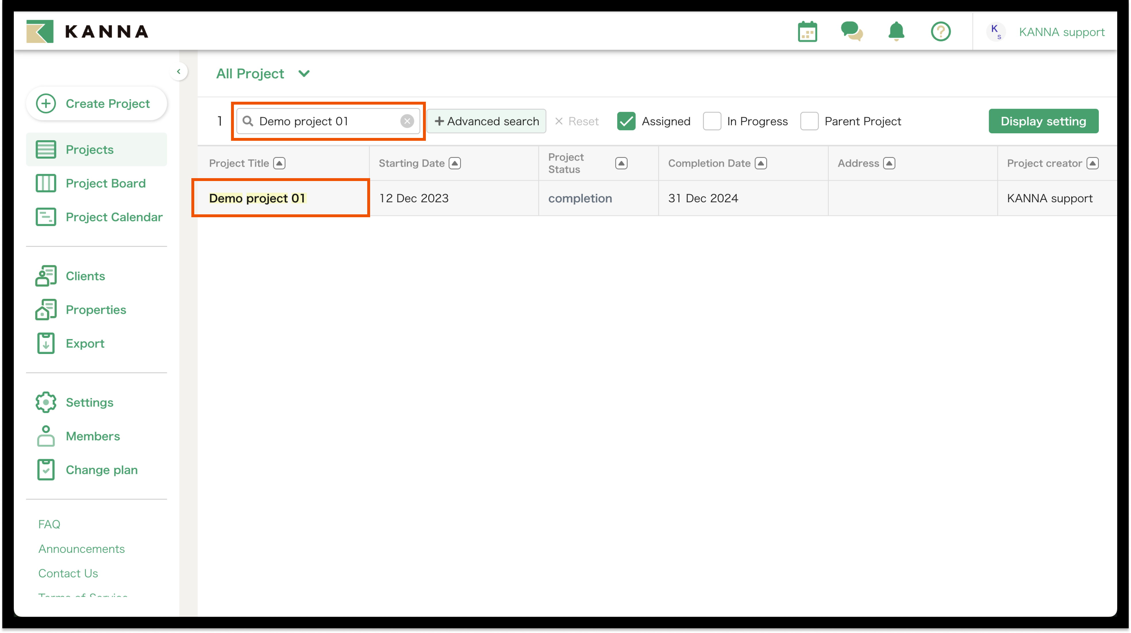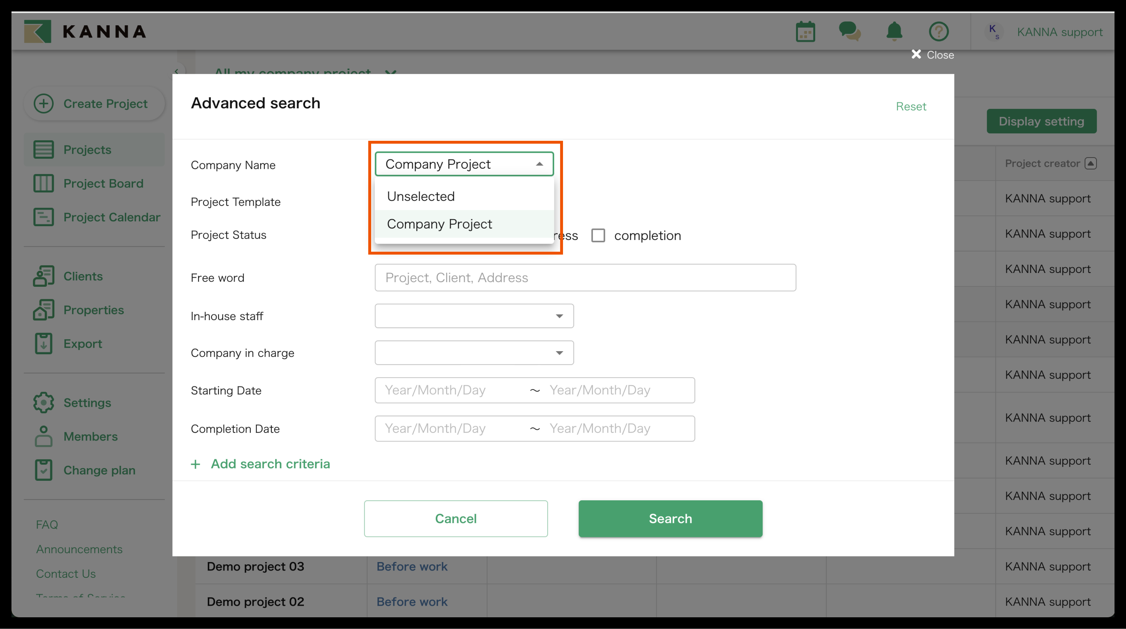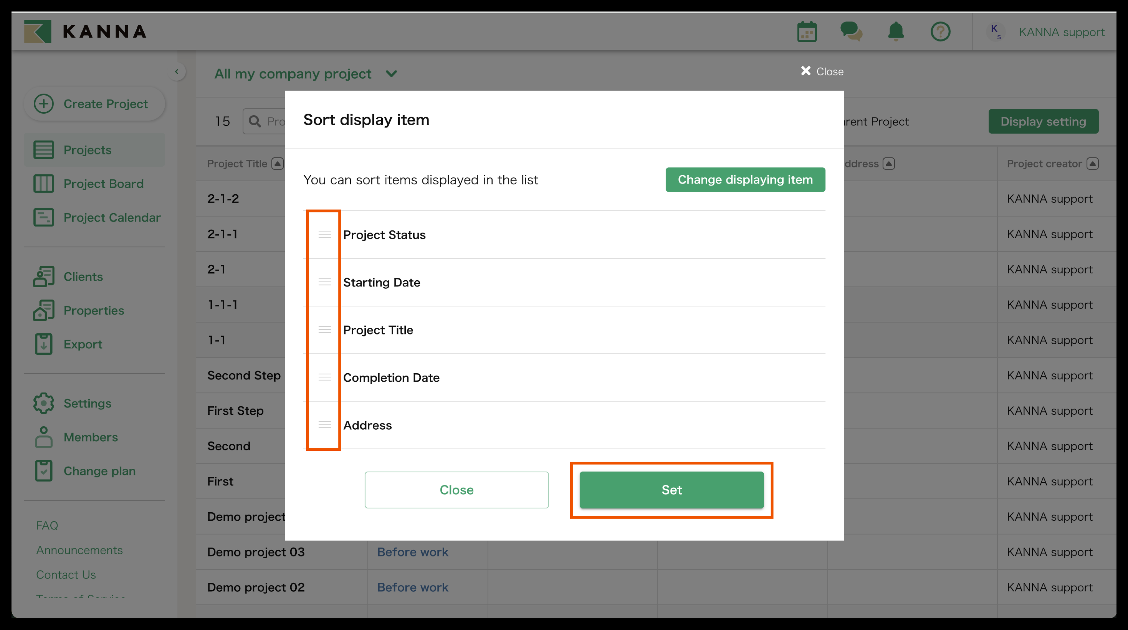 Selain nama proyek, informasi seperti tanggal mulai, tanggal selesai, alamat, dan tanggal pemesanan juga dapat ditampilkan di Proyek. Item yang ditampilkan dapat disesuaikan dan diubah untuk setiap akun. Anda dapat menampilkan hanya proyek yang Anda tangani atau yang belum selesai, atau mencari berdasarkan nama proyek, nama klien, atau alamat situs.