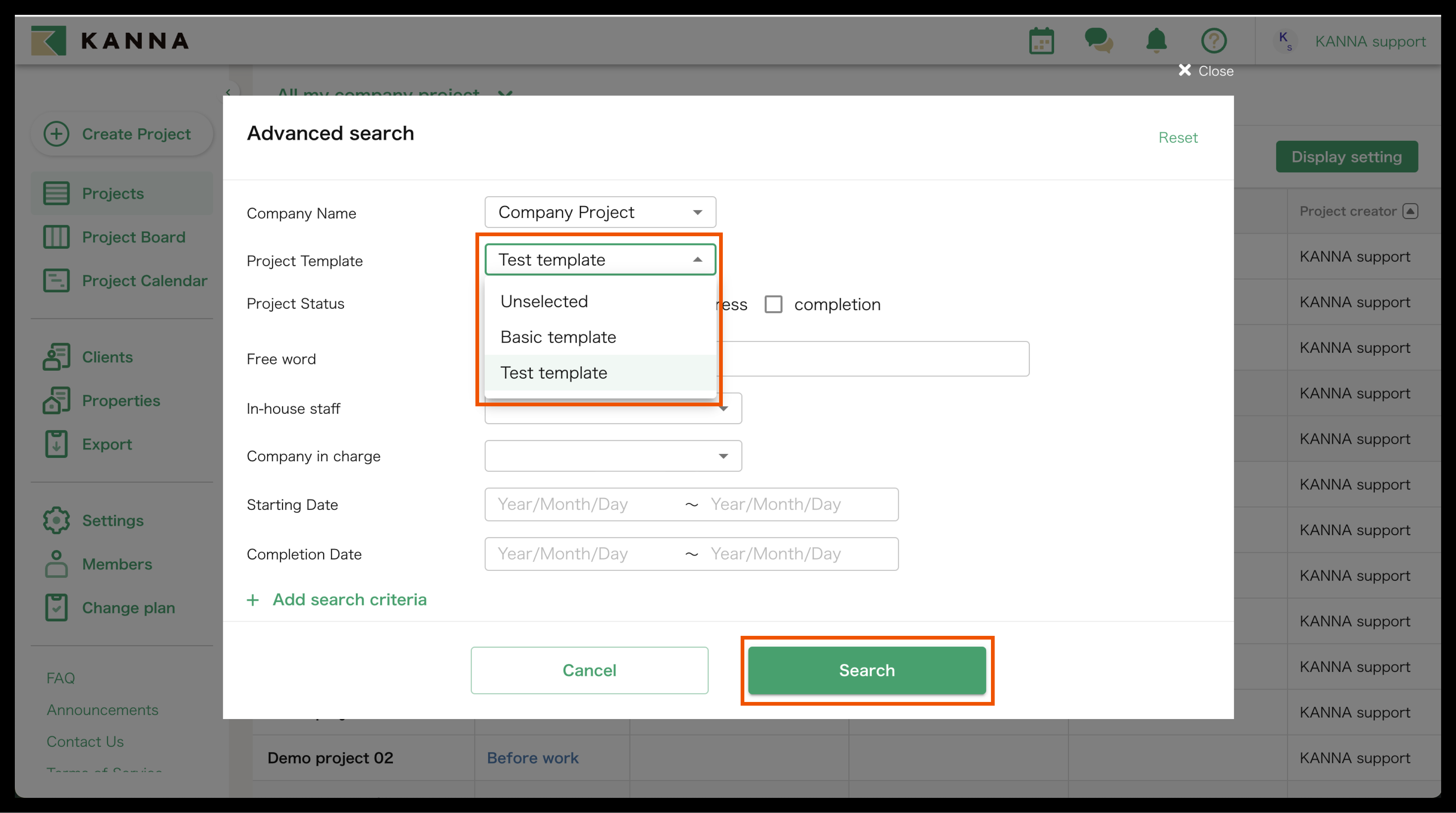 Anda juga dapat mencari berdasarkan template proyek dari perusahaan lain, memungkinkan Anda untuk mencari proyek spesifik di antara proyek-proyek yang telah ditambahkan ke perusahaan lain.