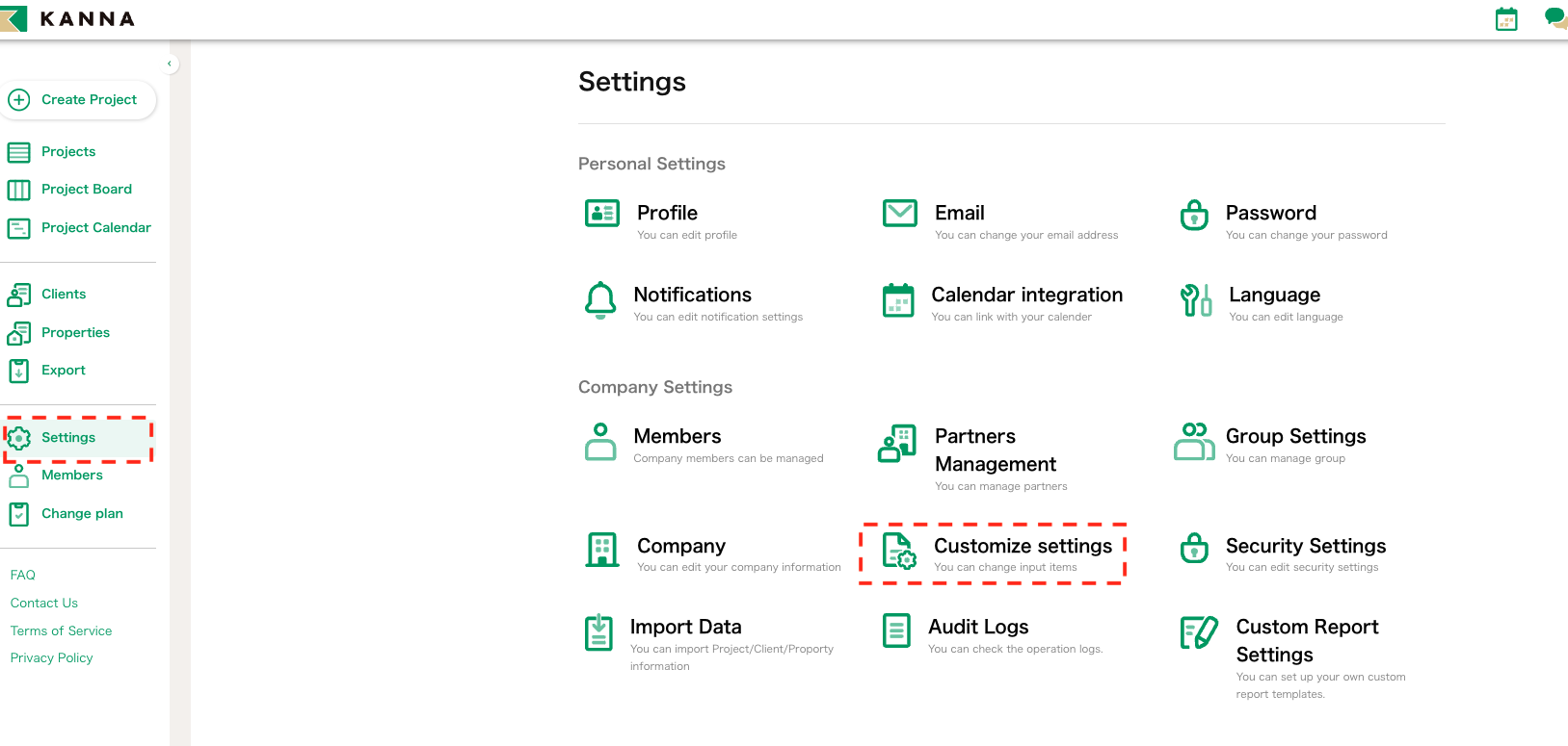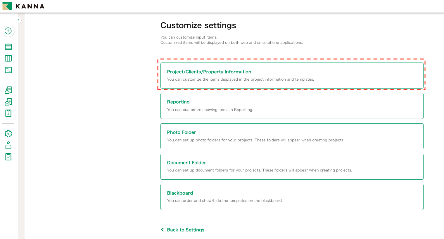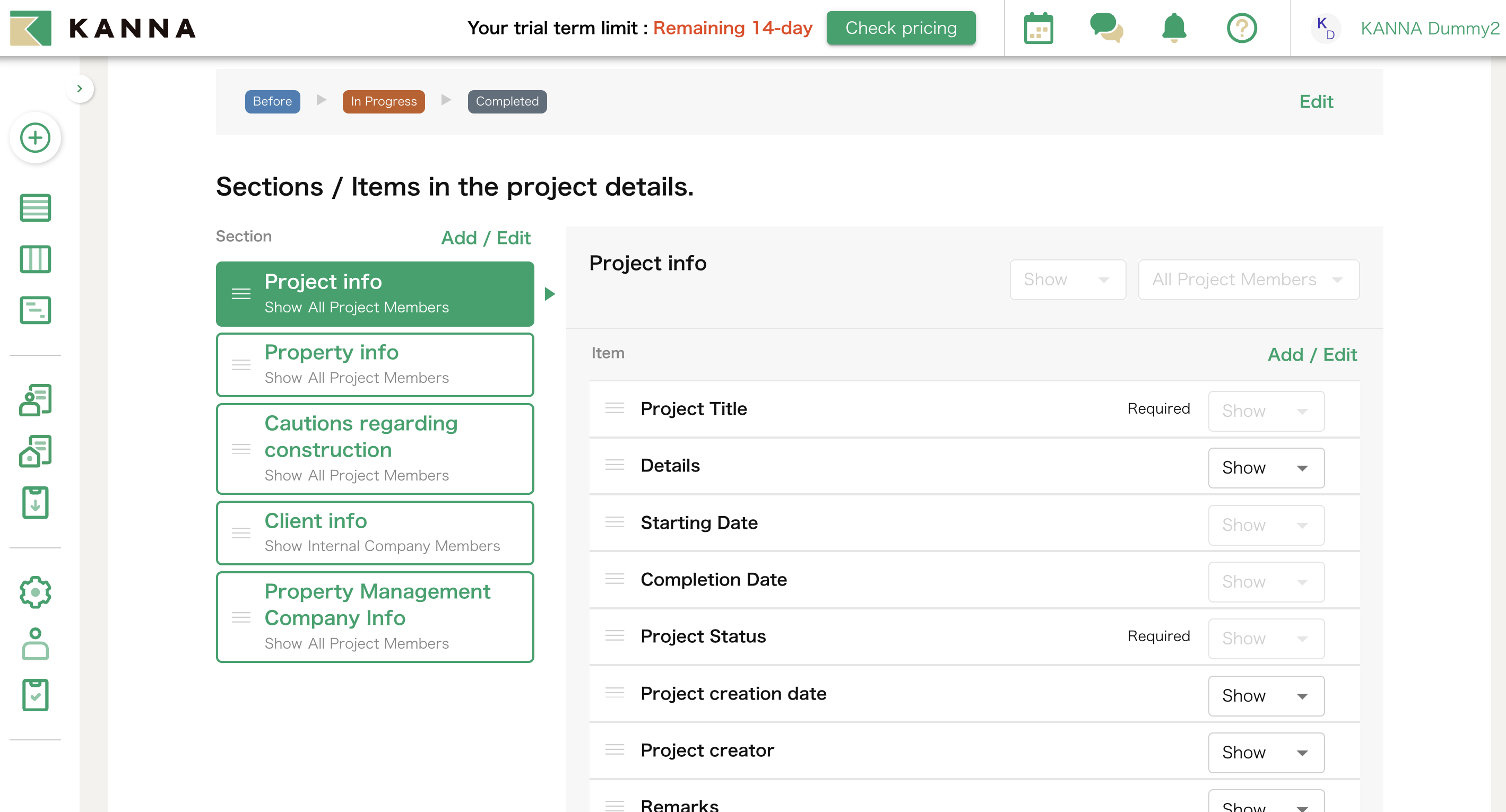 Dalam pengaturan informasi master, Anda dapat mengatur tampilan item yang sudah ada serta menambah/menghapus item baru yang terkait dengan proyek/pelanggan/properti.
