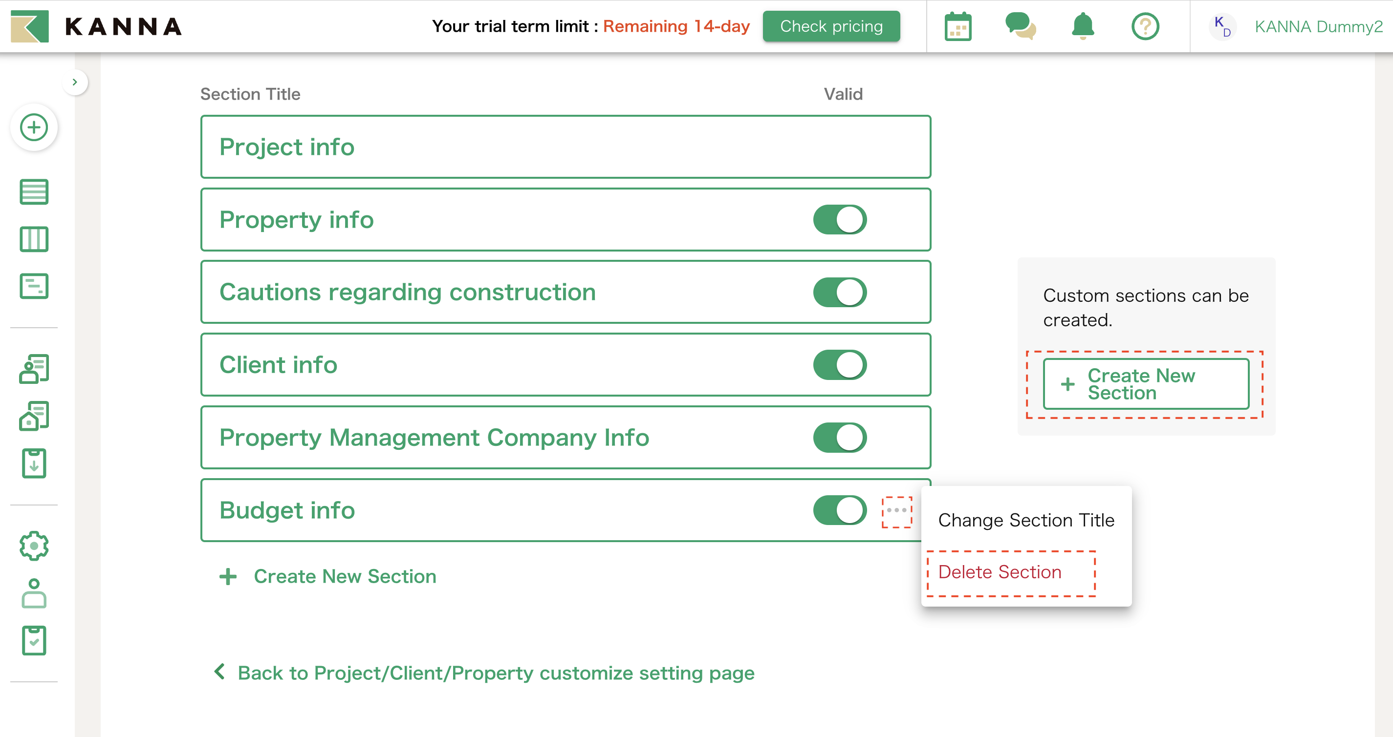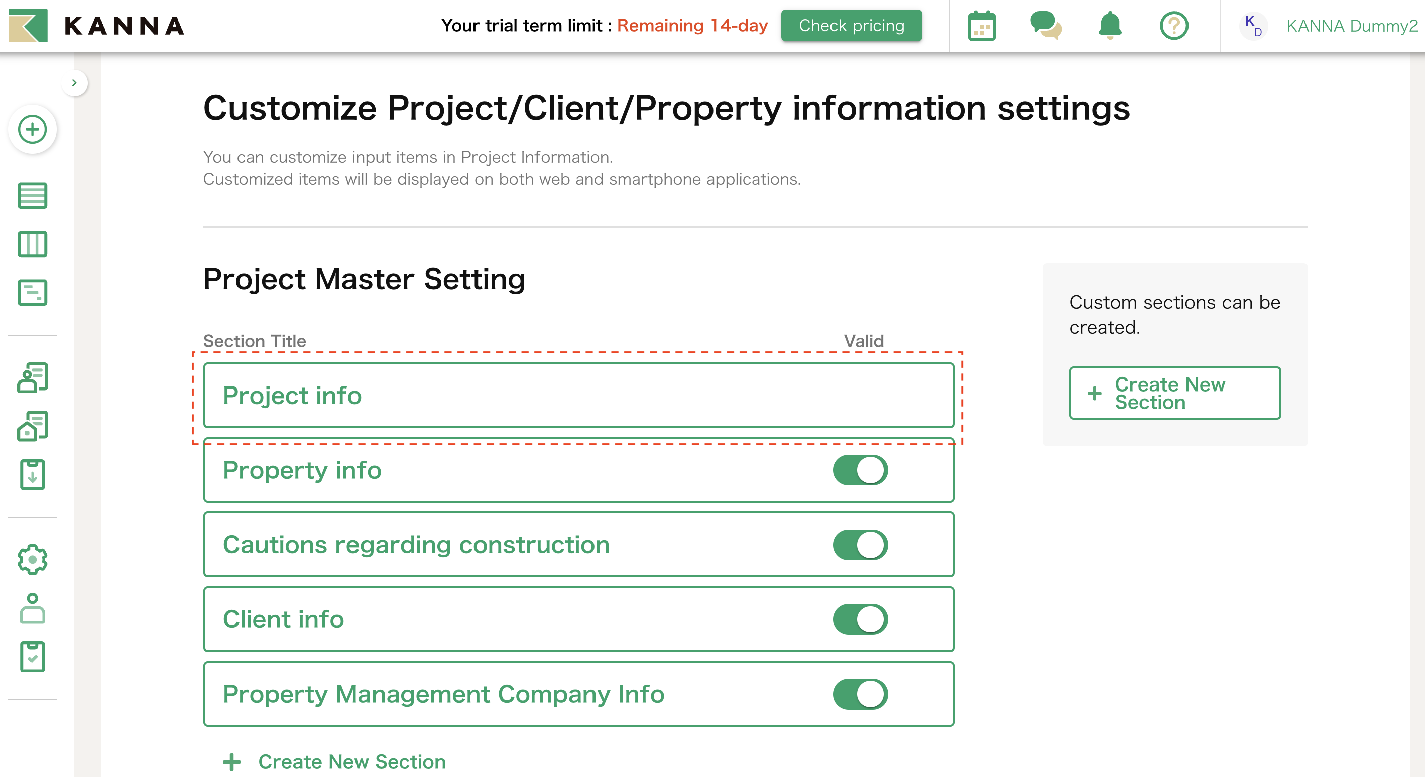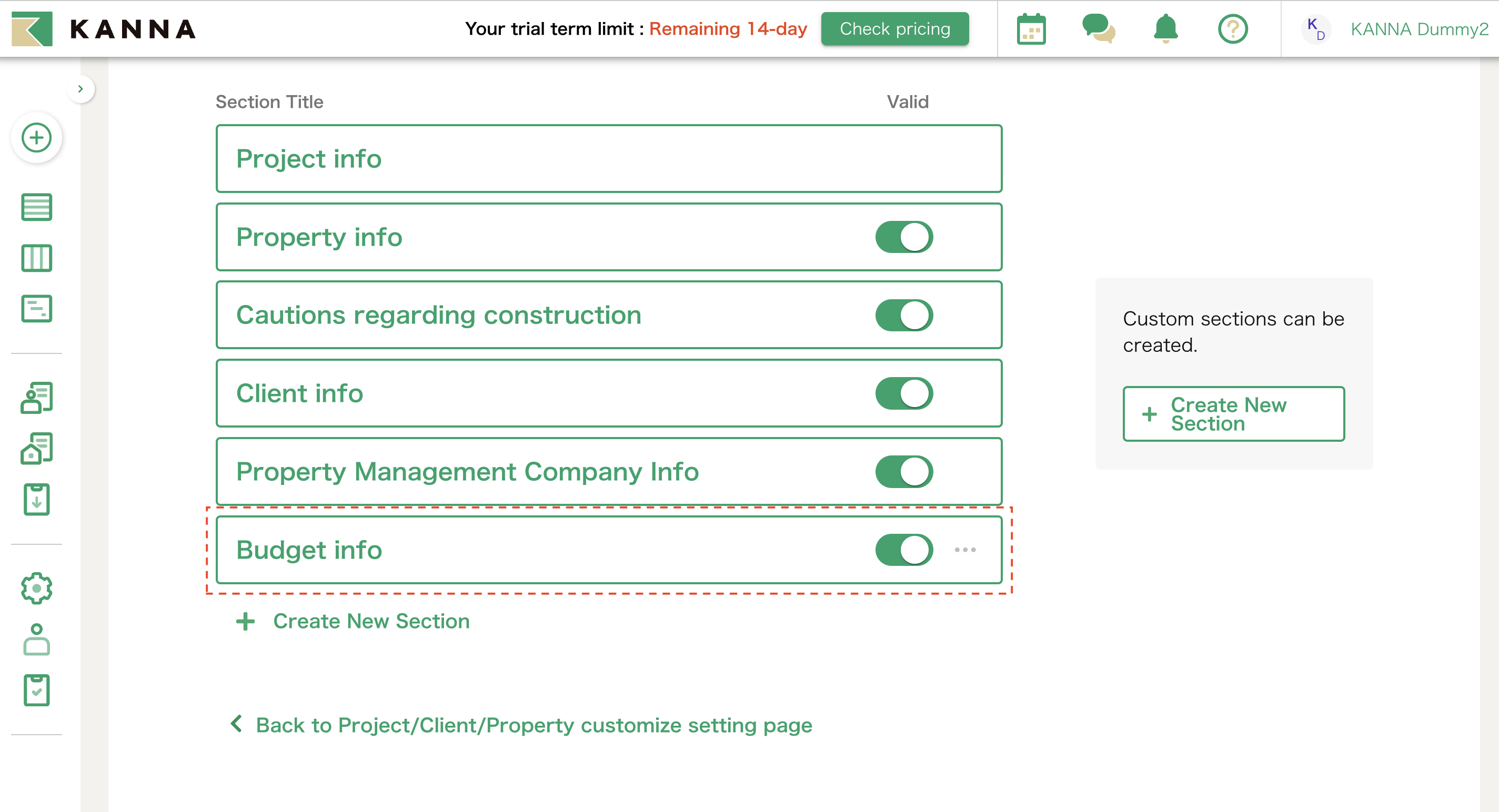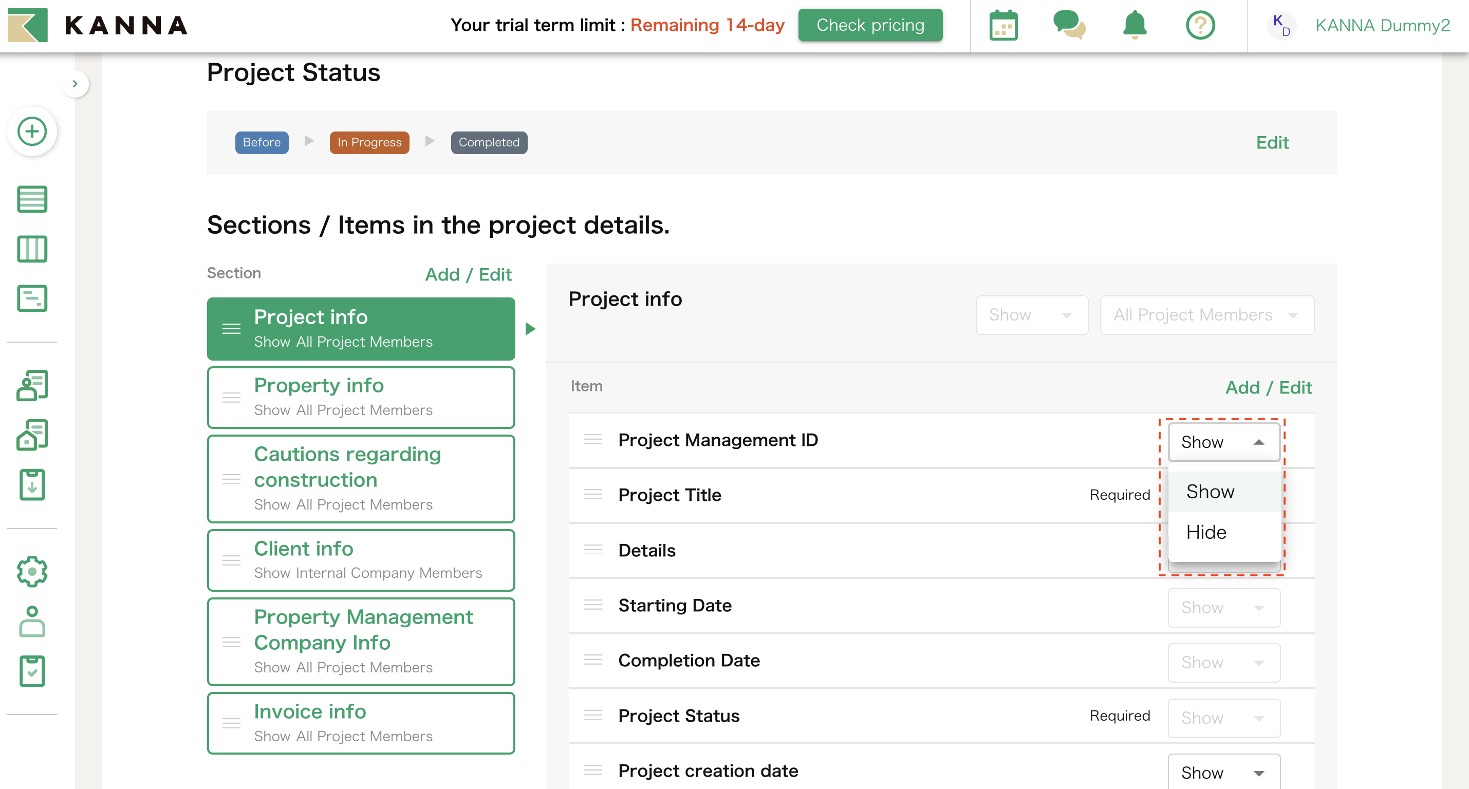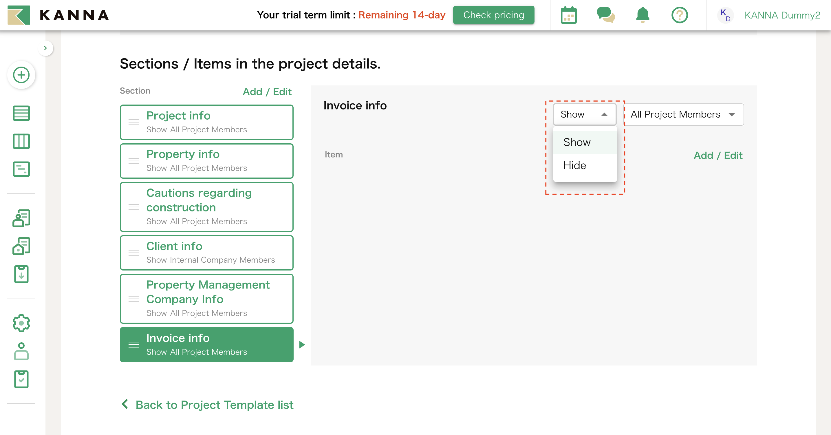 Saat Anda membuat item baru dari "Buat Bagian Baru" di pengaturan master proyek, item baru tersebut akan muncul dalam keadaan tersembunyi di semua template proyek. Jika Anda ingin menggunakan item baru tersebut, klik nama item dan ubah dari "Sembunyikan" menjadi "Tampilkan" di pojok kanan atas.
