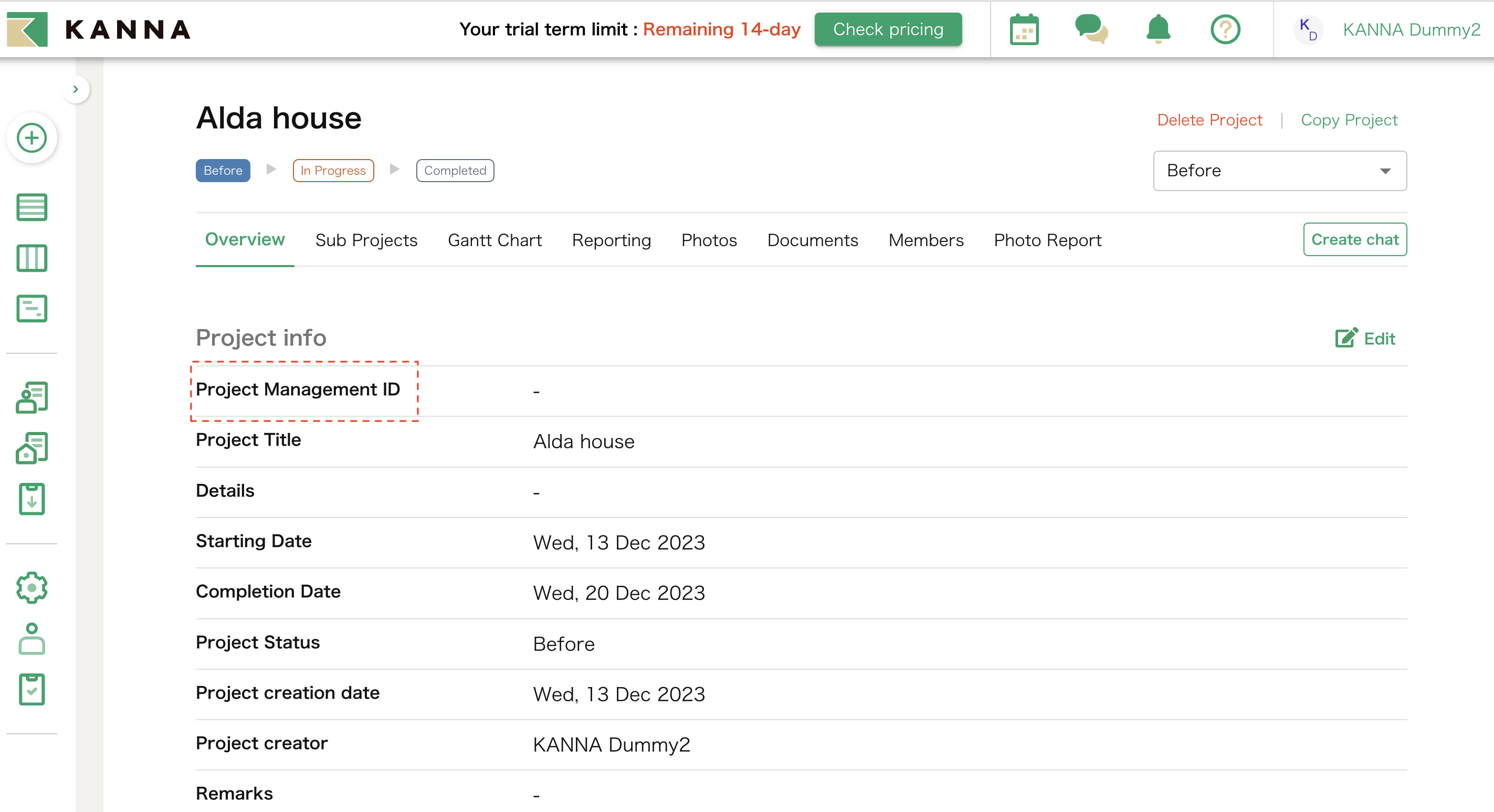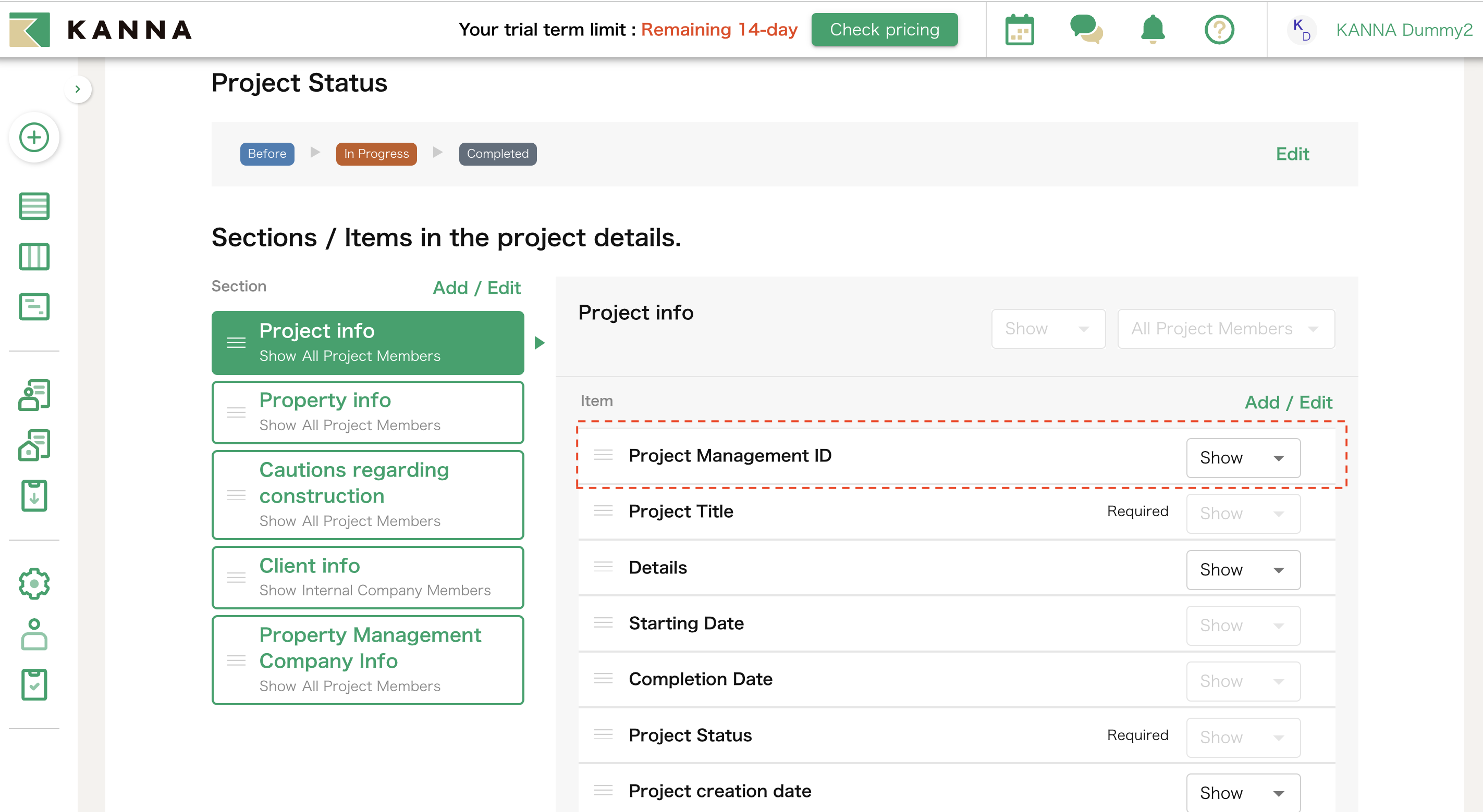 Dalam contoh ini, kami menjelaskan cara menyembunyikan "ID Manajemen Proyek" di pengaturan informasi master.