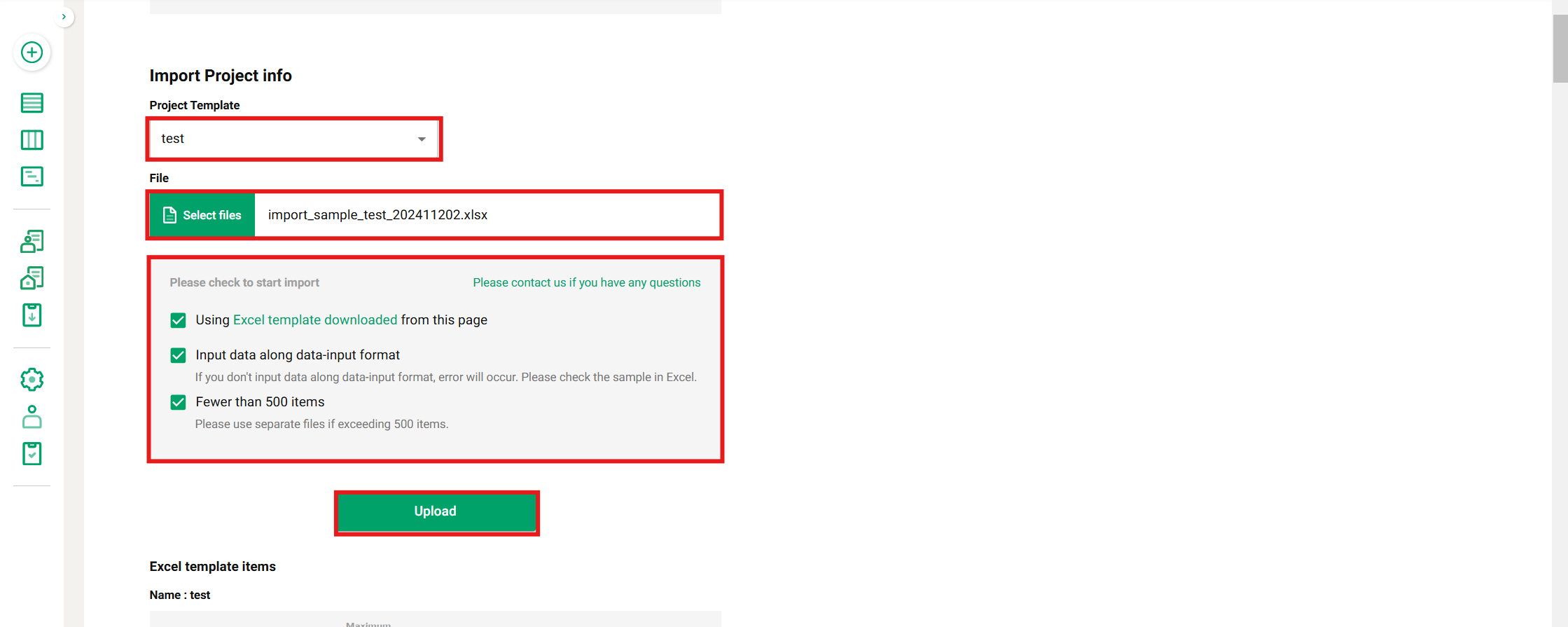 5. Pilih jenis template proyek dan file yang telah disimpan. Setelah memeriksa item konfirmasi, klik Unggah.