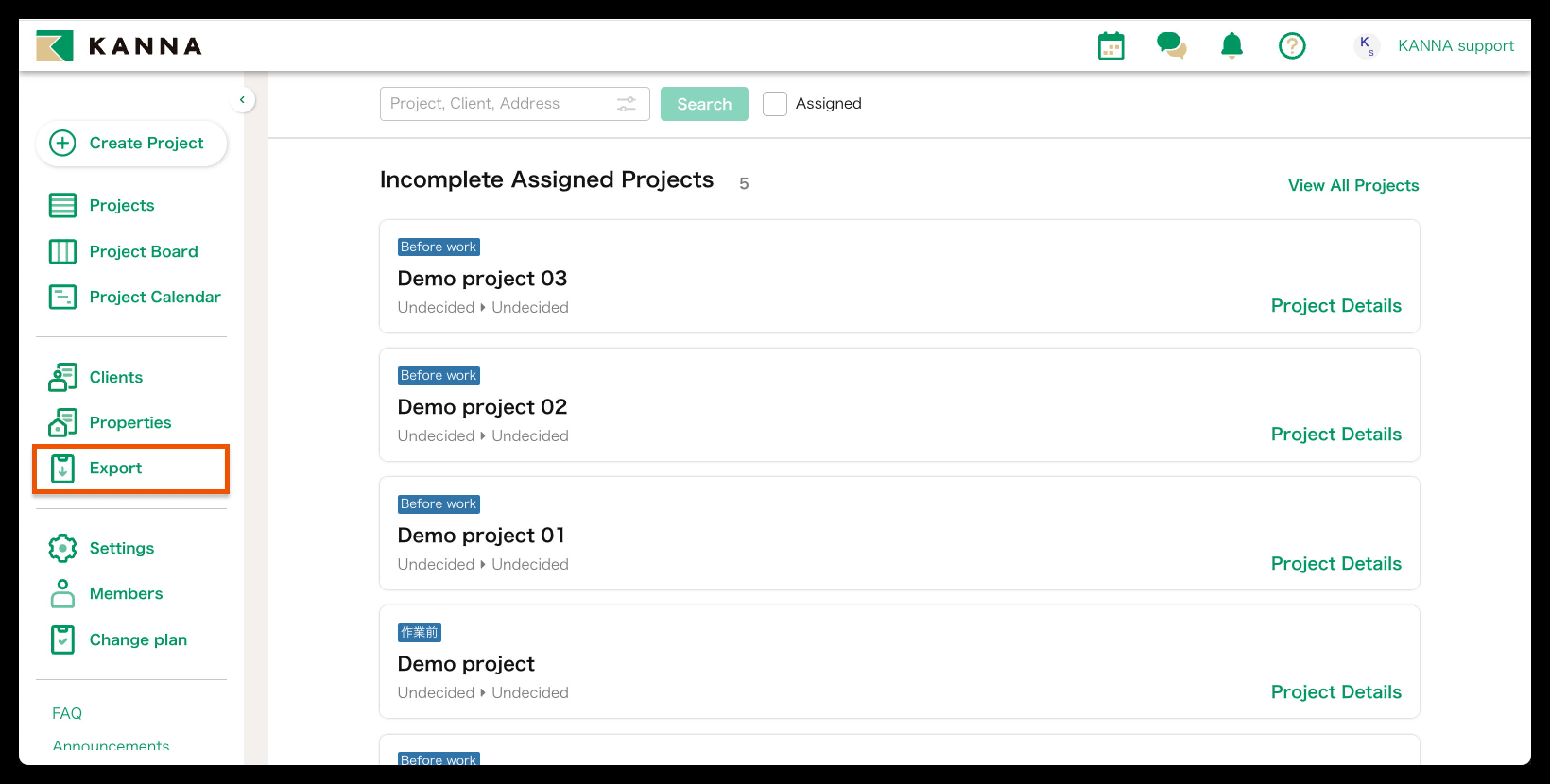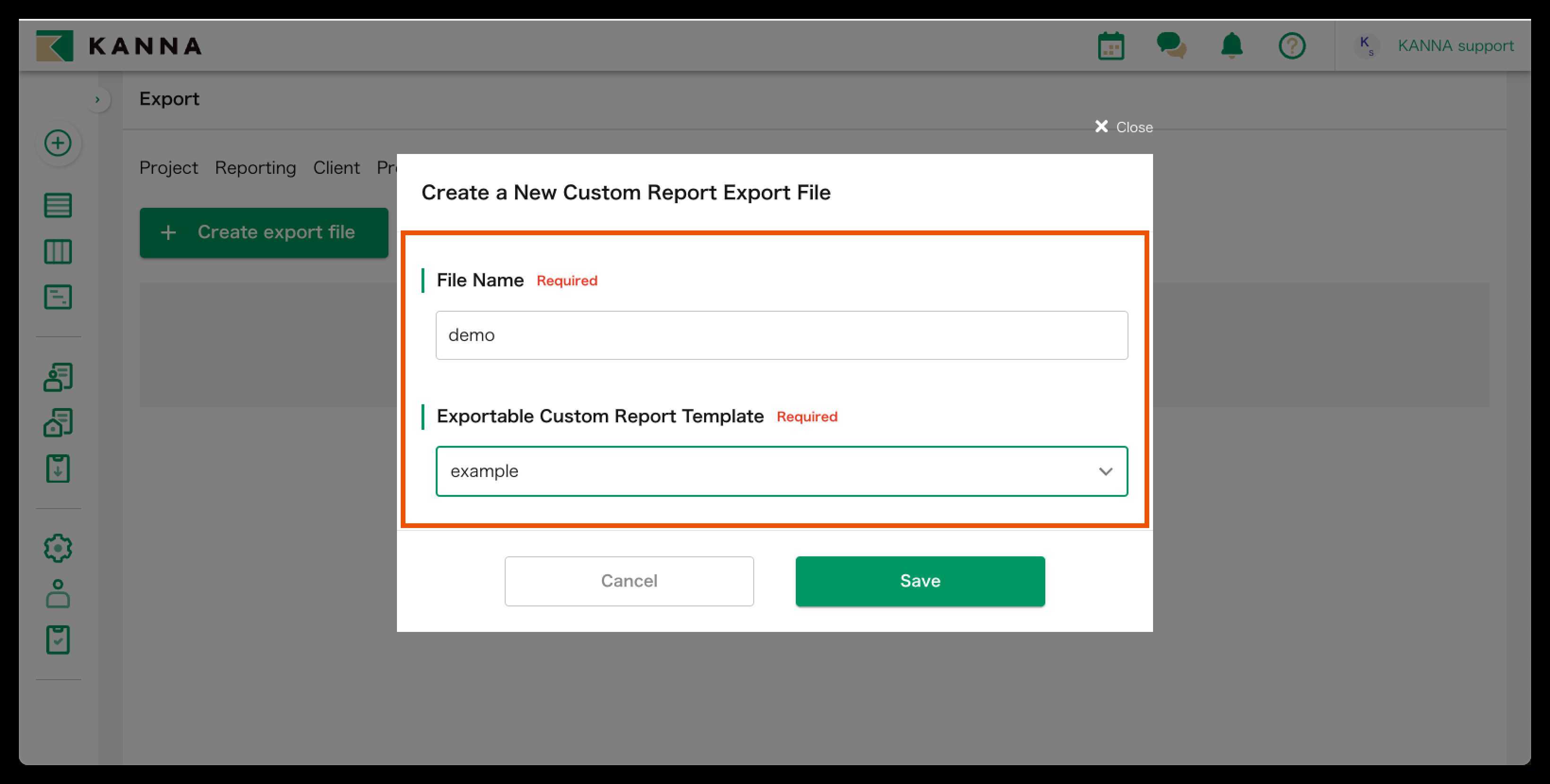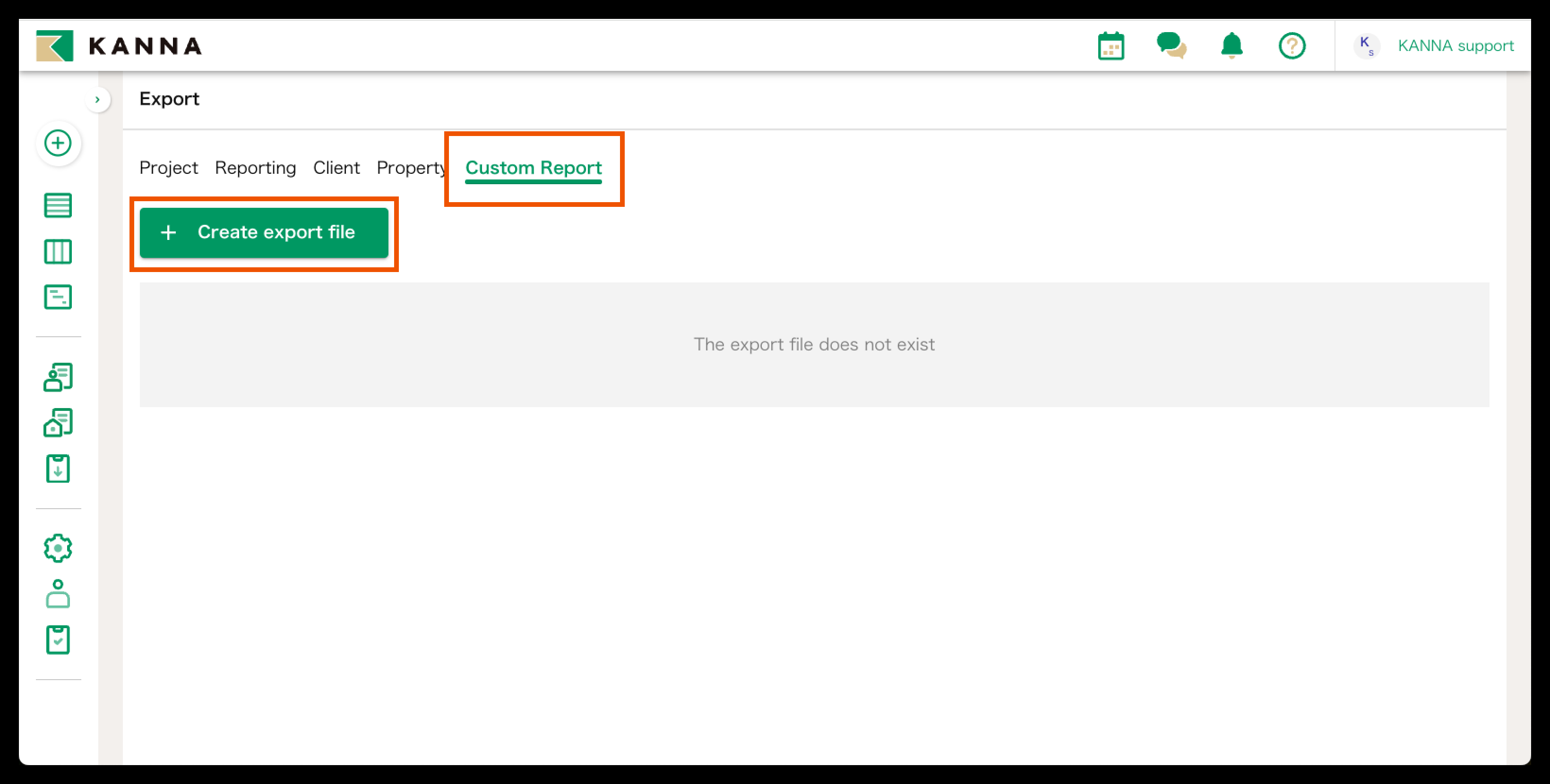 Catatan: Jika Anda belum berlangganan opsi [Ekspor] di KANNA Project, hanya tab Laporan Kustom yang akan ditampilkan. Klik pada “+Buat file ekspor”.