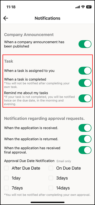Anda dapat mengatur notifikasi tugas dari layar Pengaturan Notifikasi.
