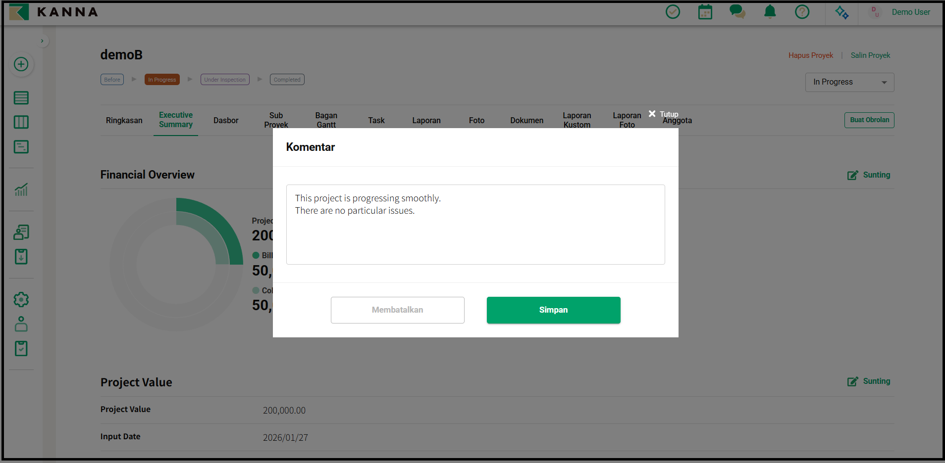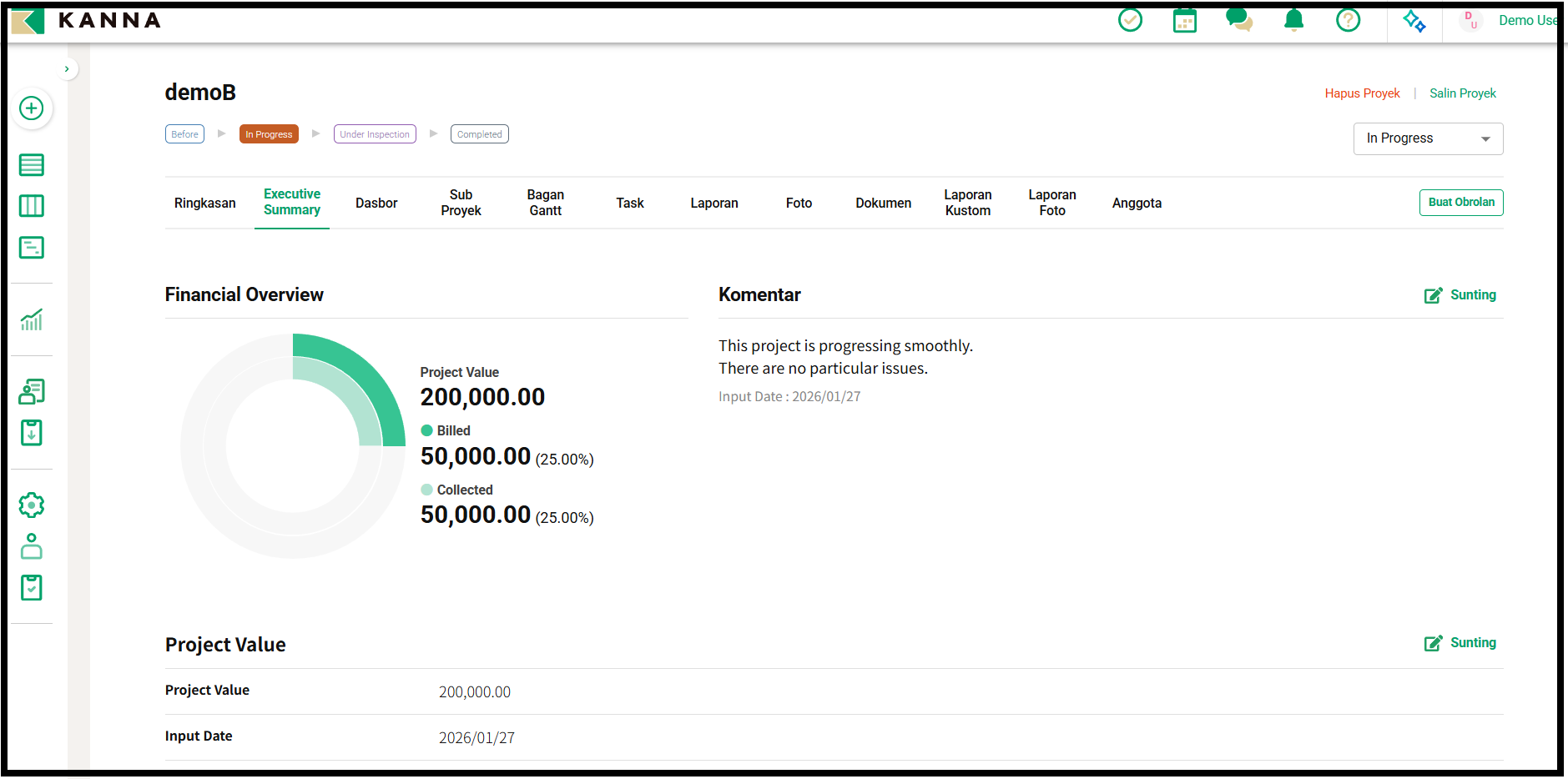 Menampilkan grafik yang menunjukkan Project Value (Nilai Proyek), status billed (ditagih), dan collected (diterima) yang terdaftar di Ringkasan Eksekutif.