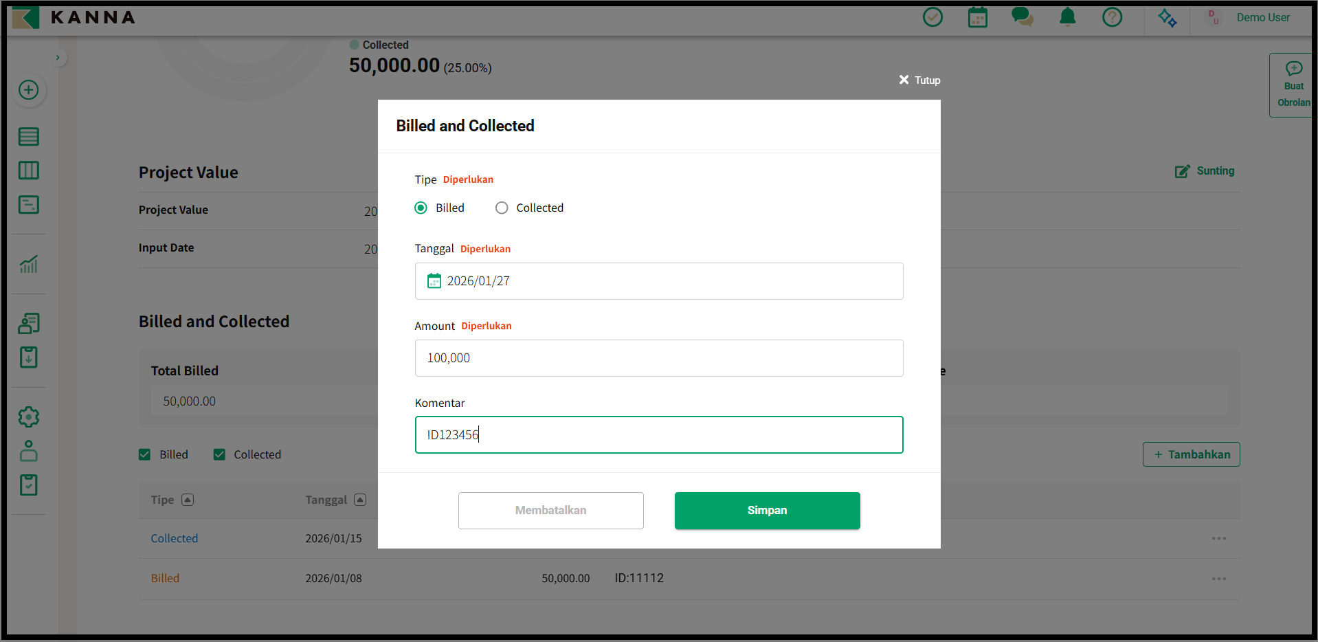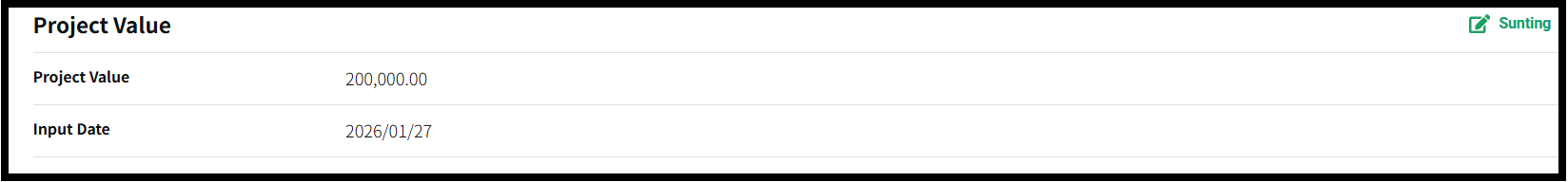 Anda dapat mendaftarkan jumlah untuk proyek tersebut. Saat mendaftar, tanggal input akan dicatat secara otomatis bersama dengan jumlahnya. Jika jumlah sudah terdaftar, memasukkan jumlah baru akan menimpa jumlah yang sudah ada. Perlu diketahui bahwa informasi yang terdaftar di sini akan dikumpulkan dan ditampilkan di Dasbor Perusahaan.