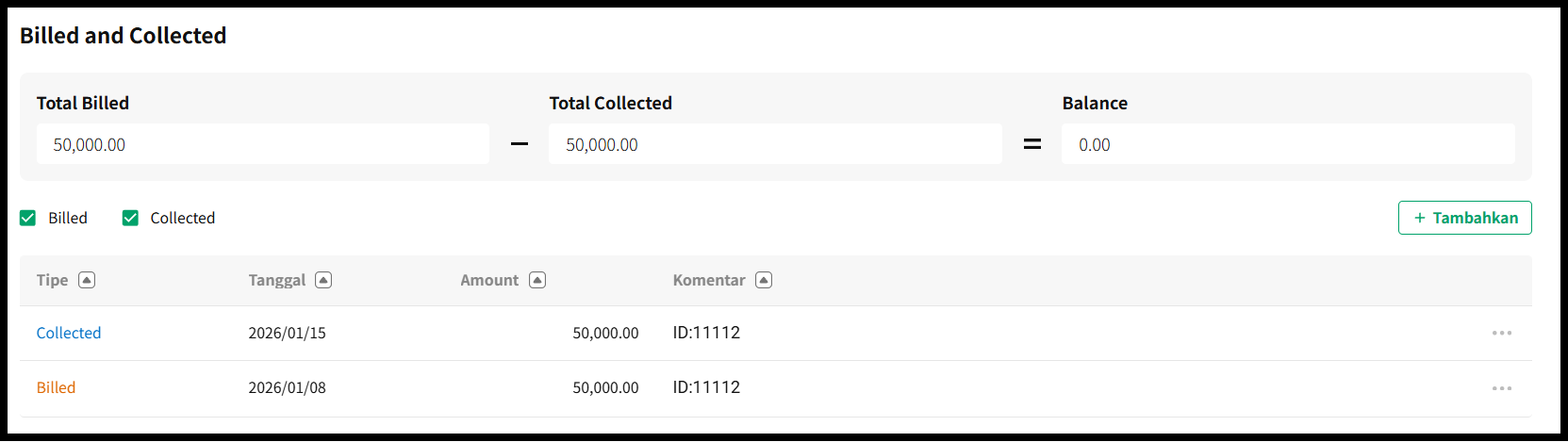 | Type | Tentukan "Billed" (Ditagih) atau "Collected" (Diterima). |