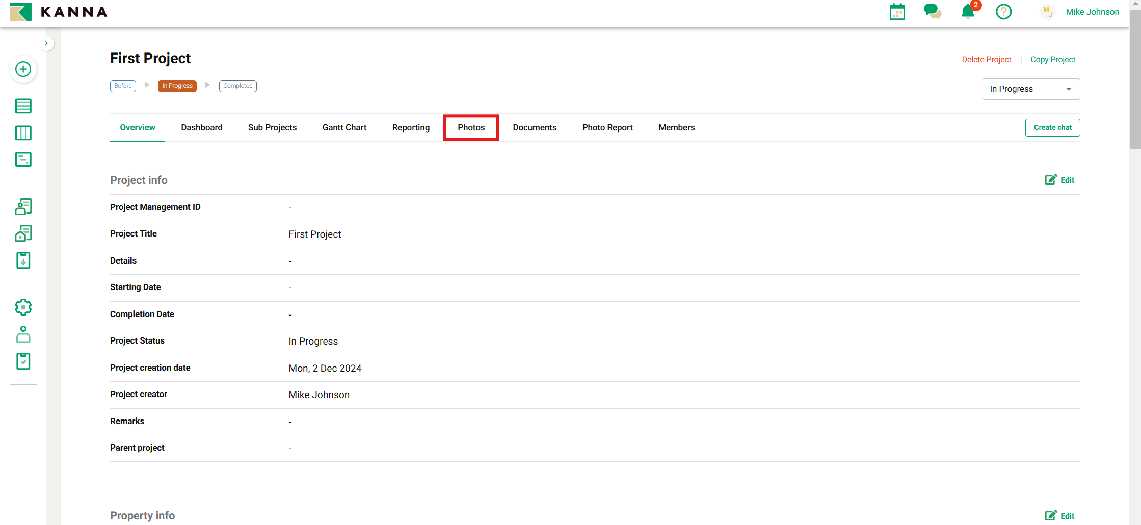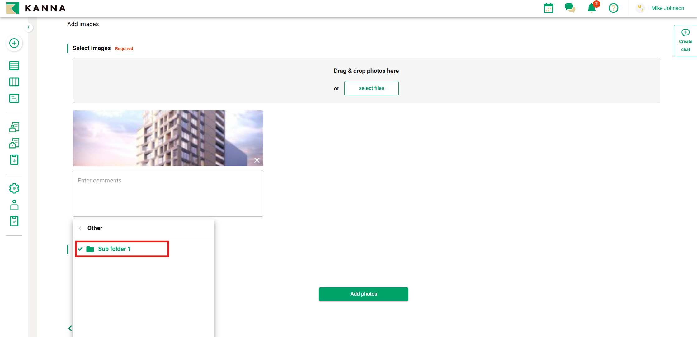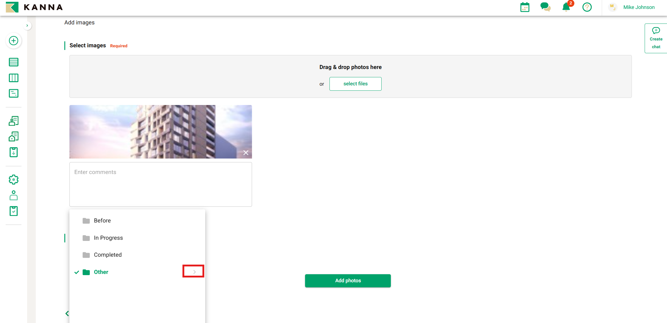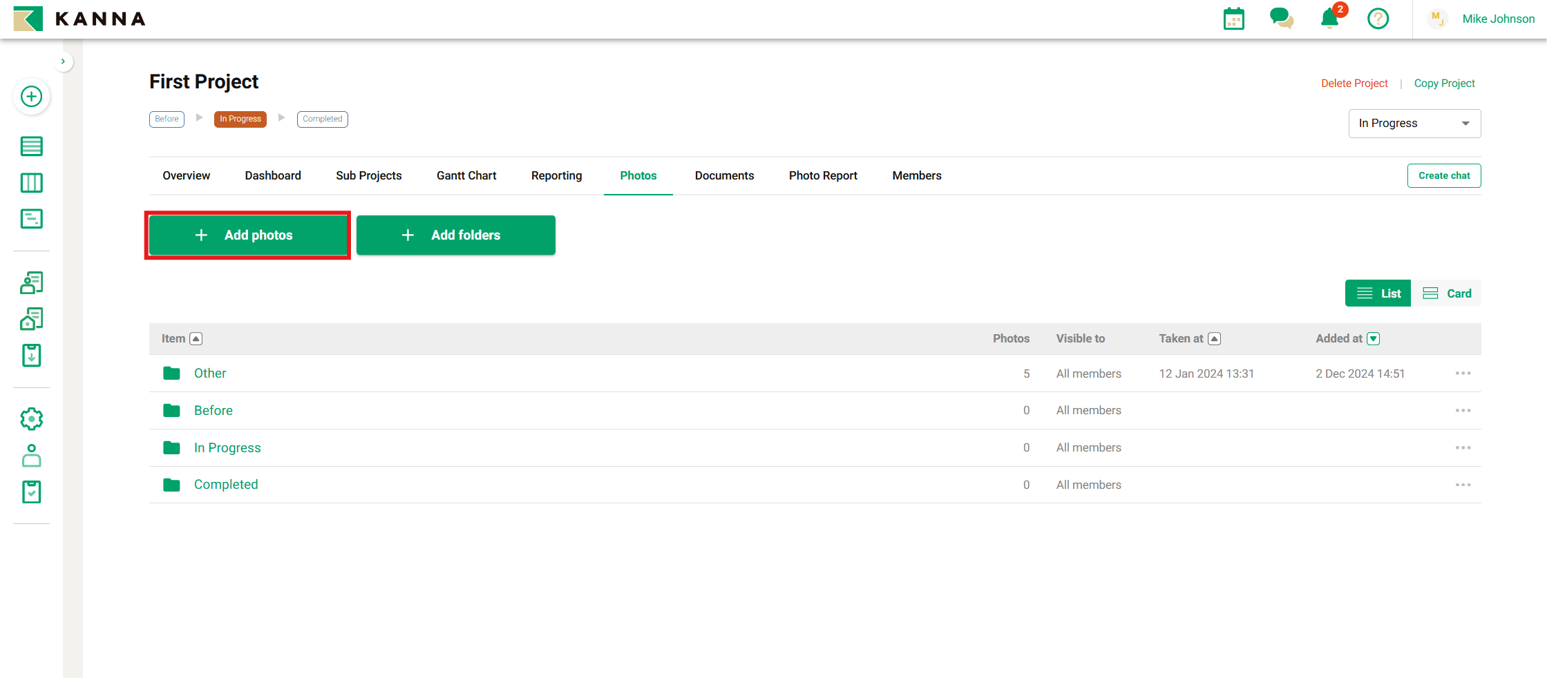 KANNA memungkinkan Anda untuk berbagi informasi dengan mengunggah foto untuk setiap proyek. Dengan berbagi foto yang diambil di lokasi, Anda dapat langsung membagikannya dengan anggota tim yang terlibat dalam proyek. Versi aplikasi mobile memungkinkan Anda mengunggah hingga 100 foto sekaligus, sementara versi PC memungkinkan hingga 30 foto dalam sekali unggah.